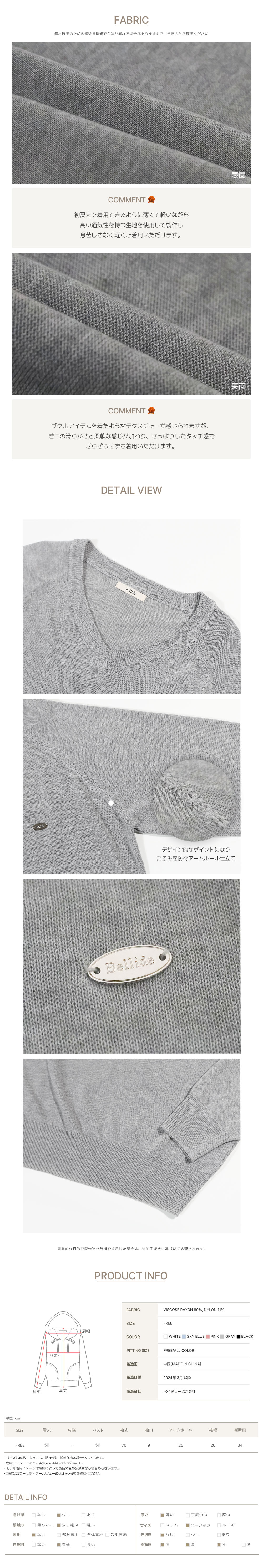 伸縮性 普通 / 肌触り 普通 / 春、夏、秋の用