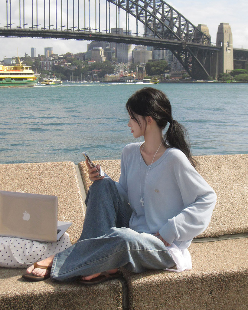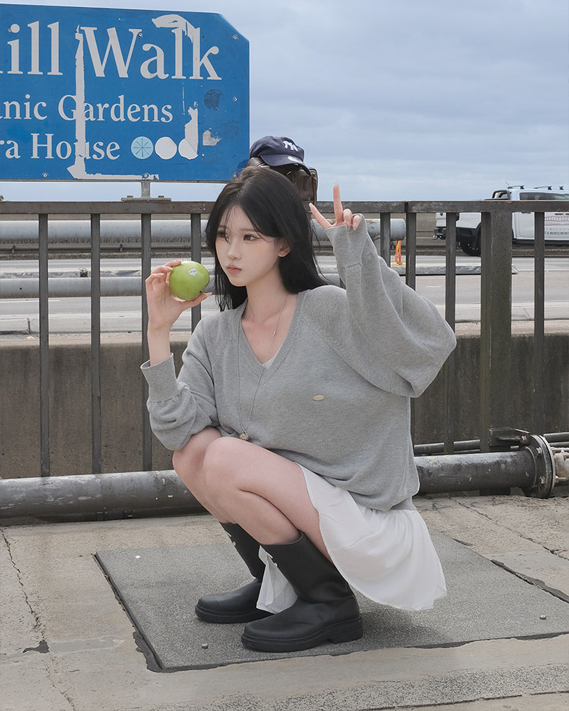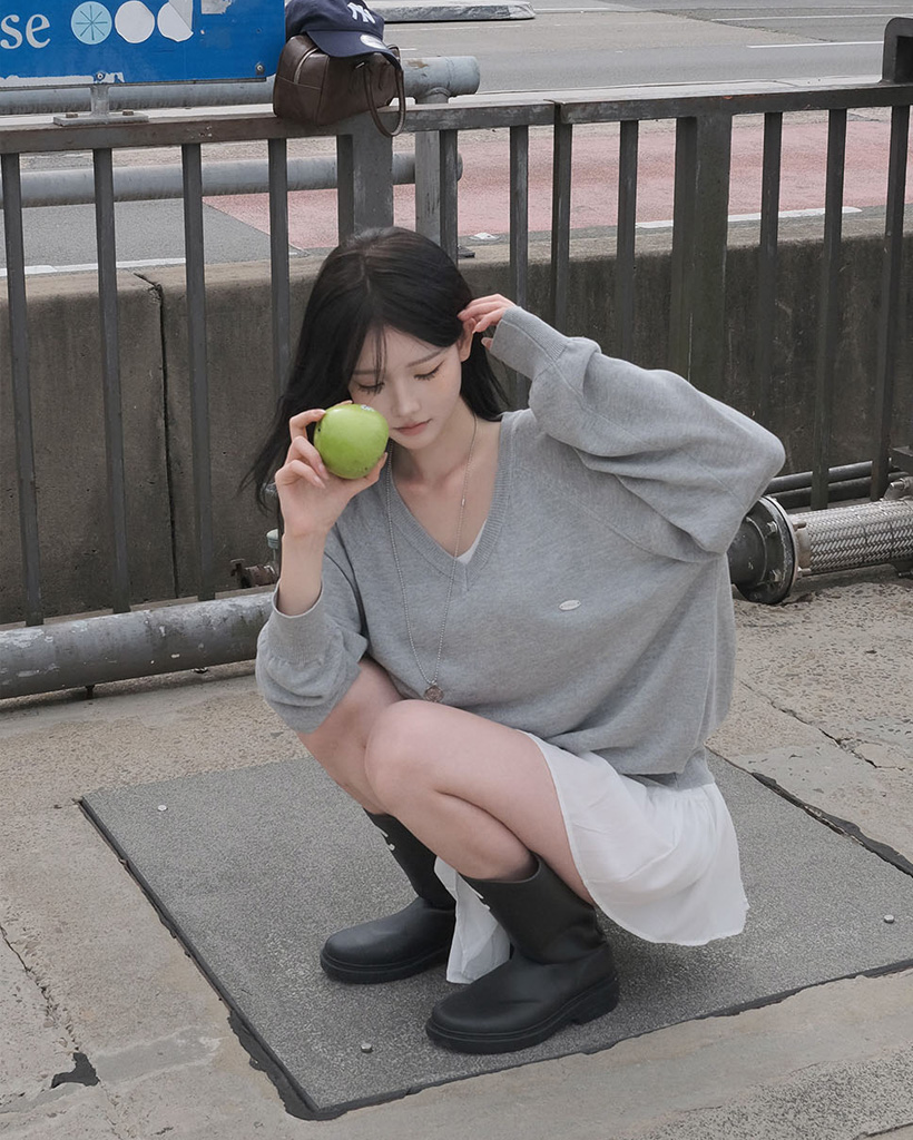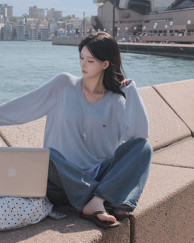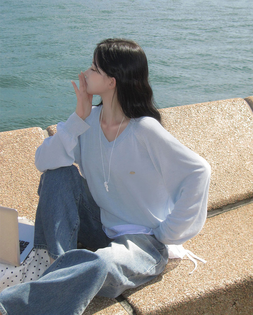 ルーズなフィットにVネックラインが加わって鎖骨がほのかに見え