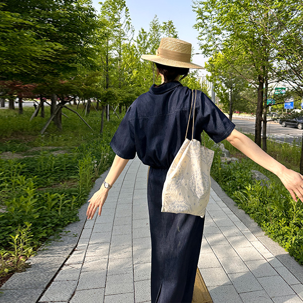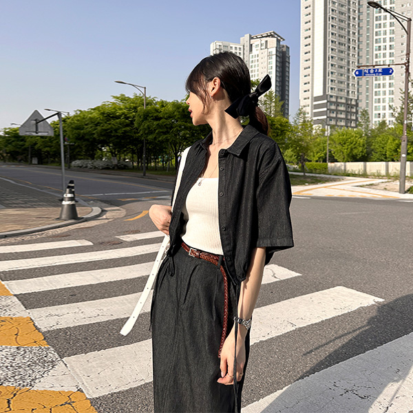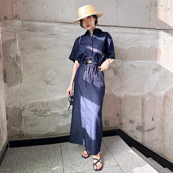 半袖クロップドデニムブラウス&デニムロングスカート2ピースセット