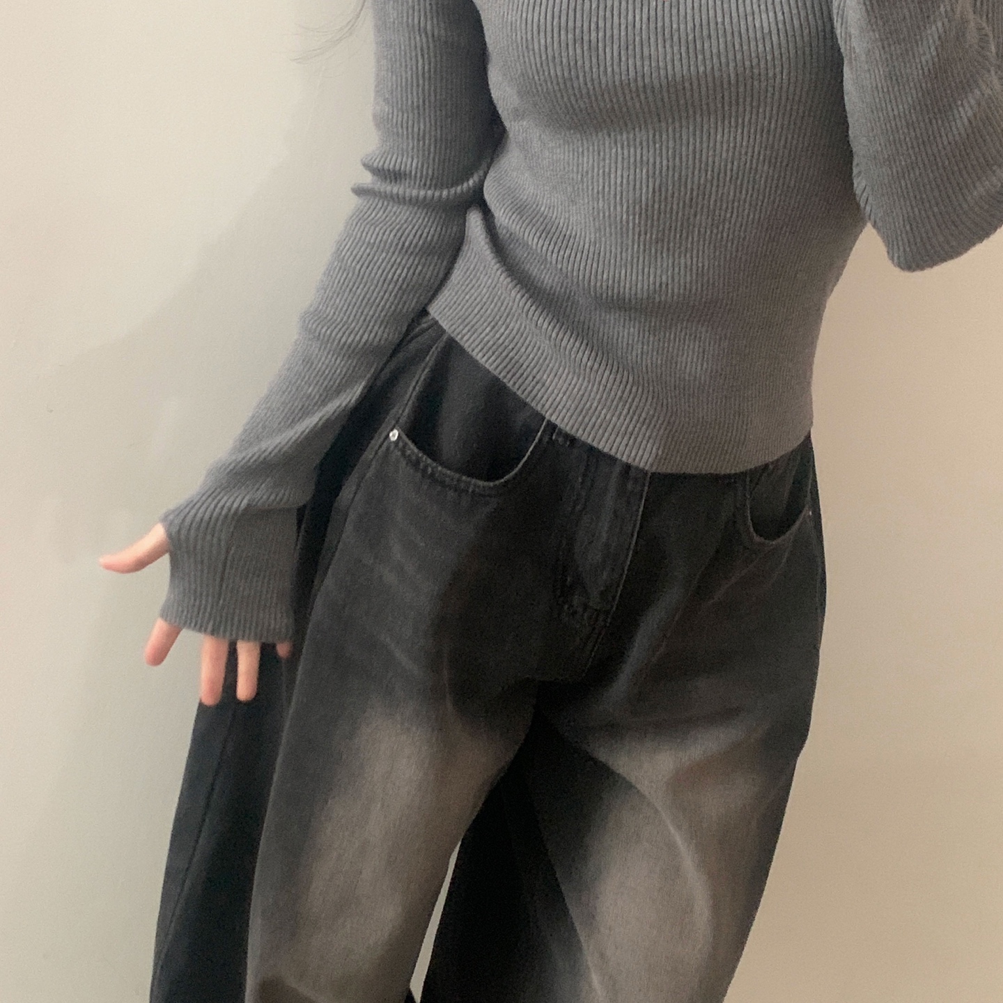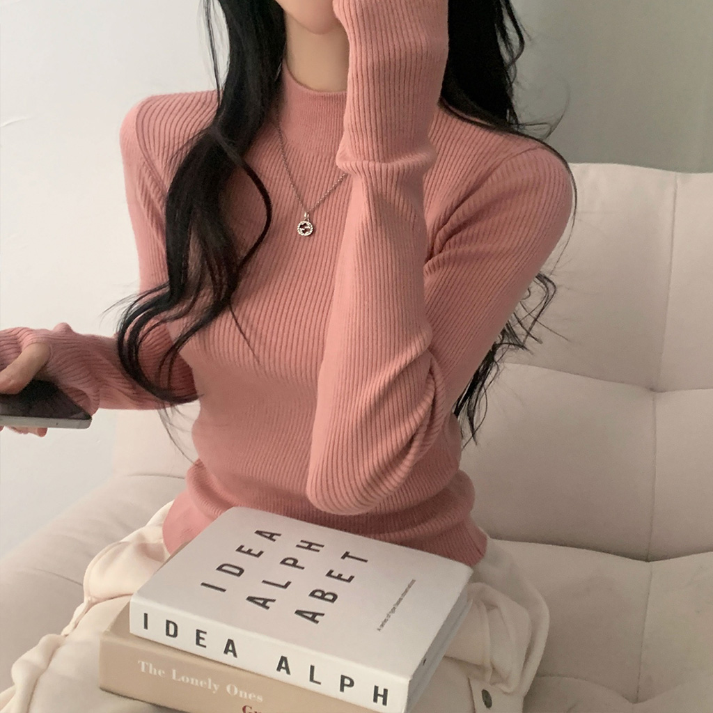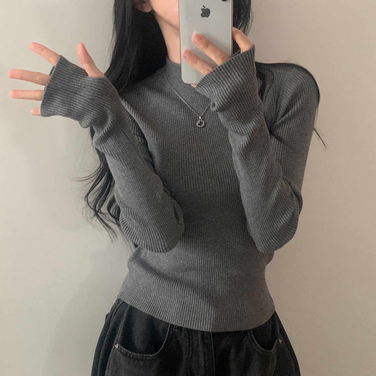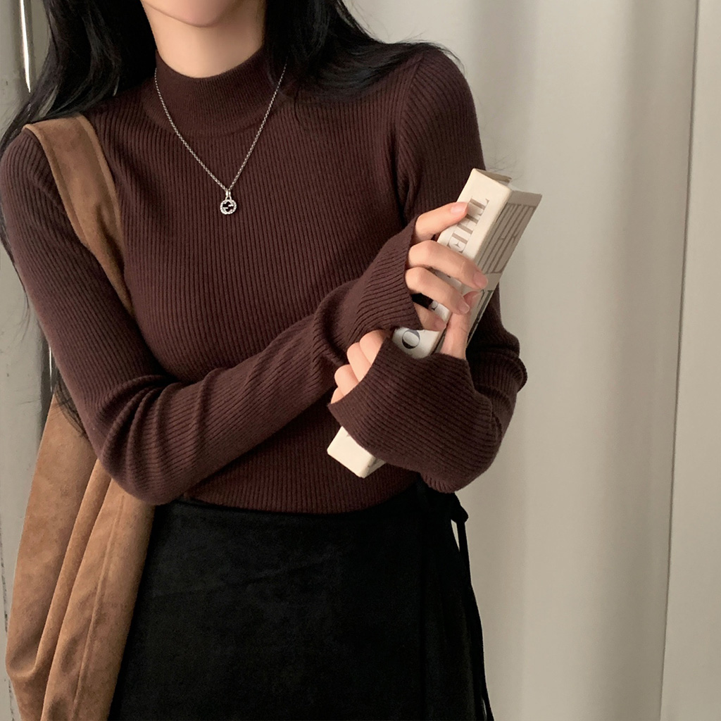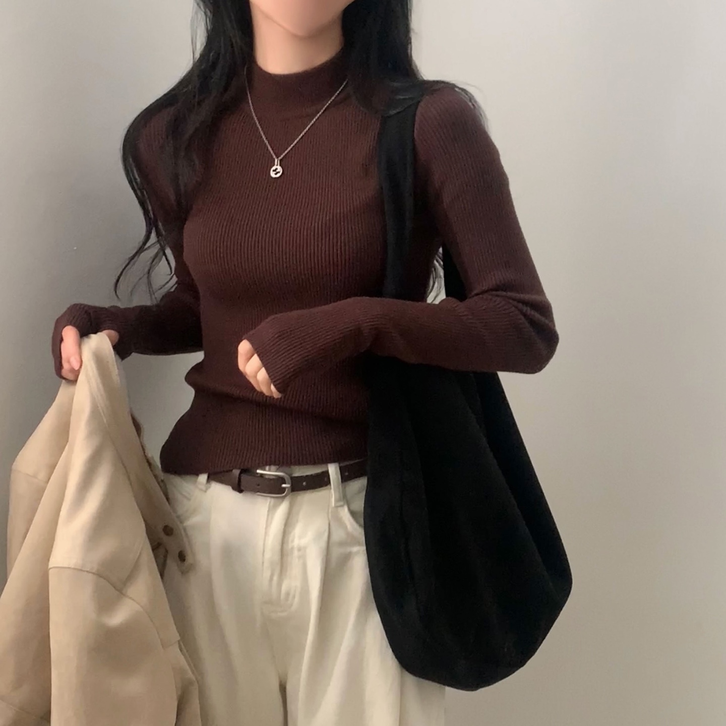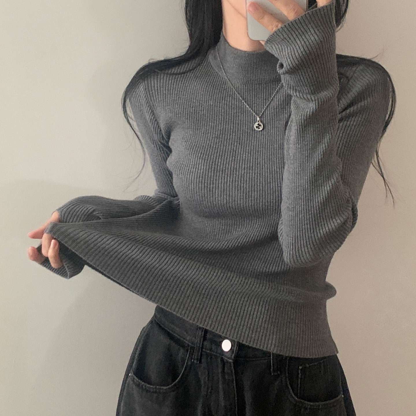ハーフネック リブ スリム フィンガーホール ニット