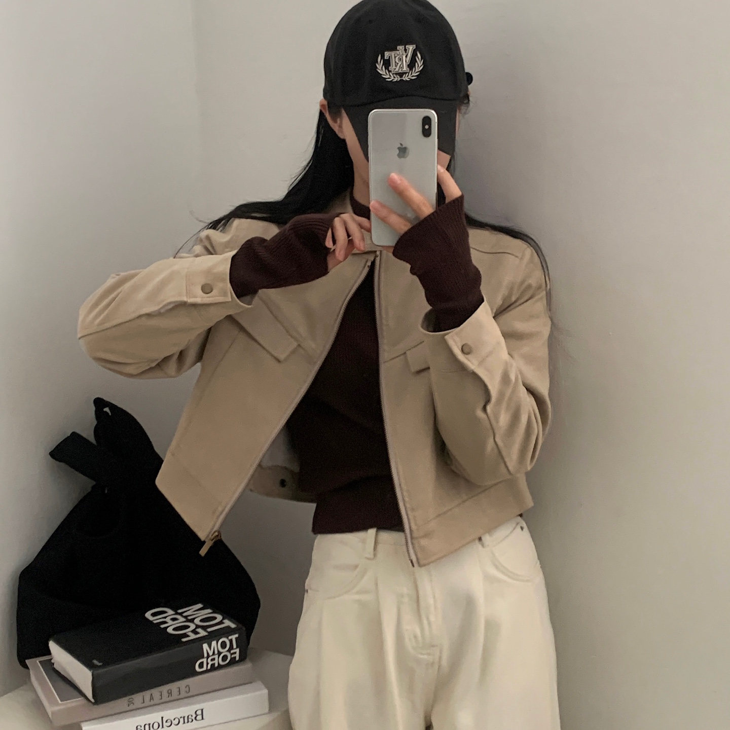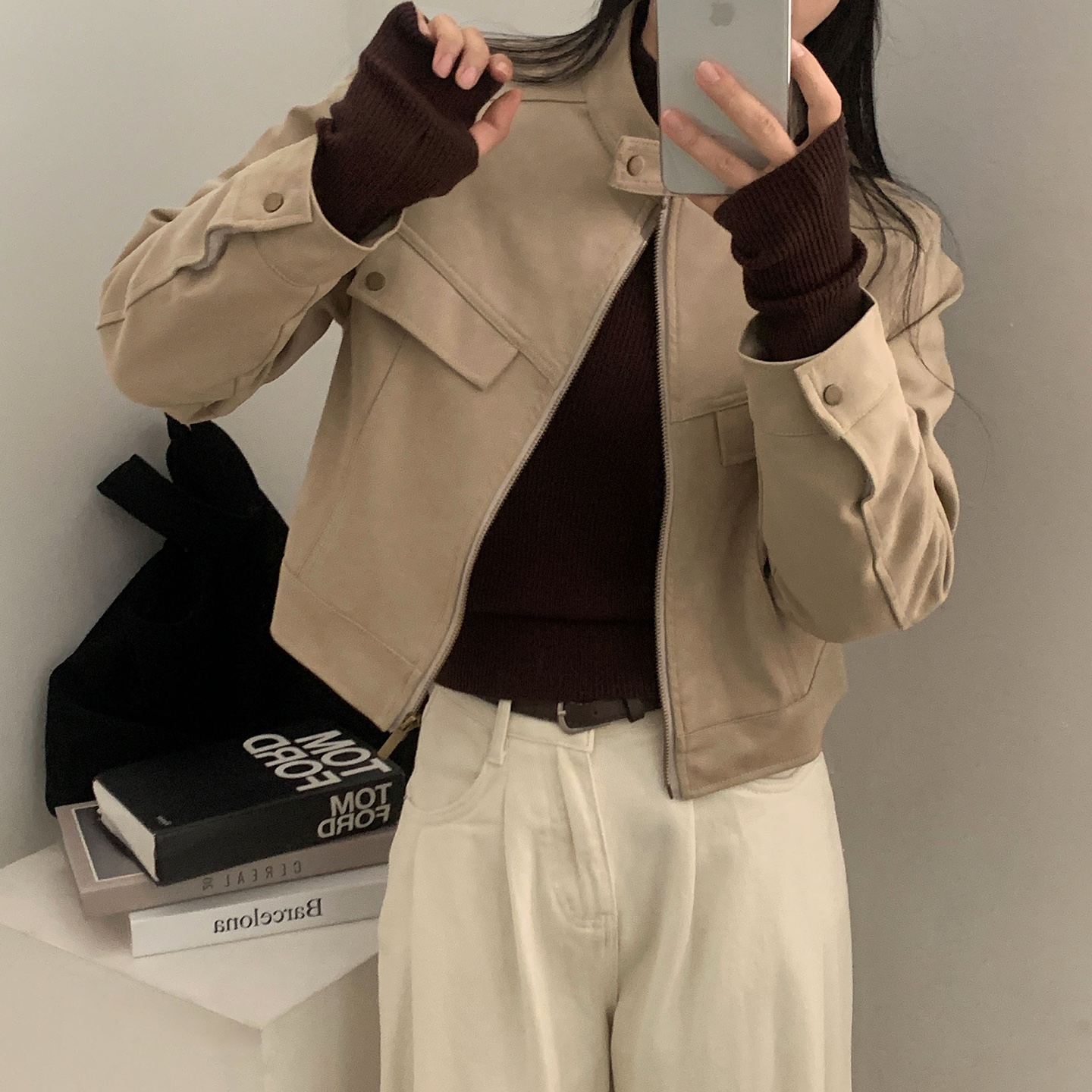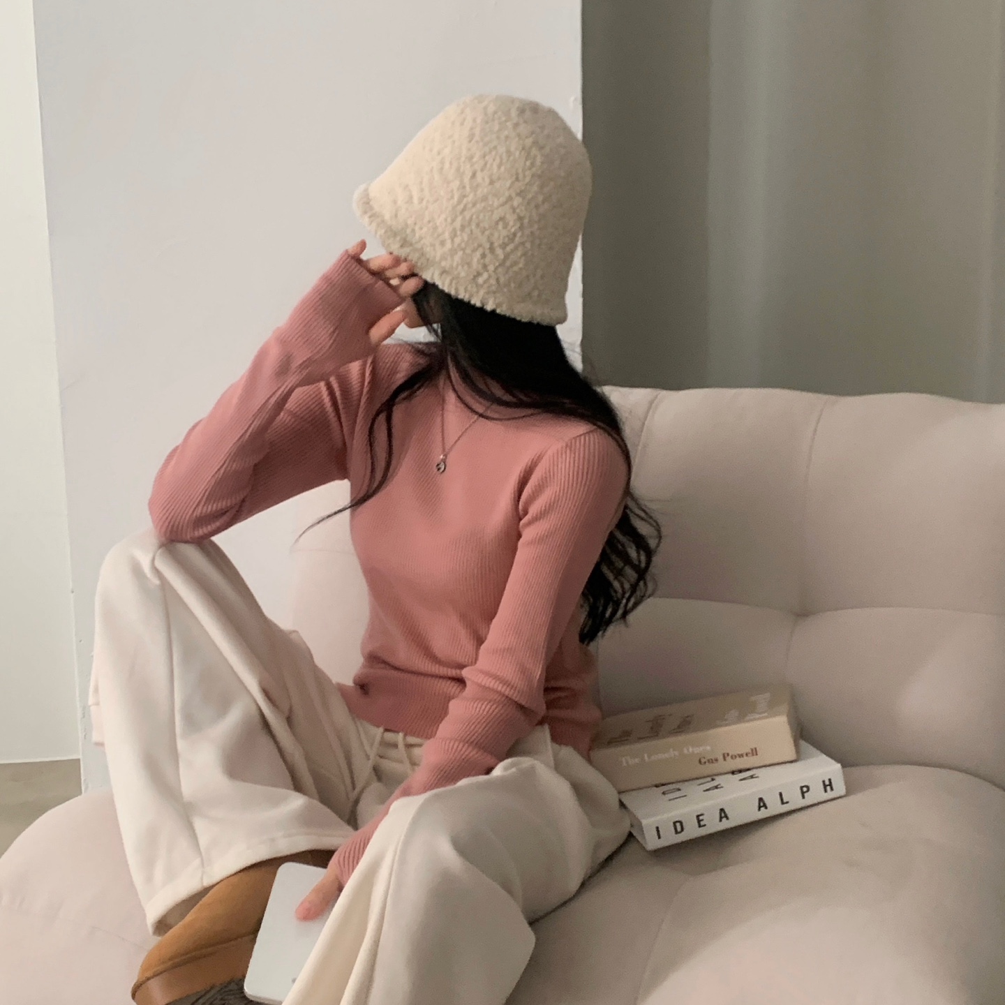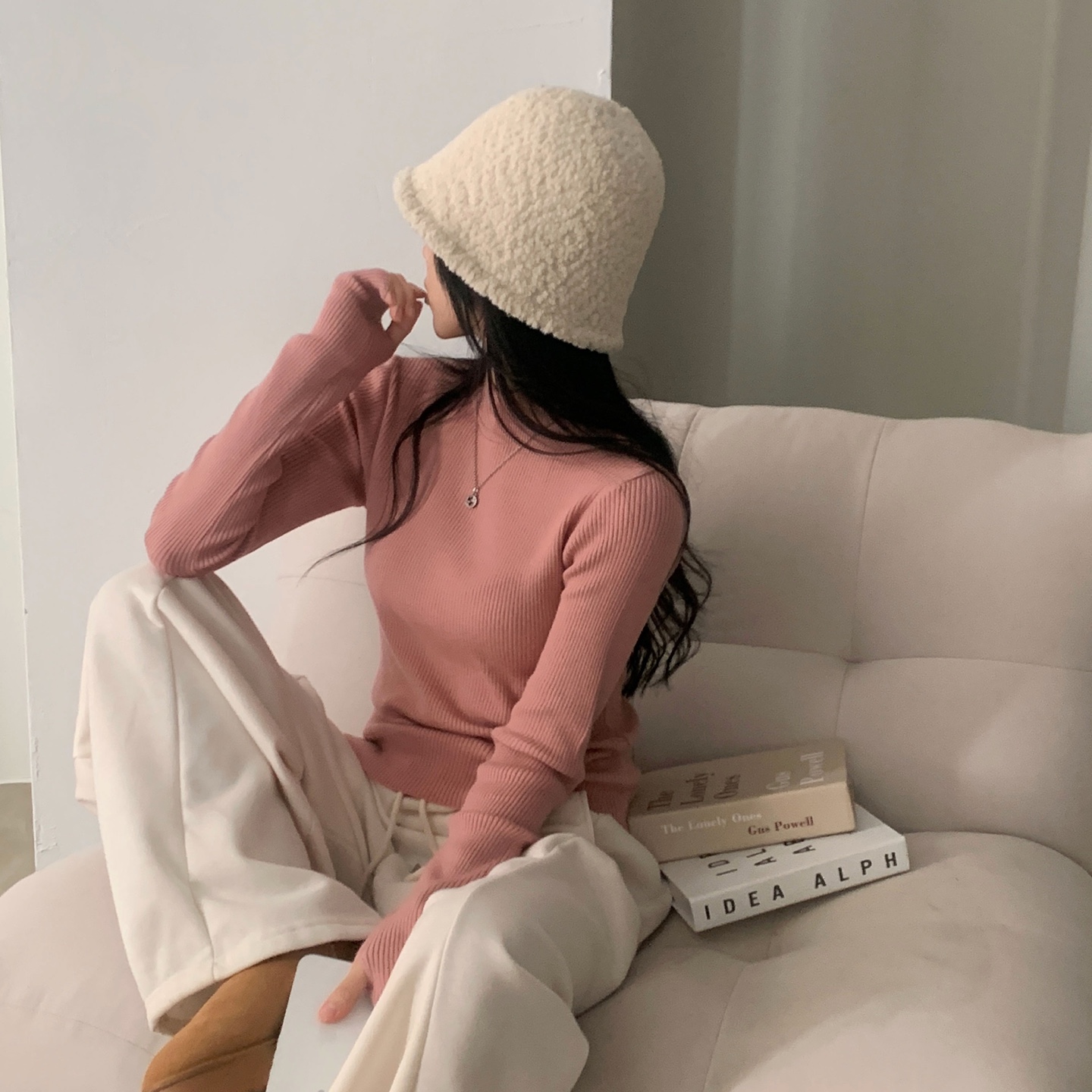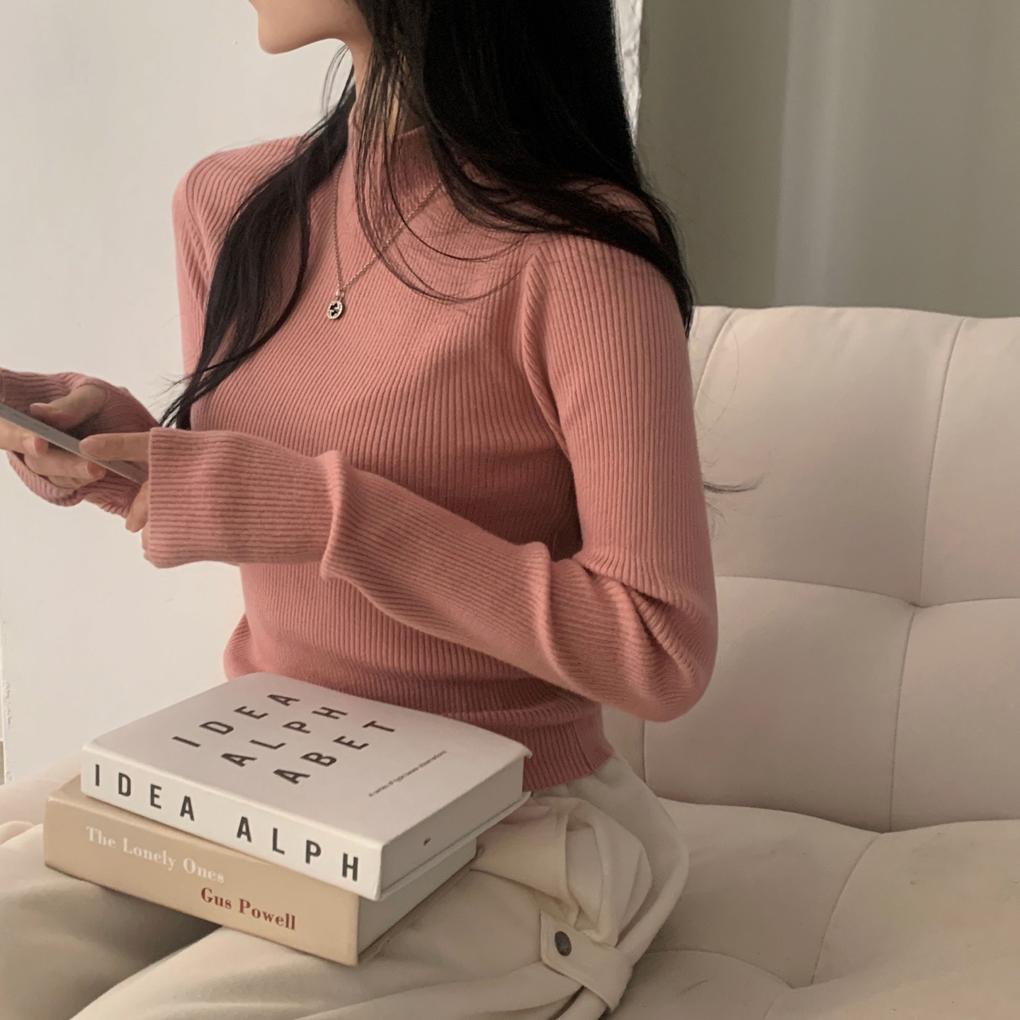 ハーフネック リブ スリム フィンガーホール ニット