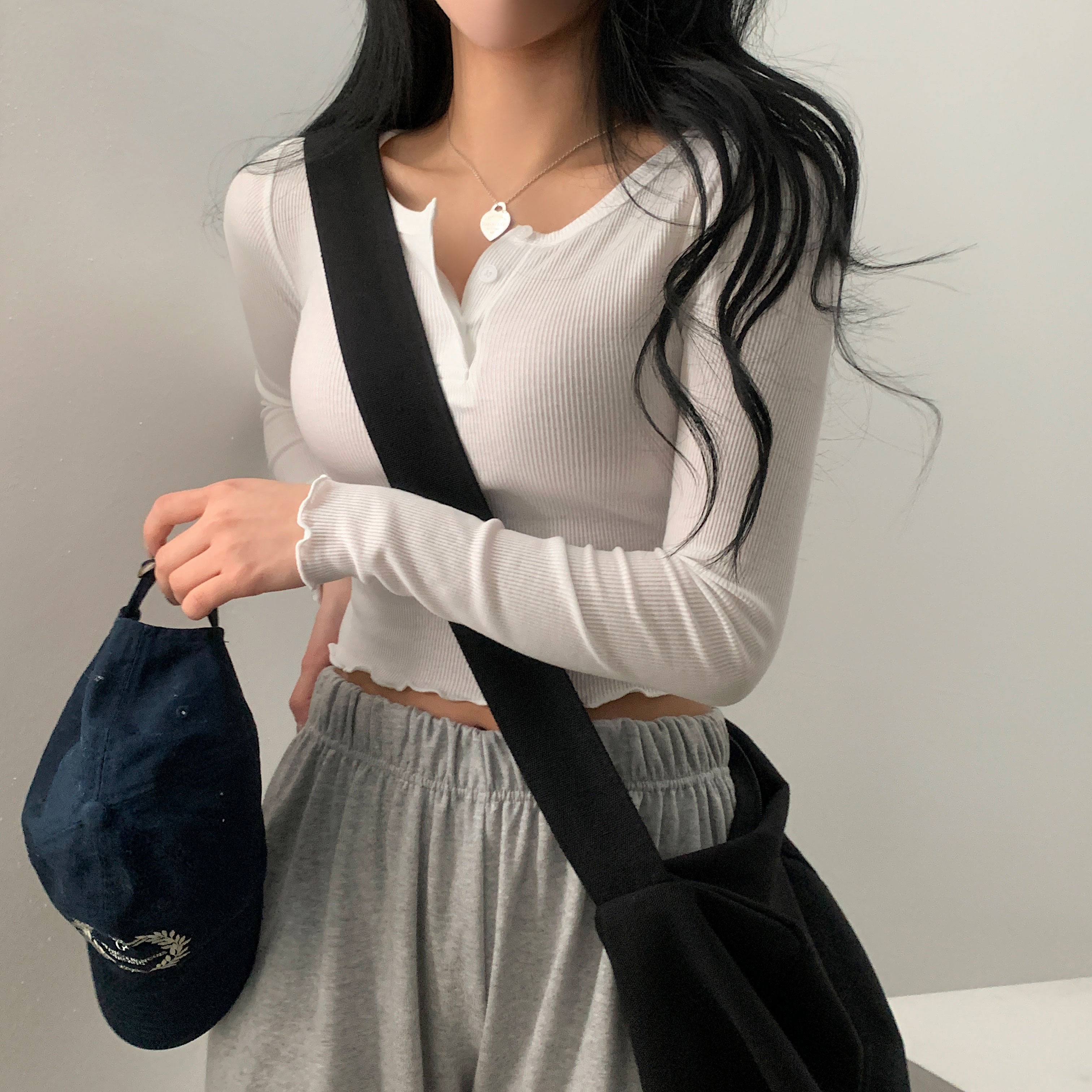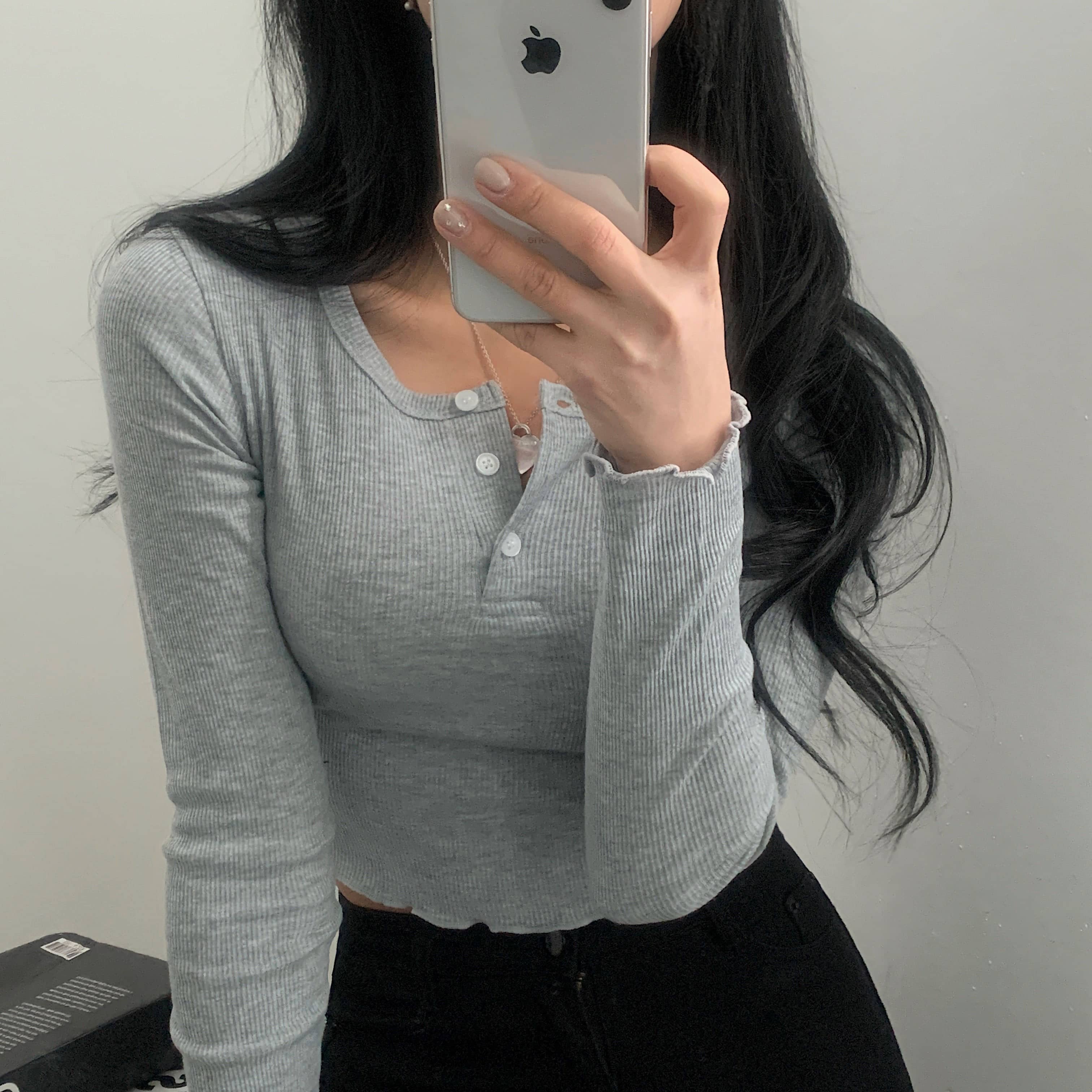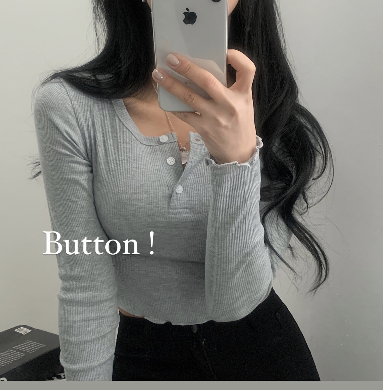 ボタンリブクロップドボタン長袖Tシャツ-4color