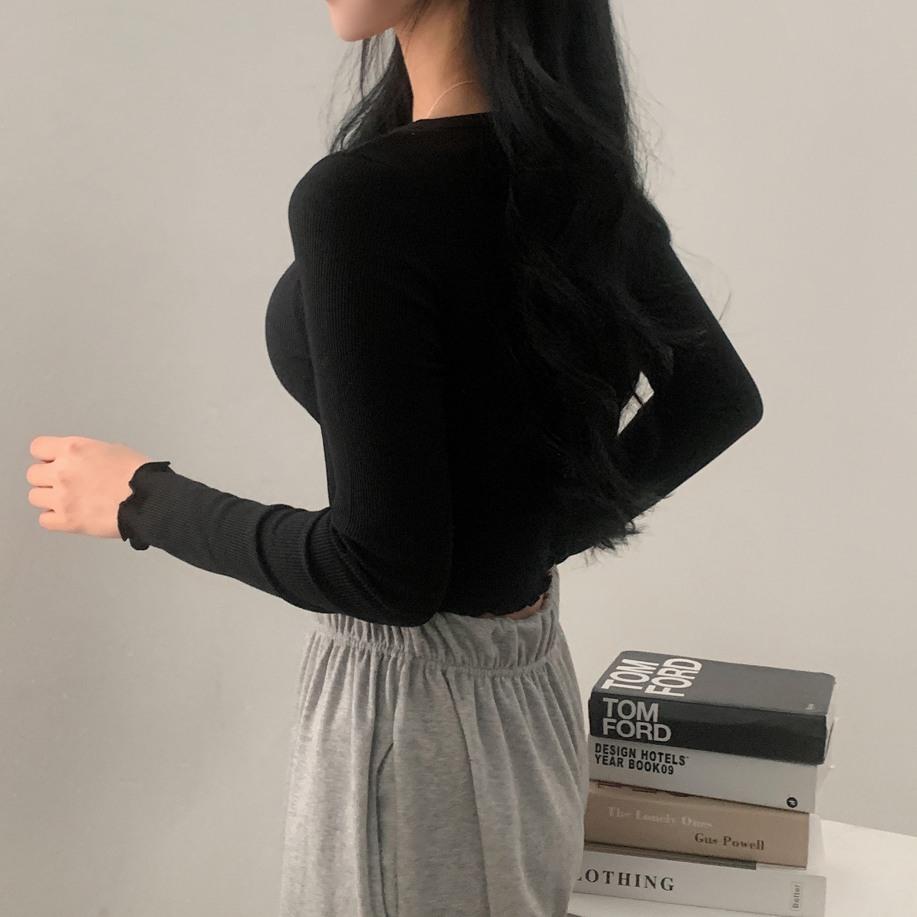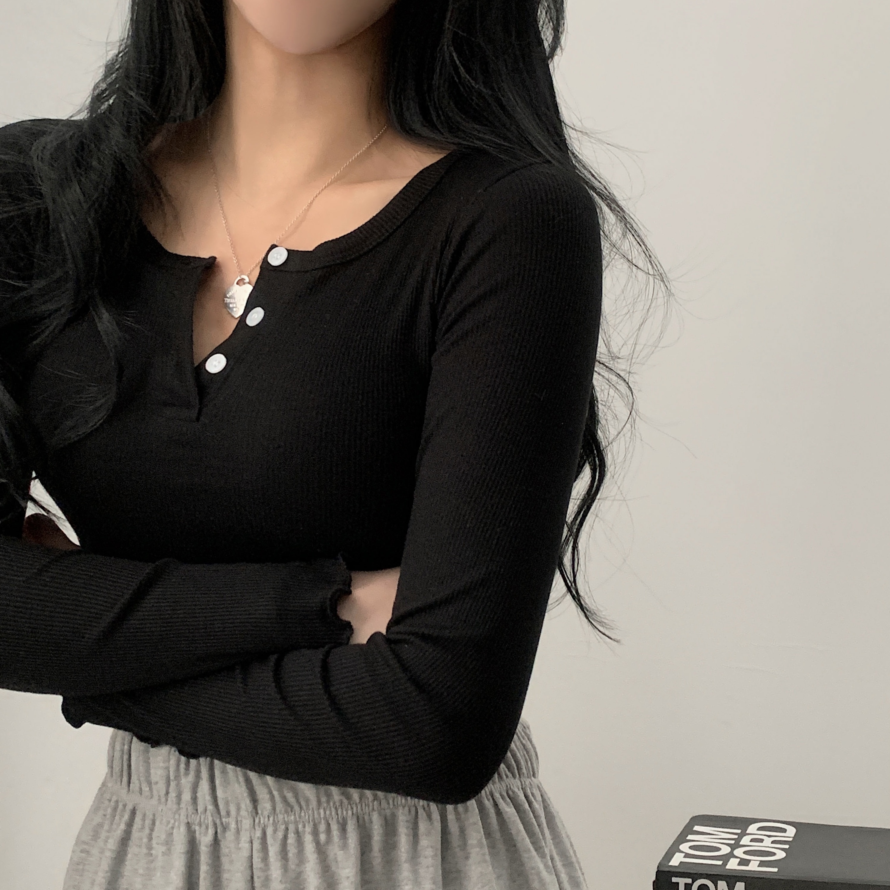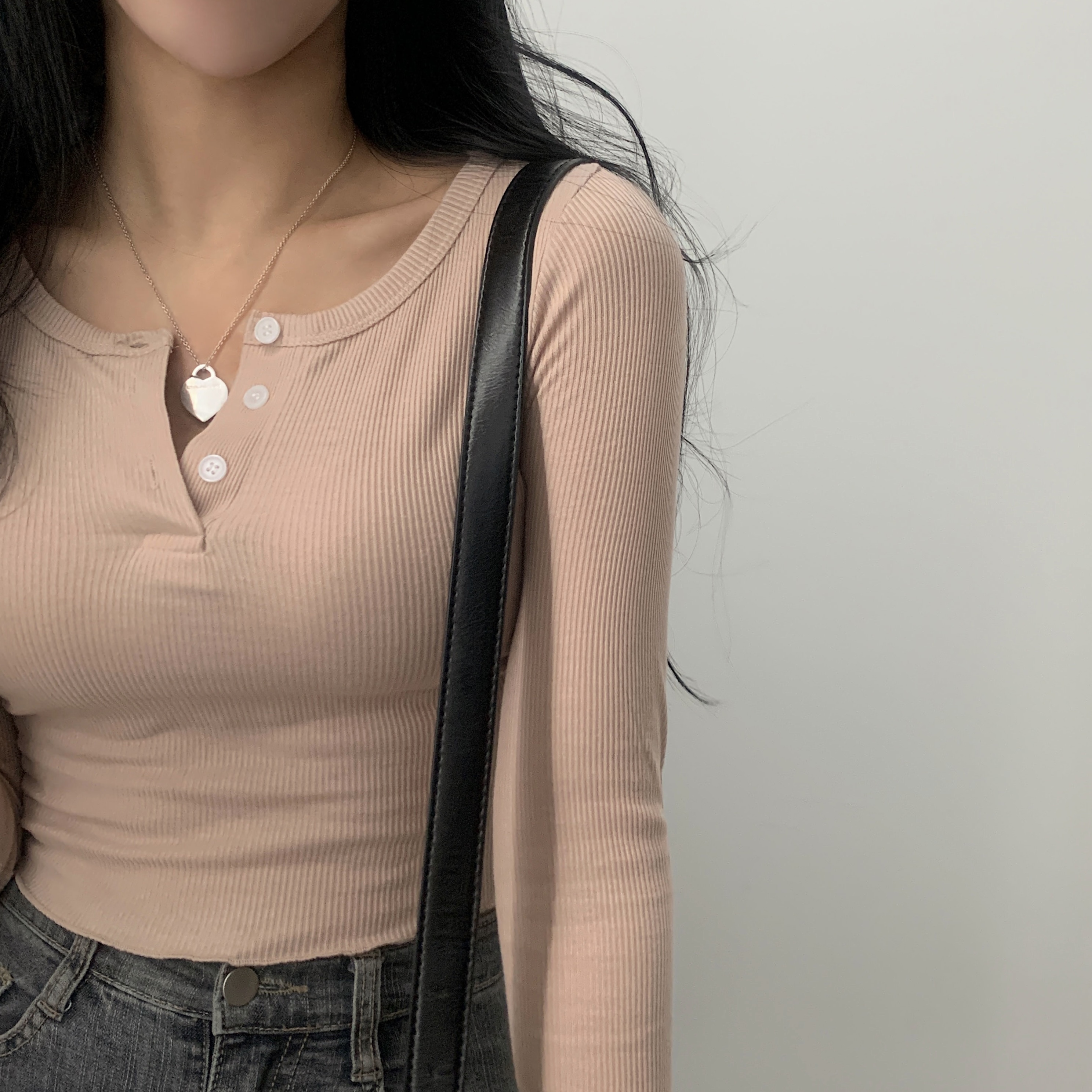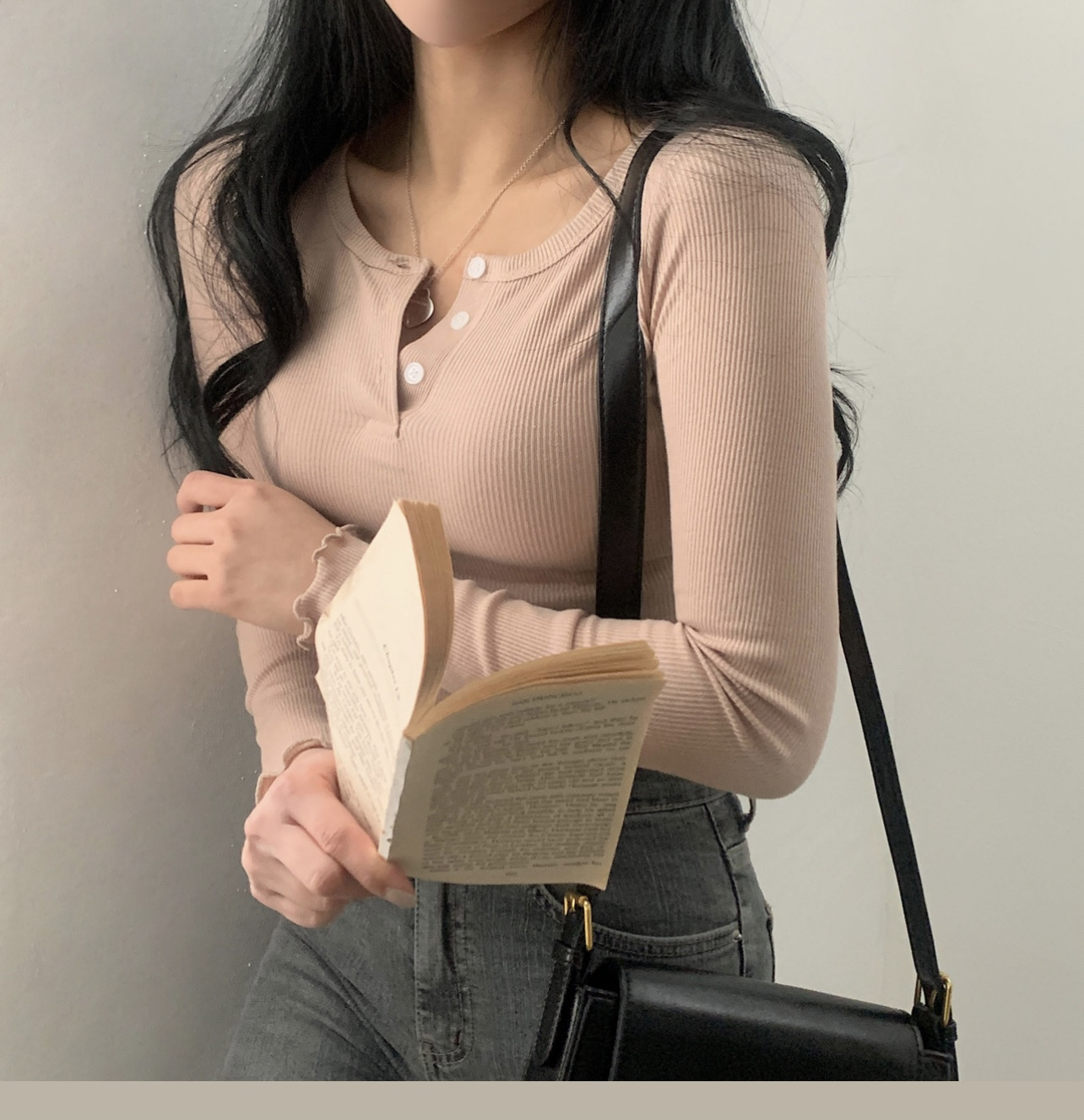 ボタンリブクロップドボタン長袖Tシャツ-4color