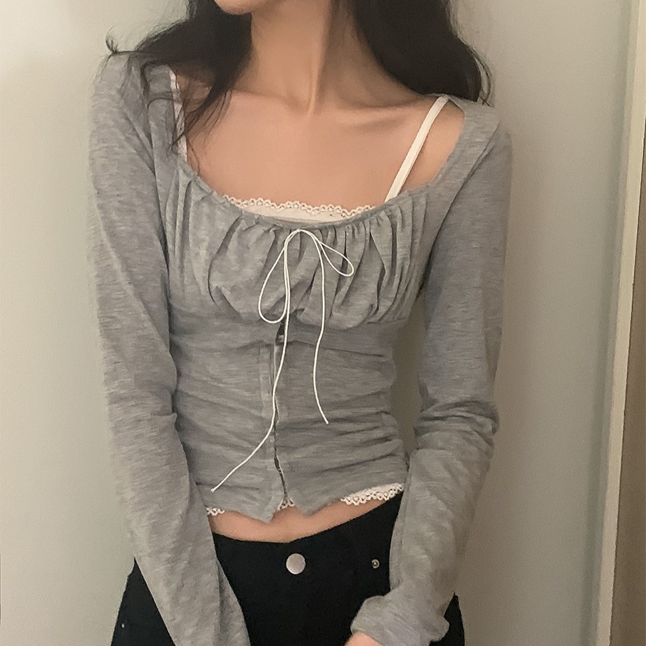 シャーリングリボンレイヤードスクエアネック長袖Tシャツ