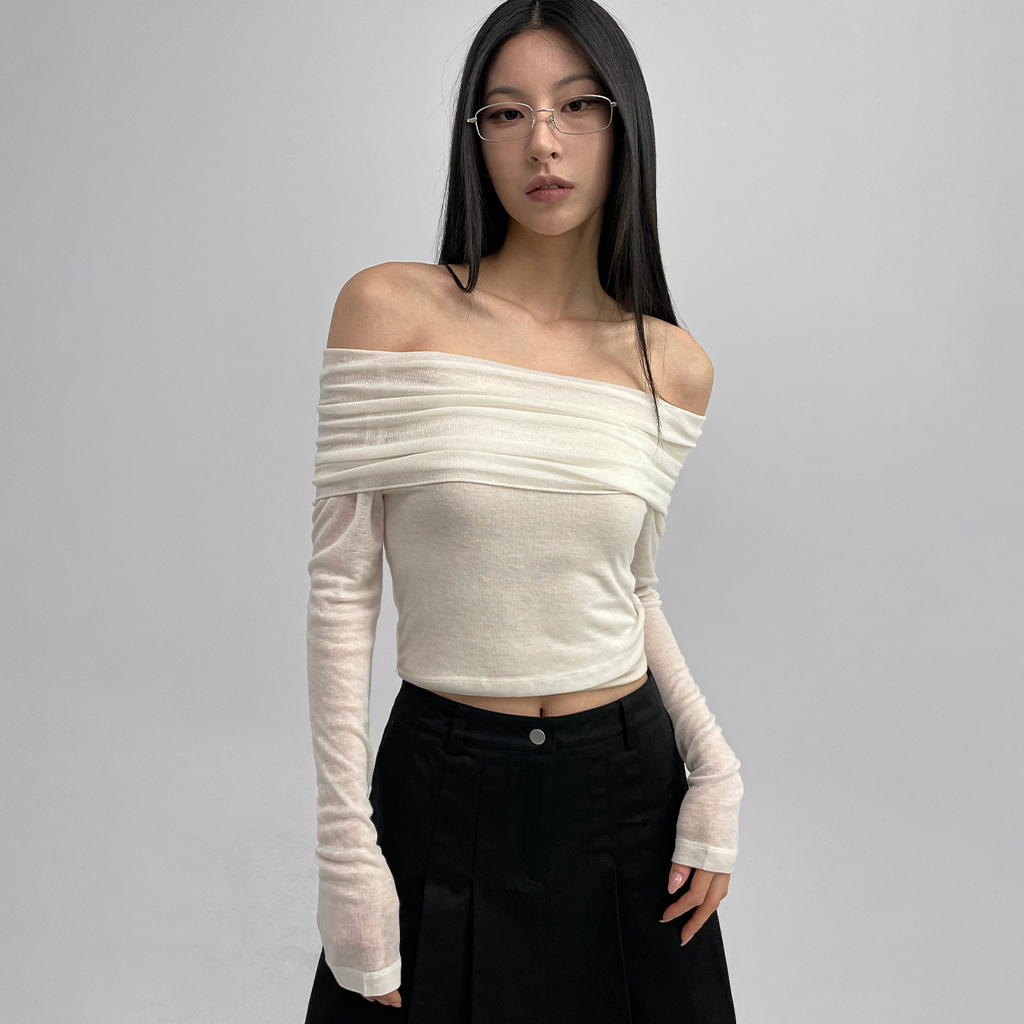 ボックスシースルーオフショルダー長袖Tシャツ (ウール30%)