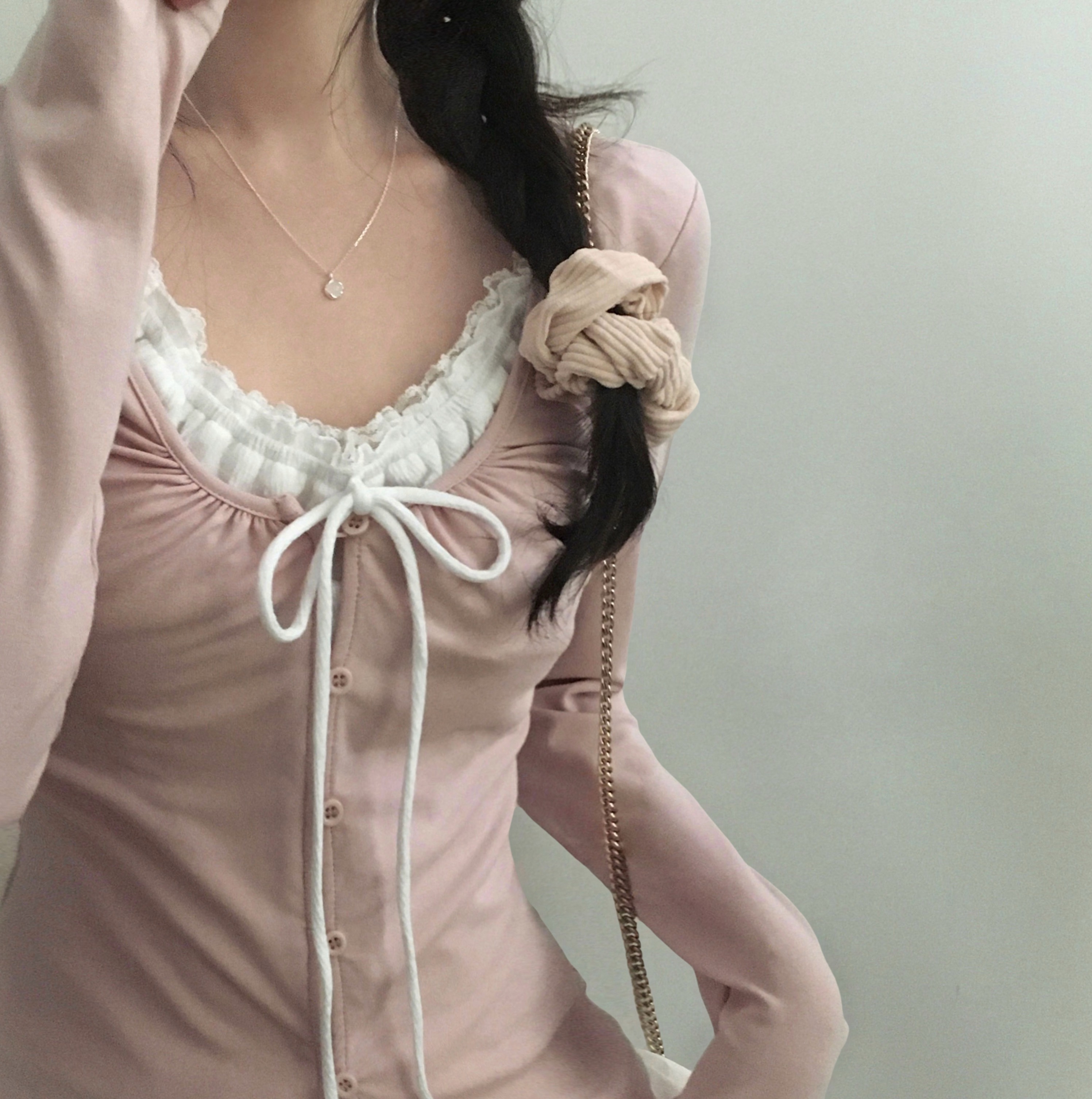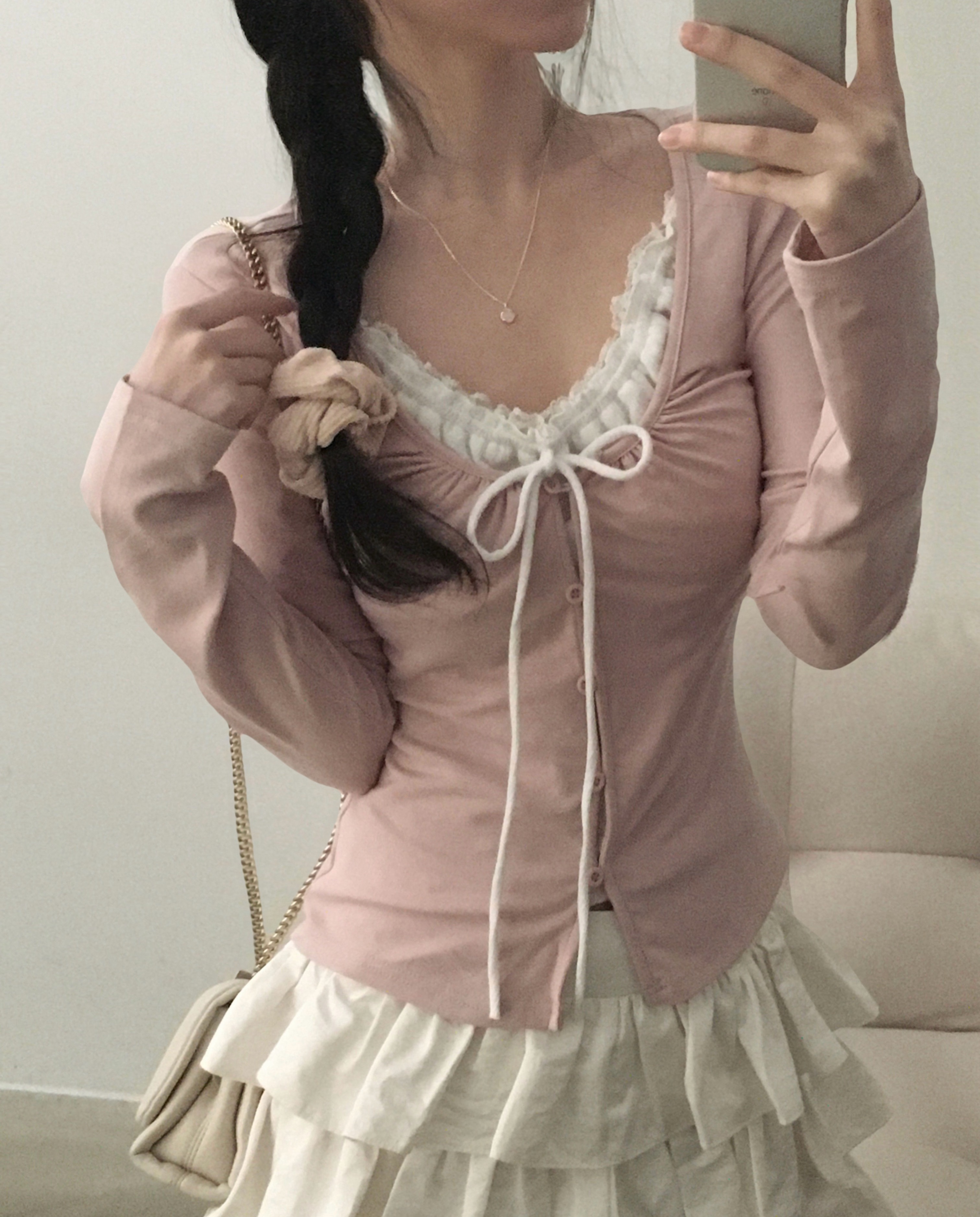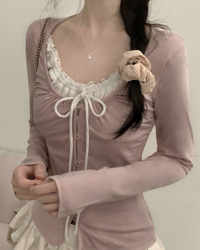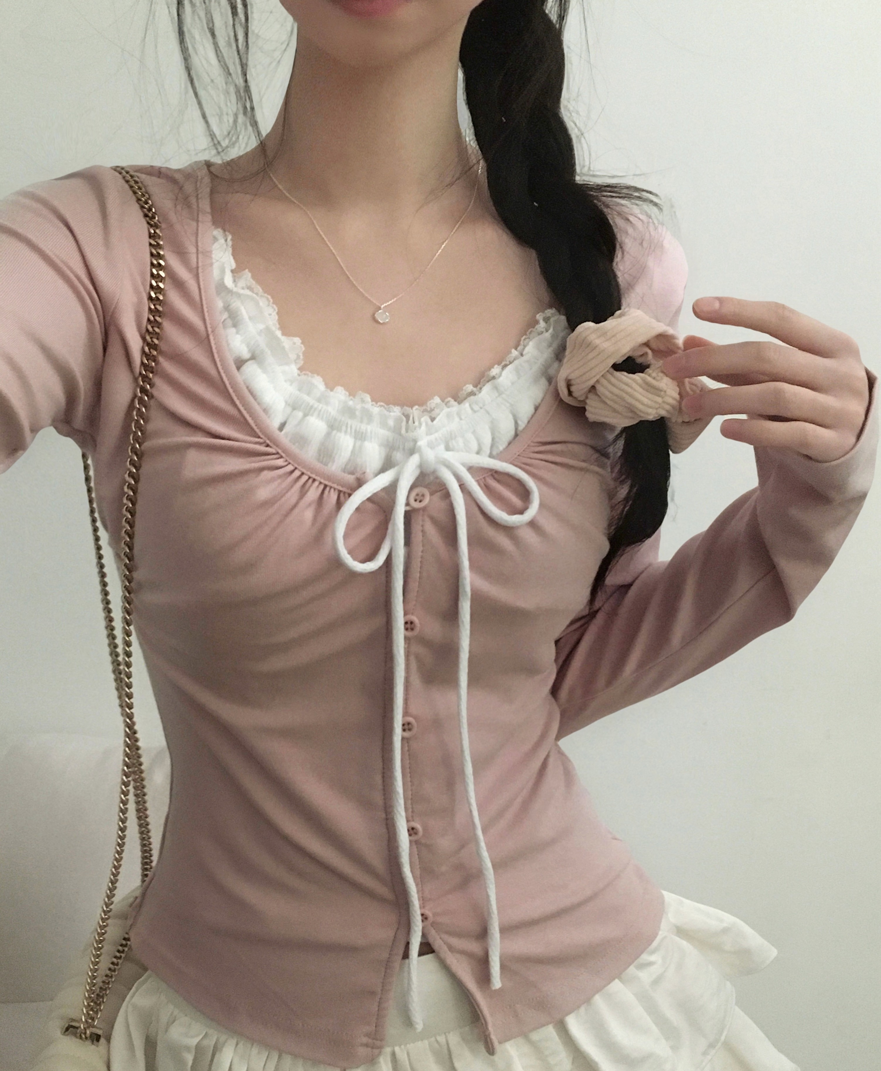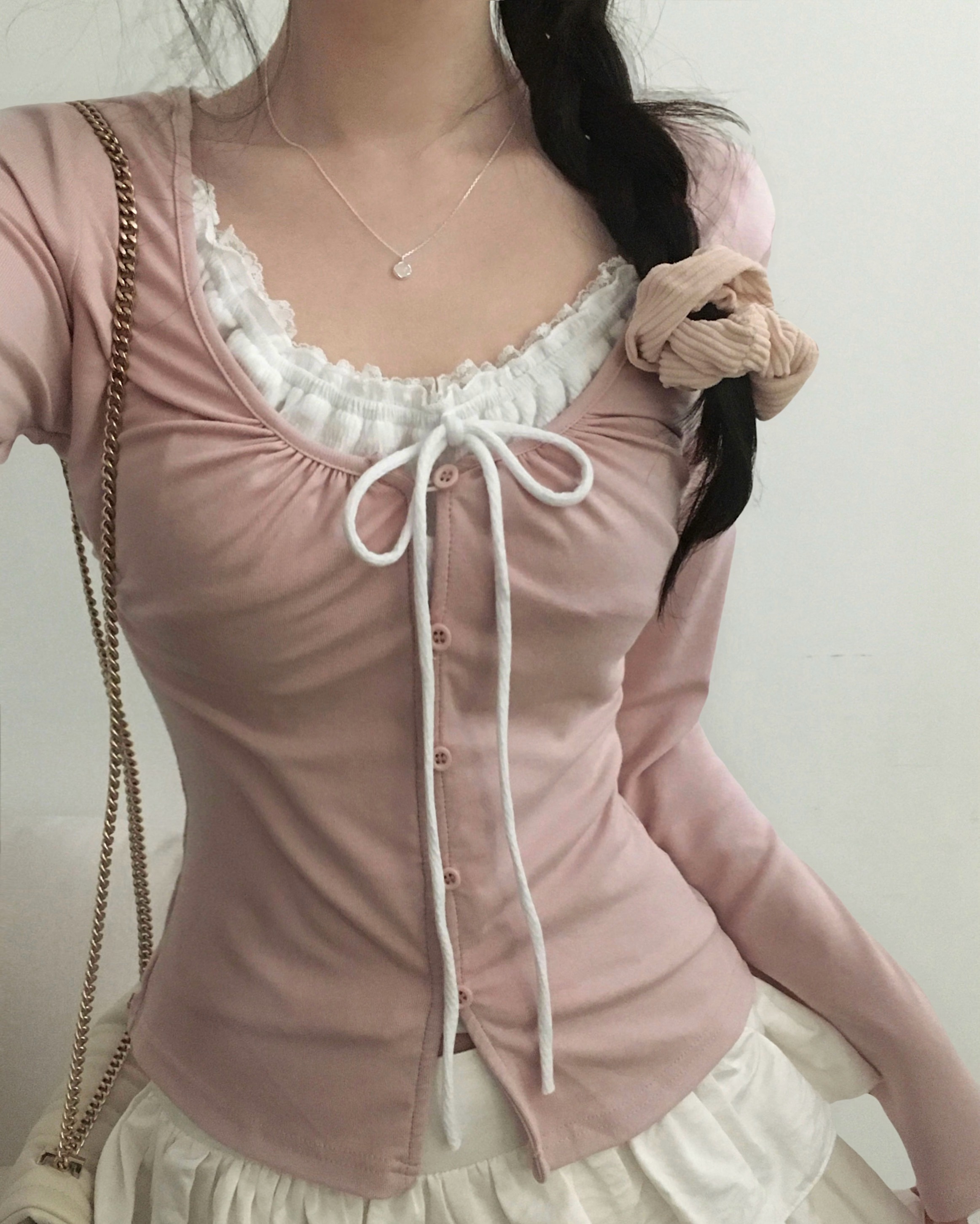 (4color) リボン レース レイヤード 長袖 Tシャツ