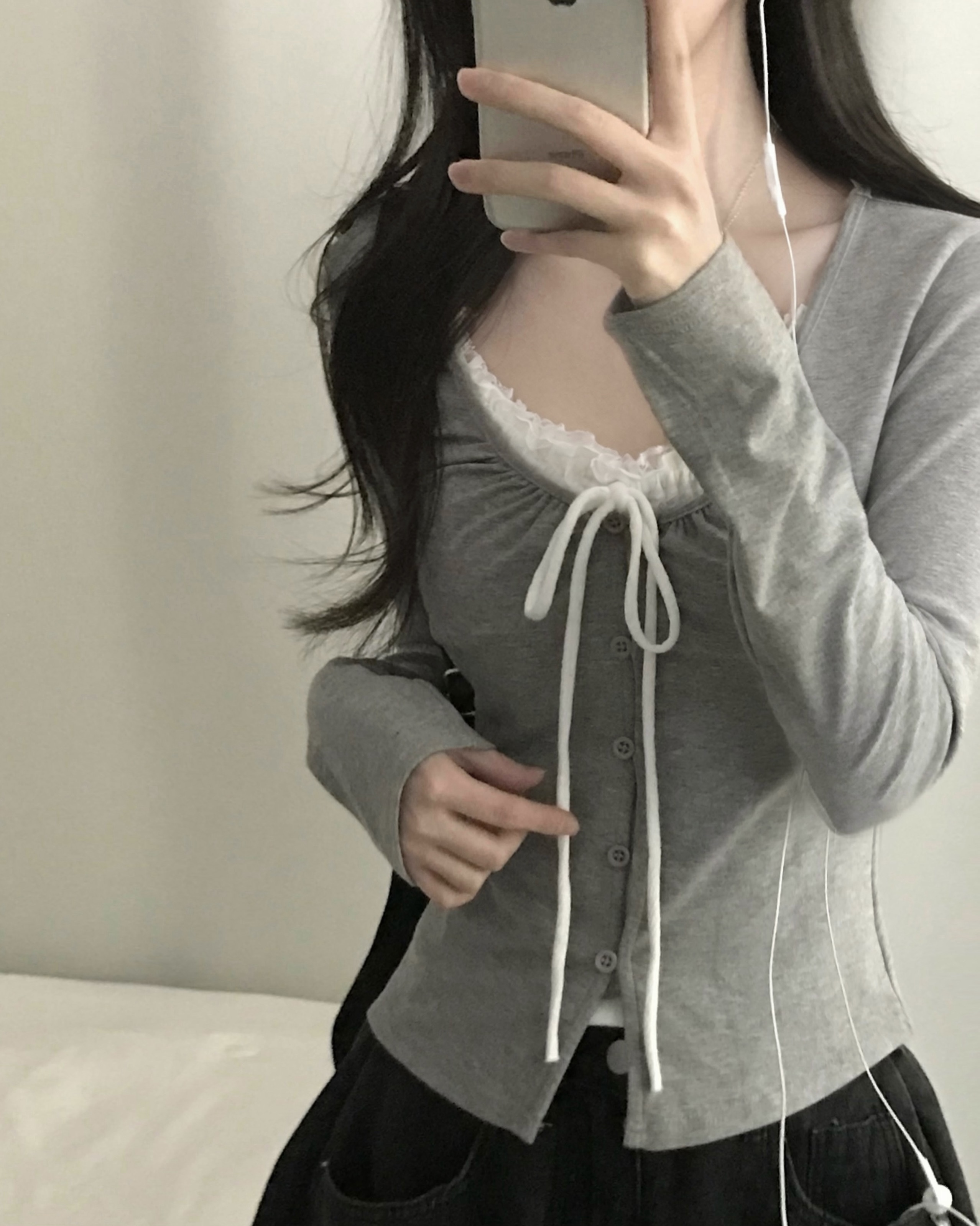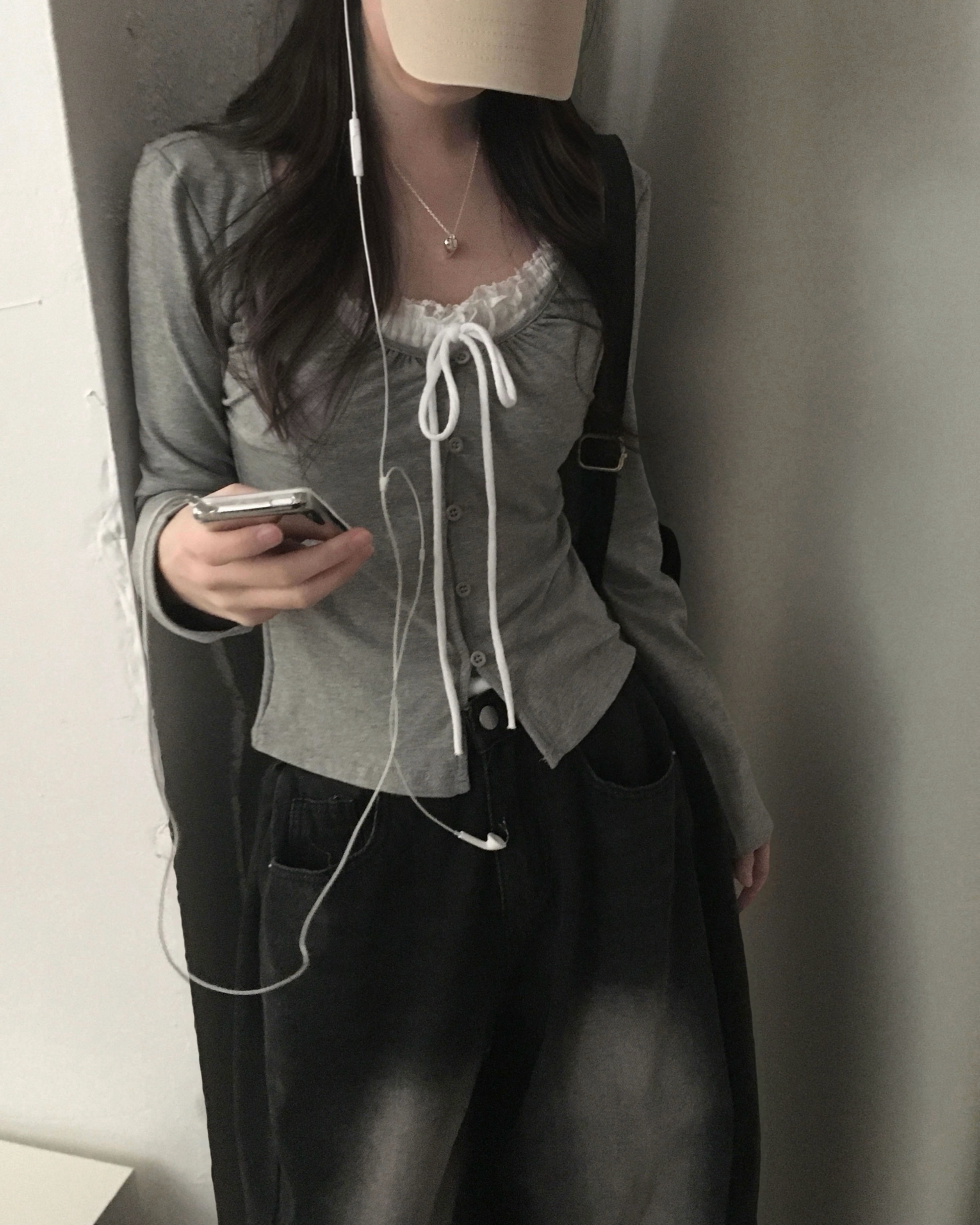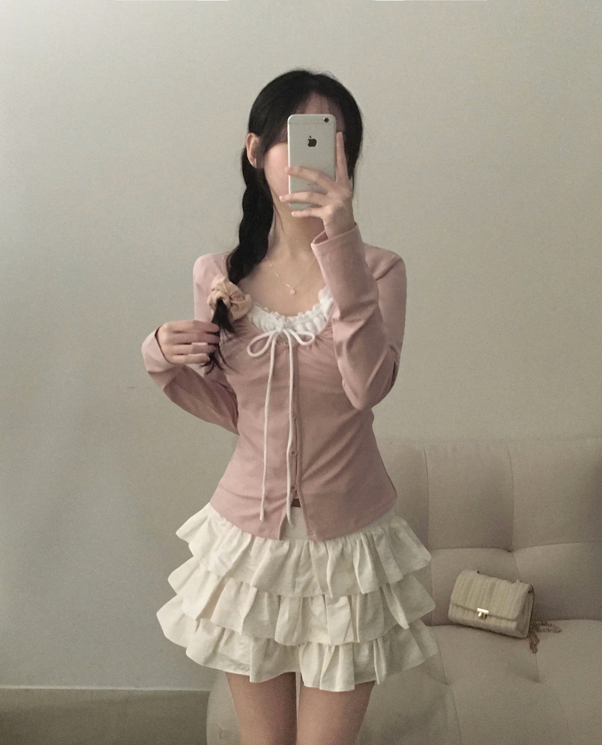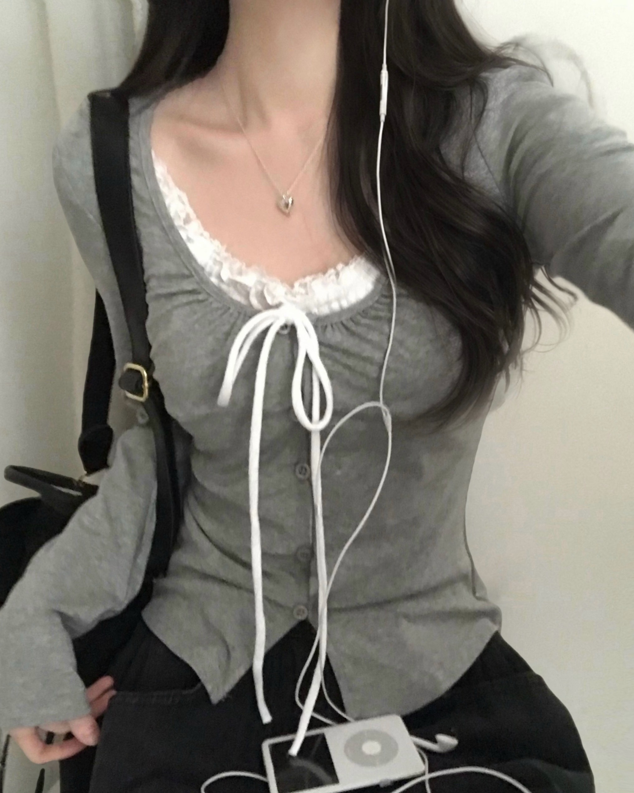 (4color) リボン レース レイヤード 長袖 Tシャツ