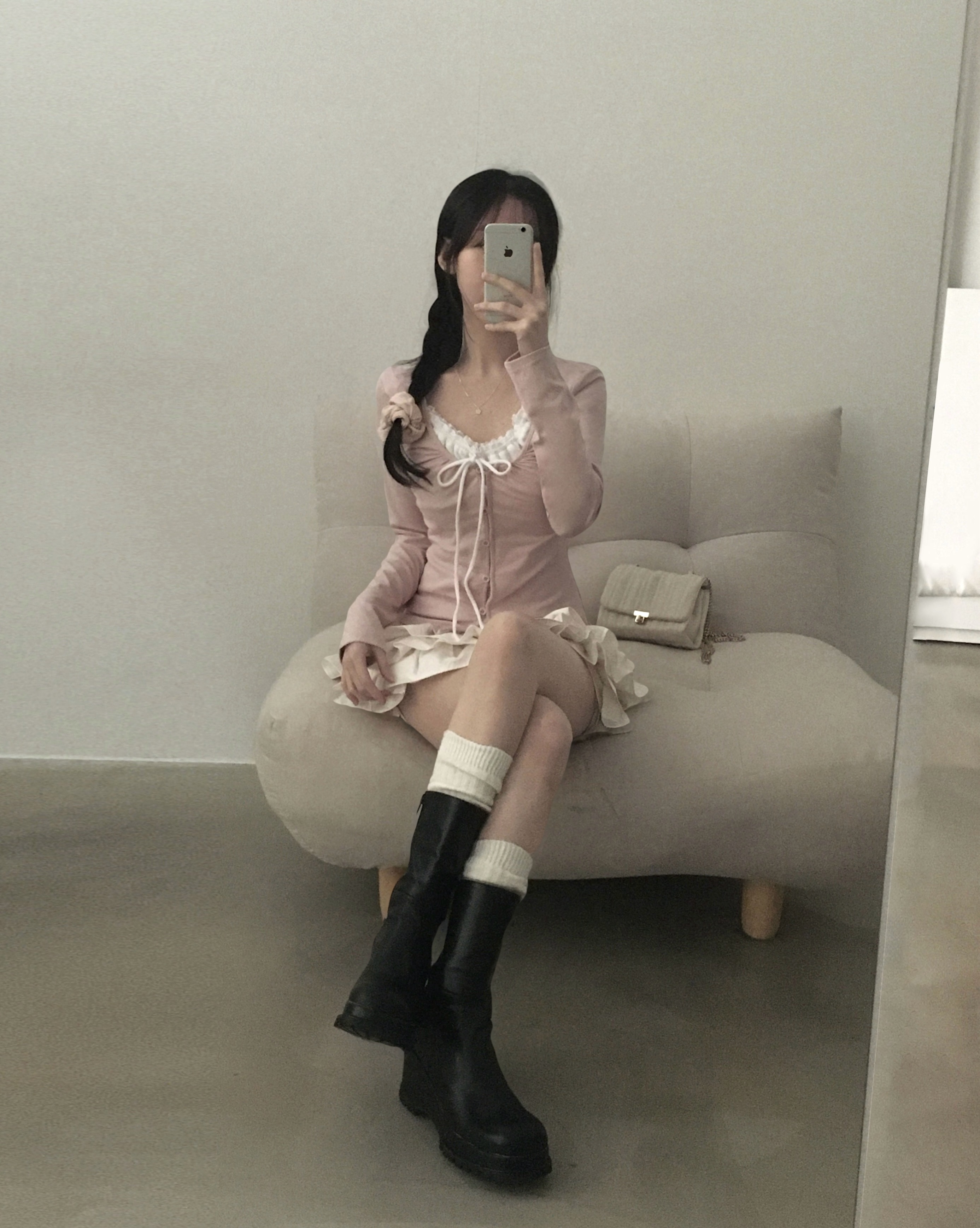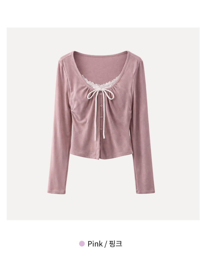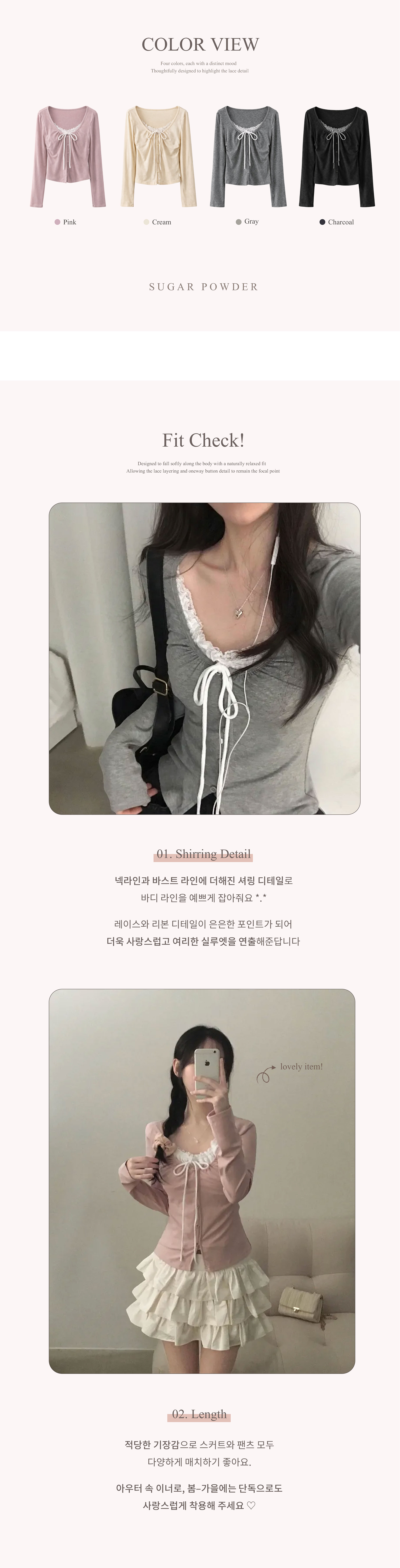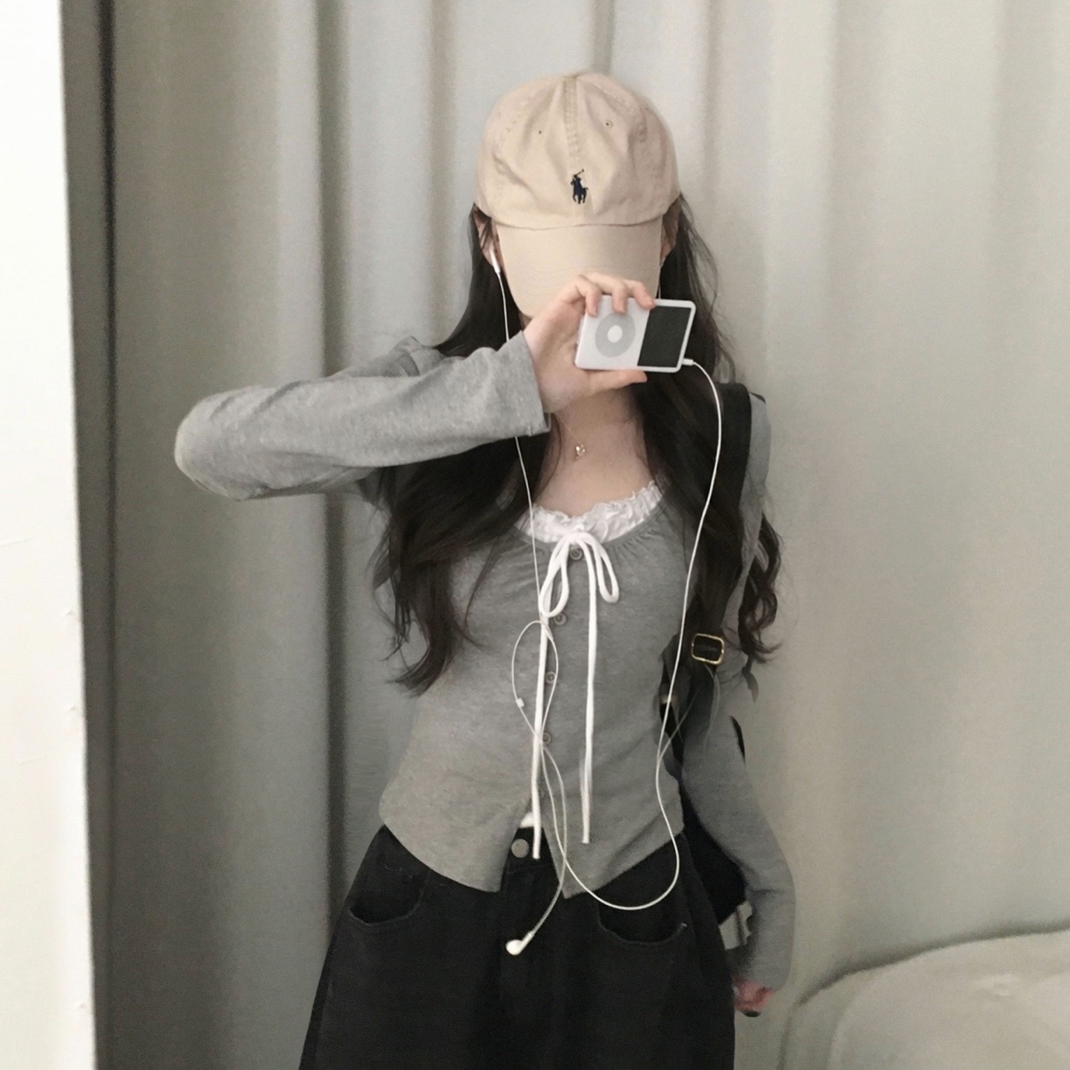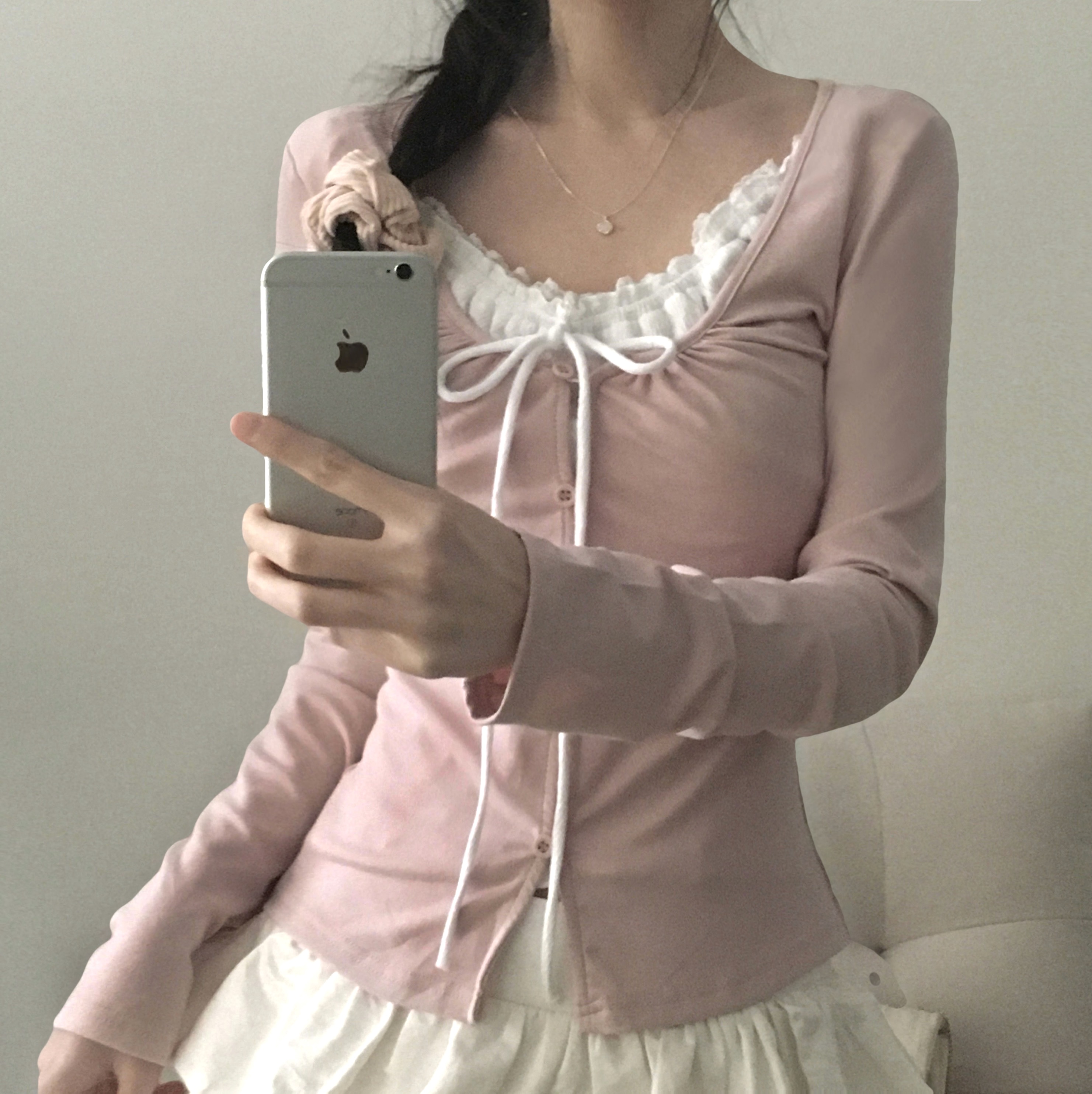 (4color) リボン レース レイヤード 長袖 Tシャツ