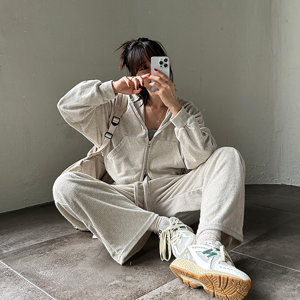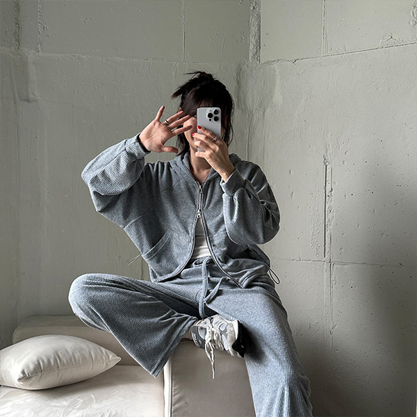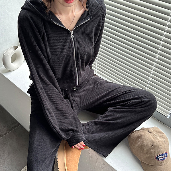 [set] ベルベッド2WAYクロップドフード付きパーカー+ワイドパンツトレーニング