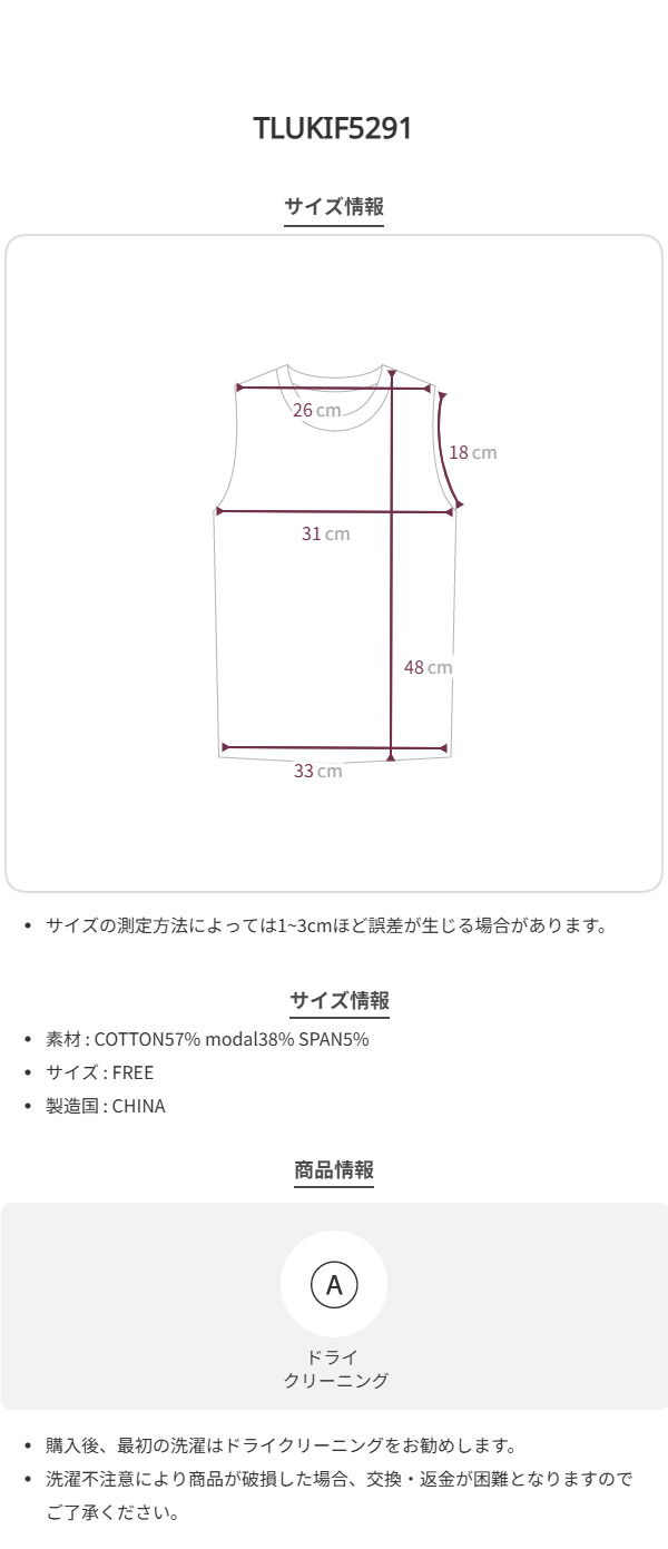 肩断面26 バスト31 アームホール18 裾断面33 着丈(紐付き)48