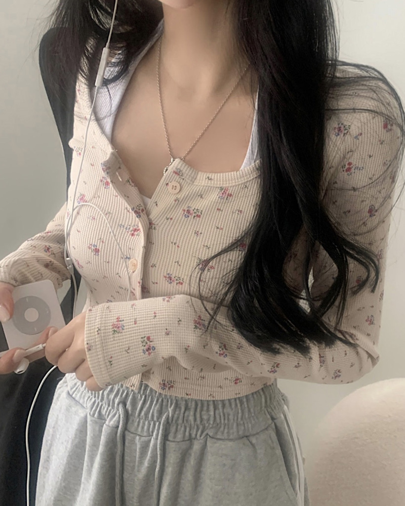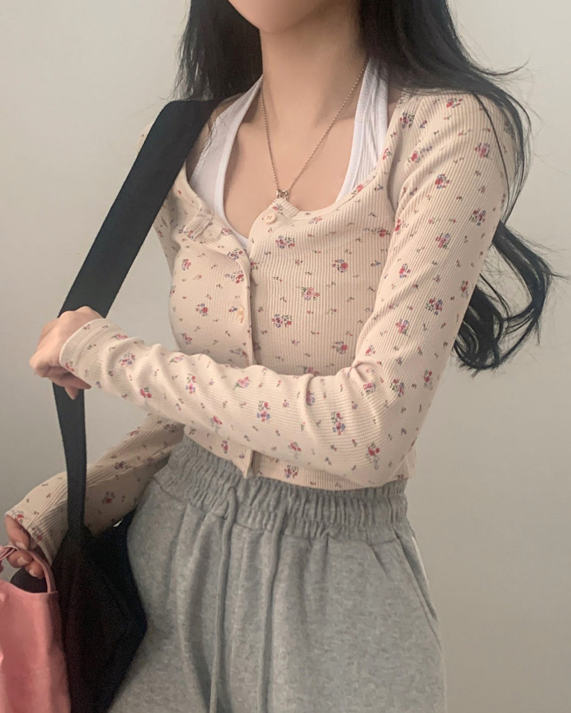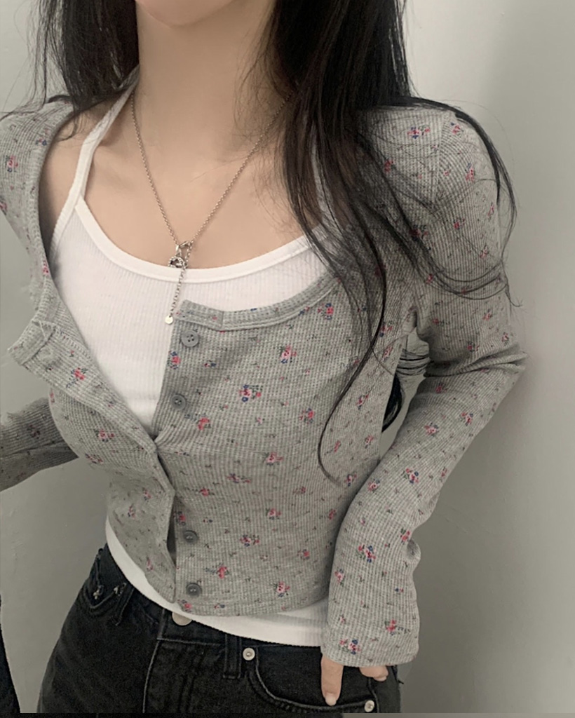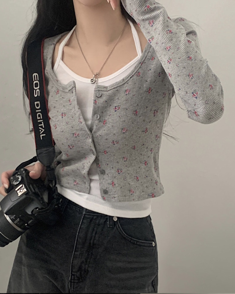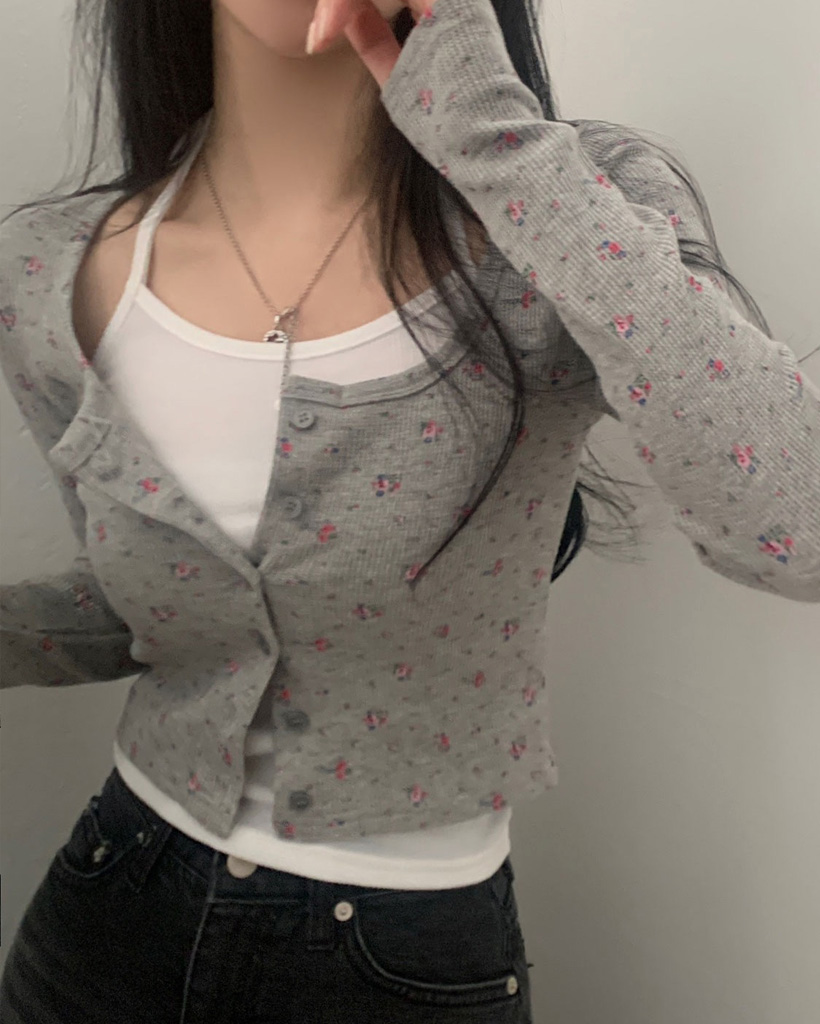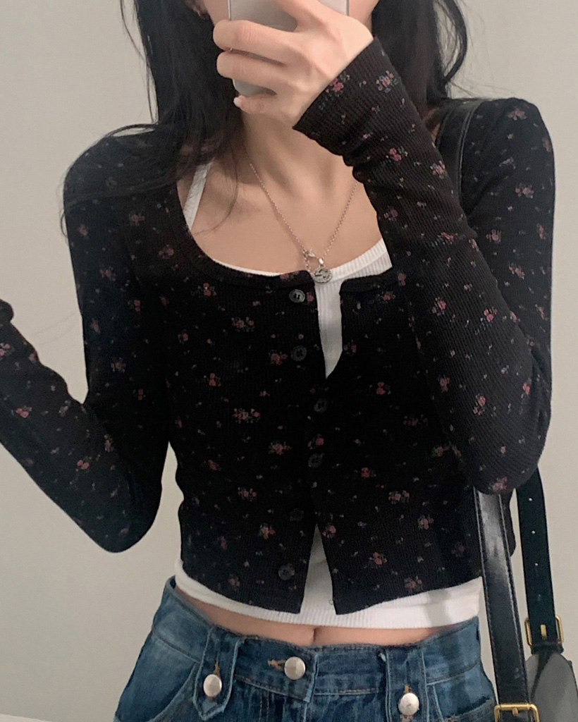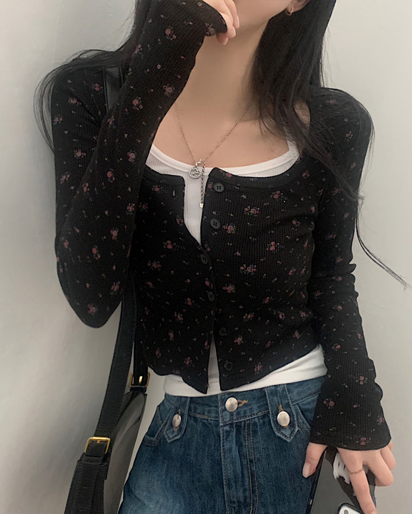 フラワー柄ボタンニットカーディガン-3color