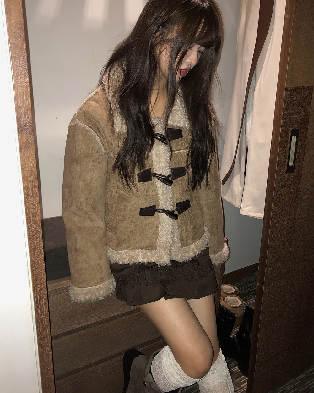 ダッフルボタンファーミドル丈ムートンコート
