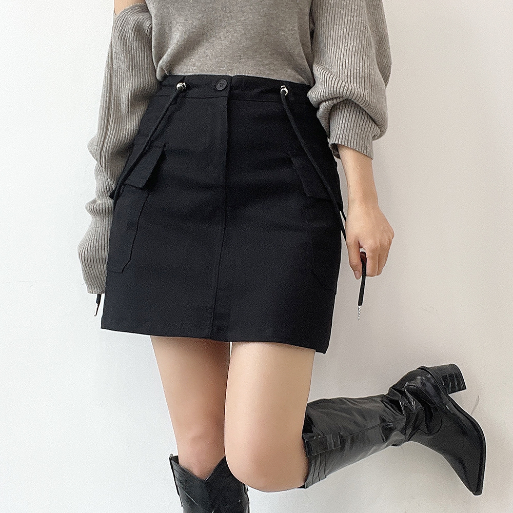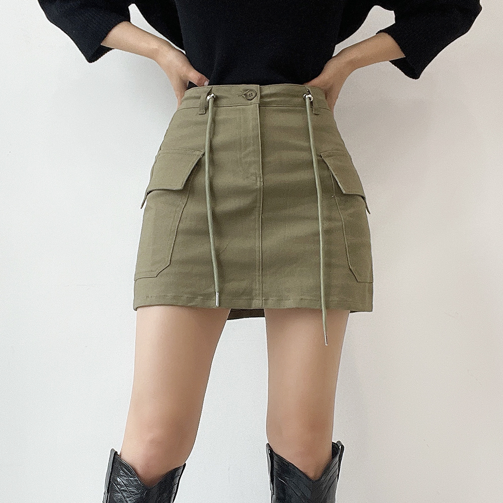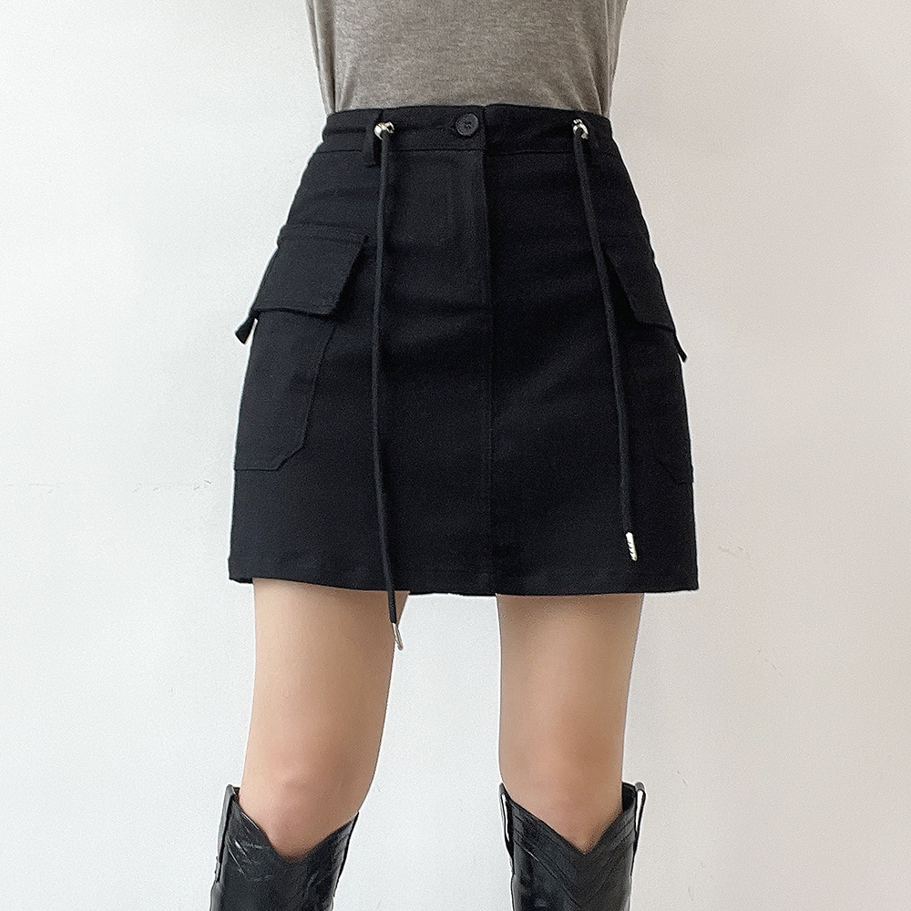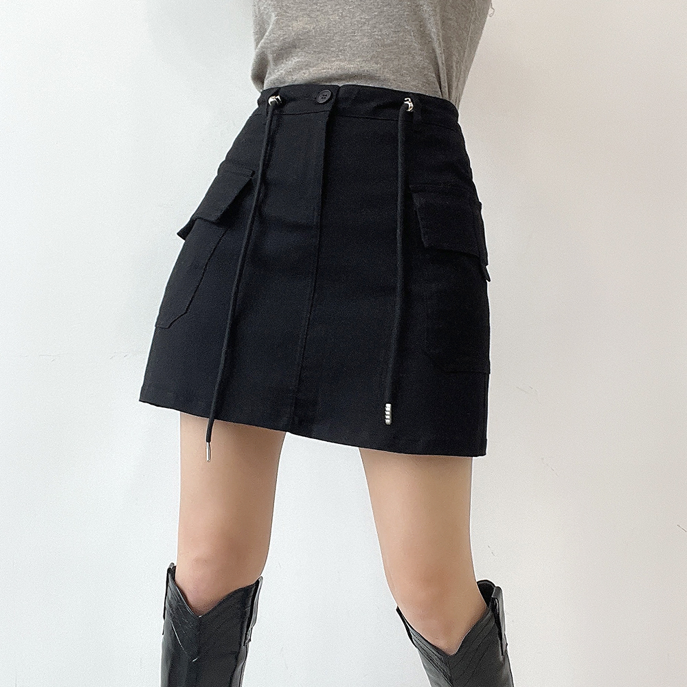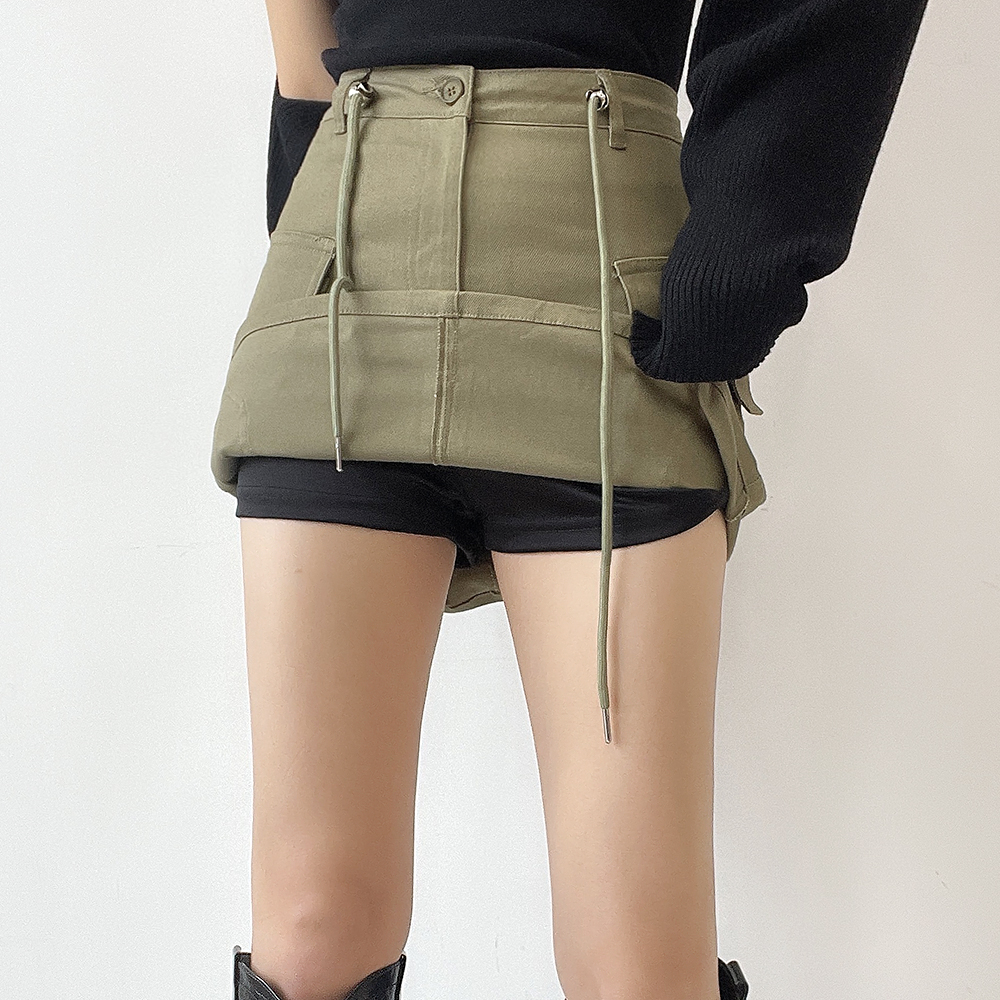 [~2XL/丈選択/パンツ型裏地] ウエストゴムストリングカーゴポケットミニスカート