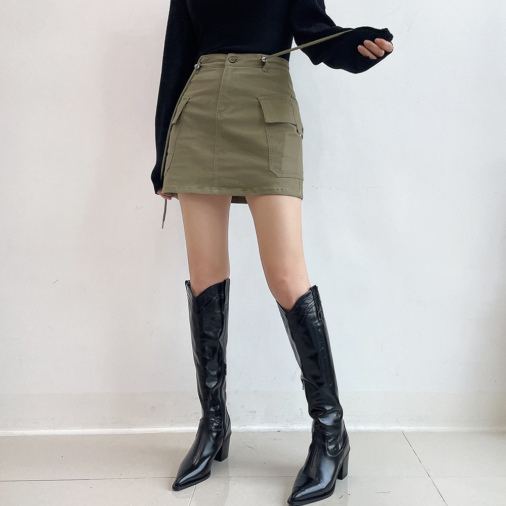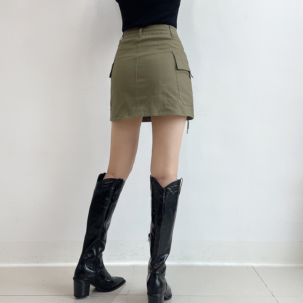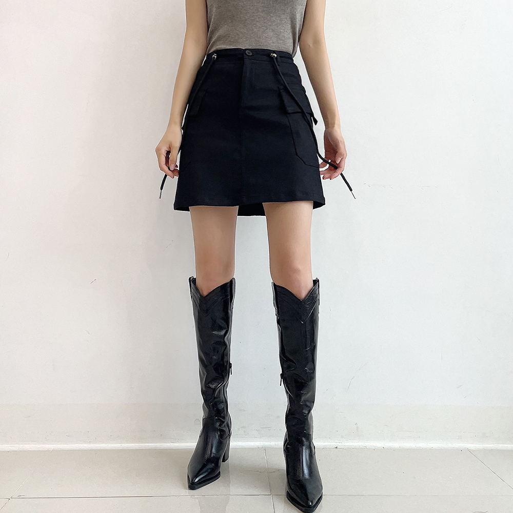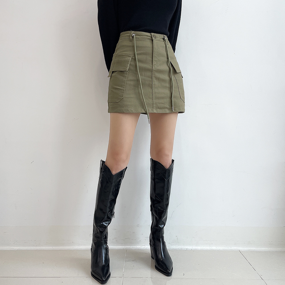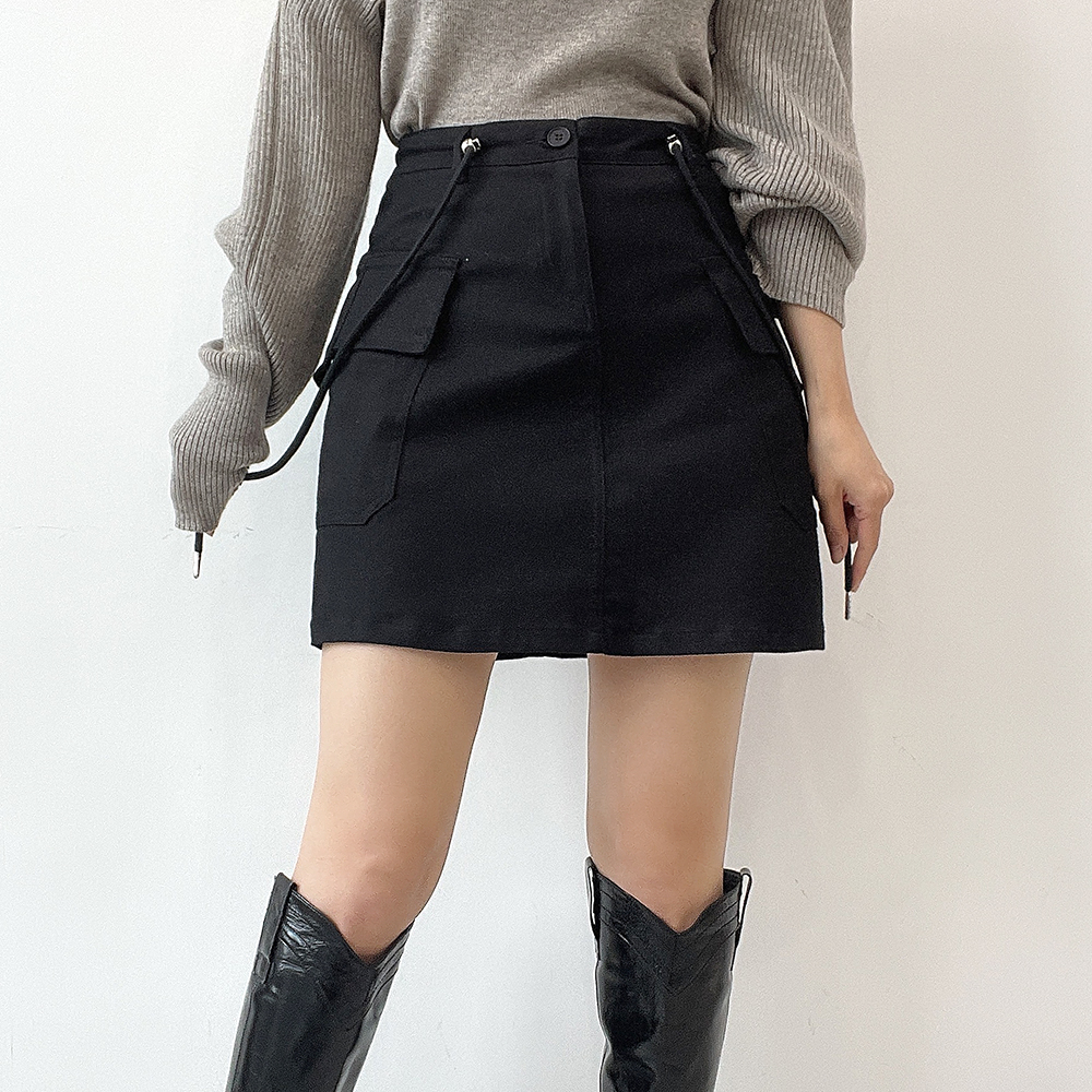 [~2XL/丈選択/パンツ型裏地] ウエストゴムストリングカーゴポケットミニスカート