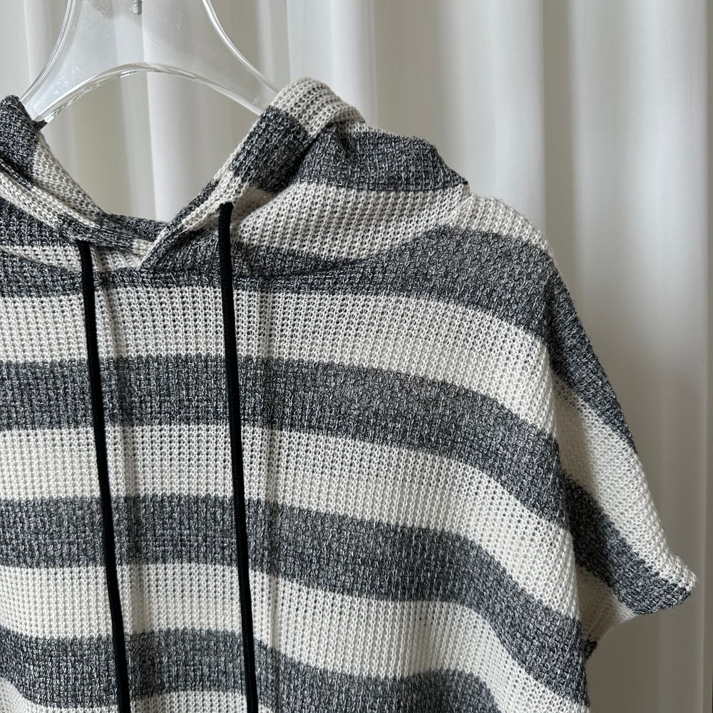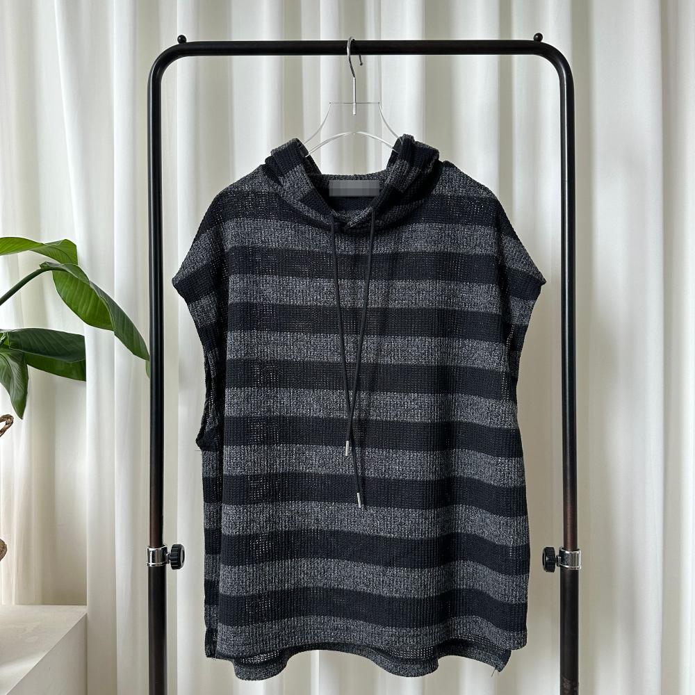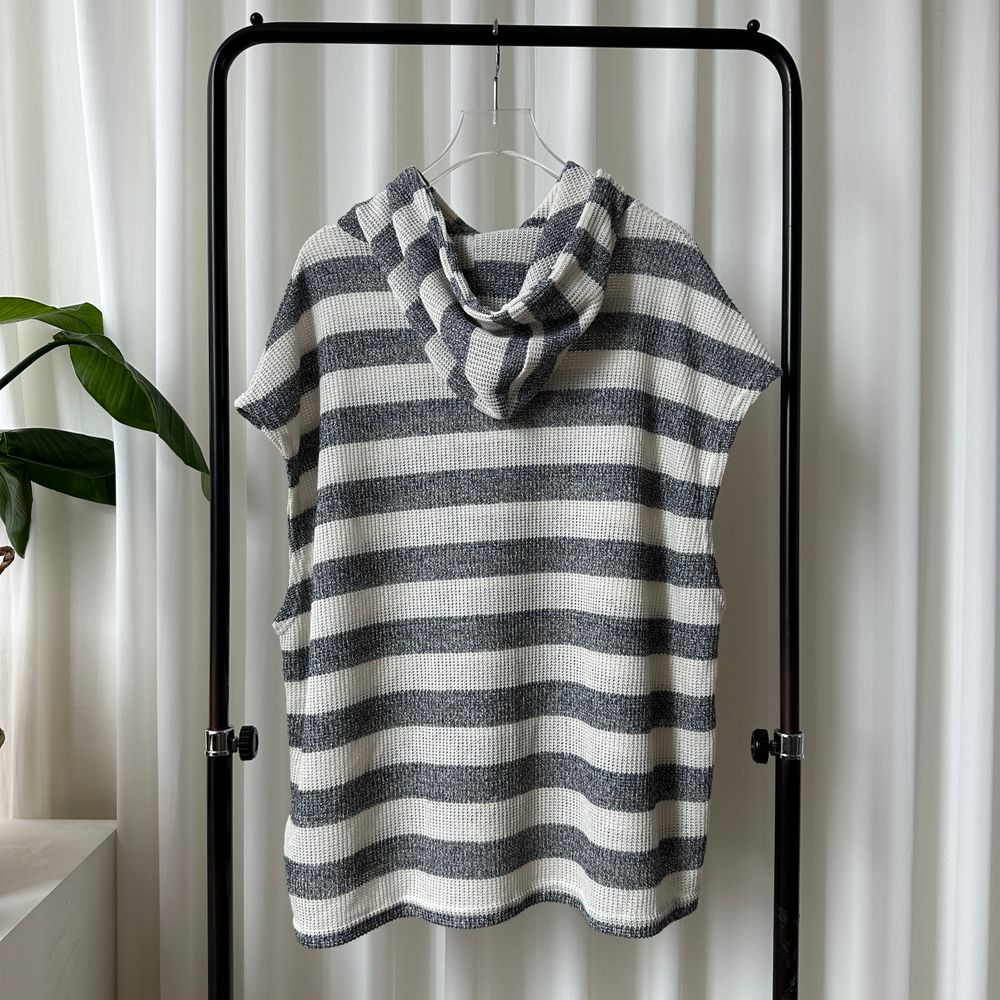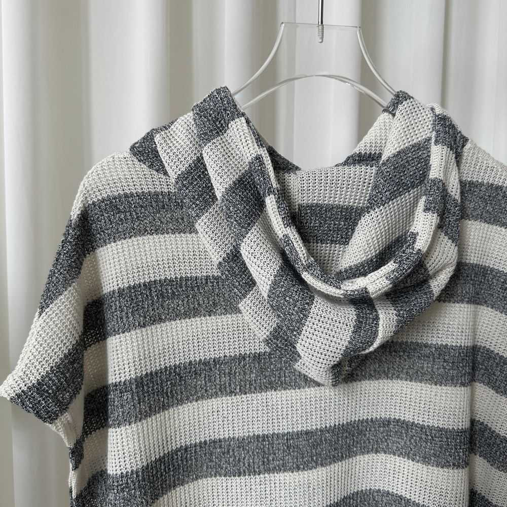 オーバーサイズ透かし編ボーダーフード付きベスト