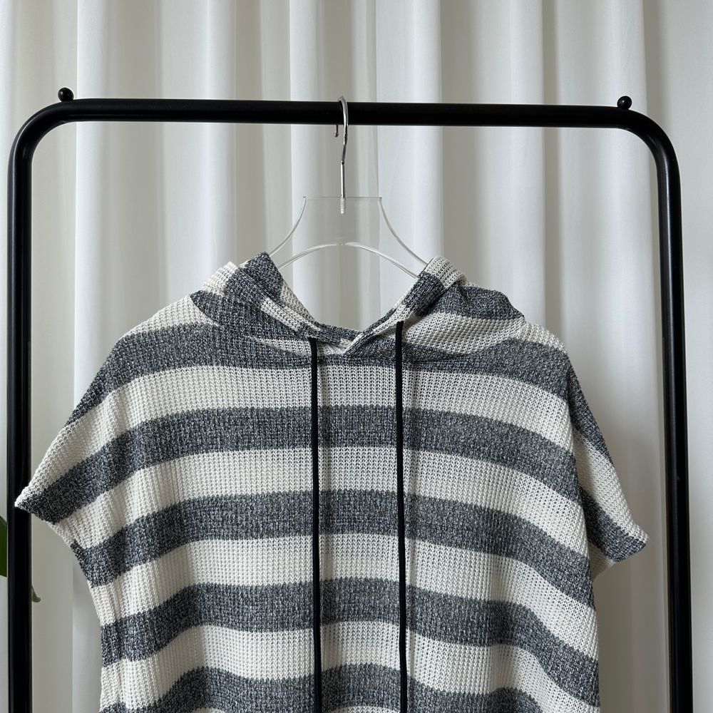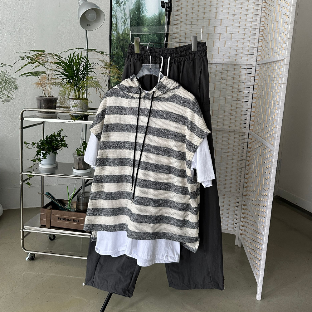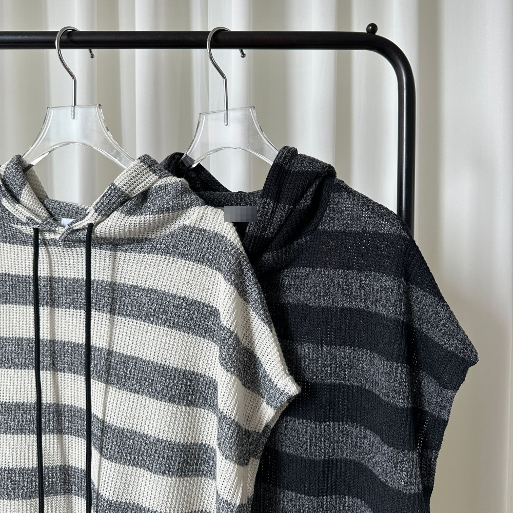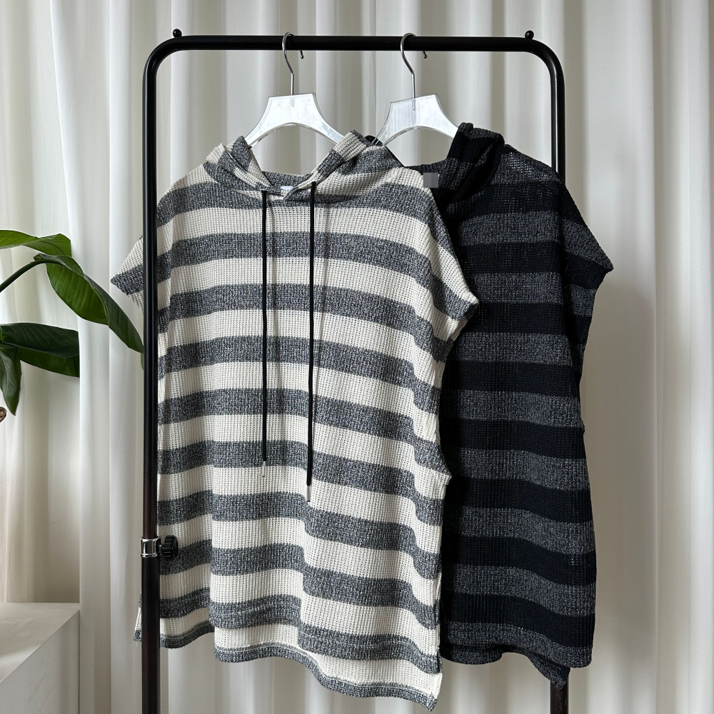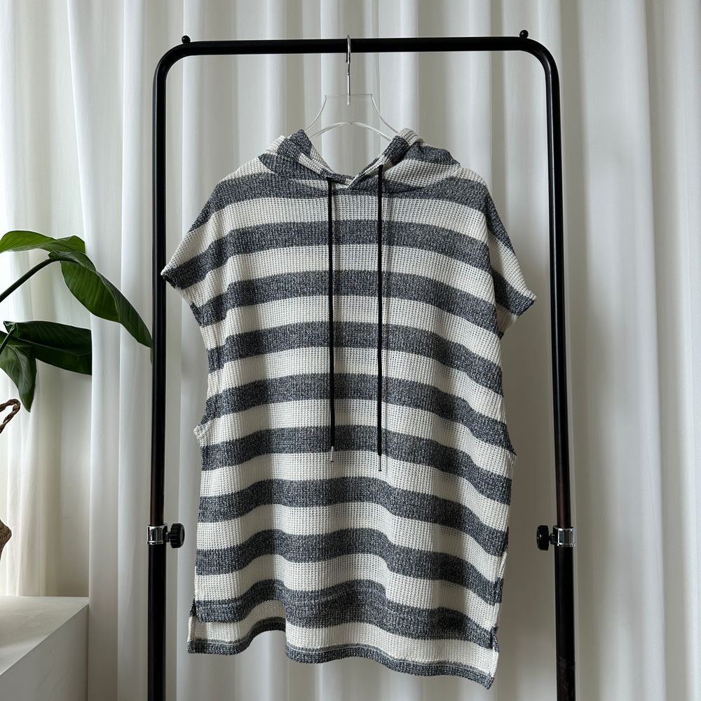 オーバーサイズ透かし編ボーダーフード付きベスト