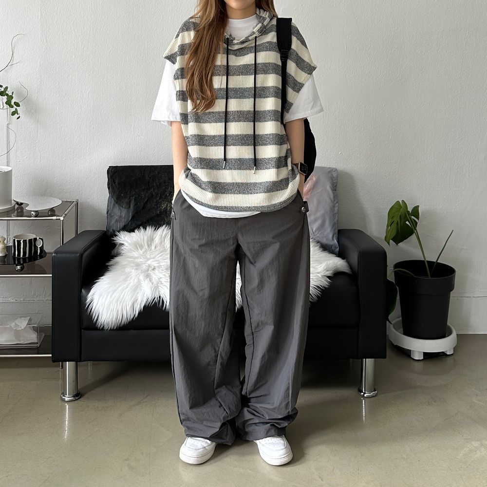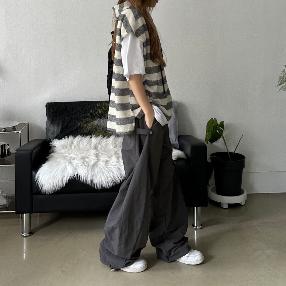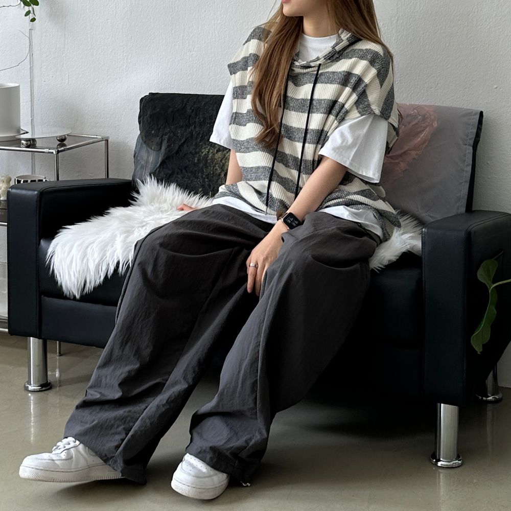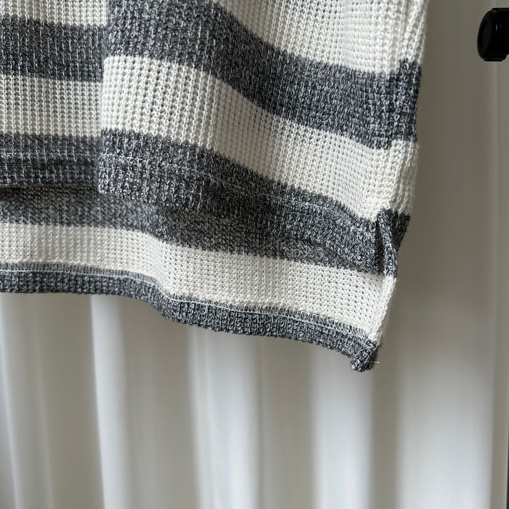 オーバーサイズ透かし編ボーダーフード付きベスト
