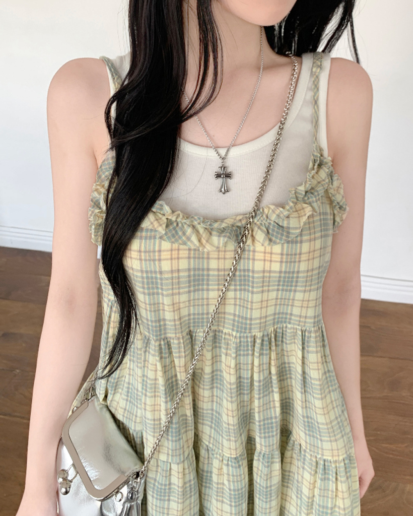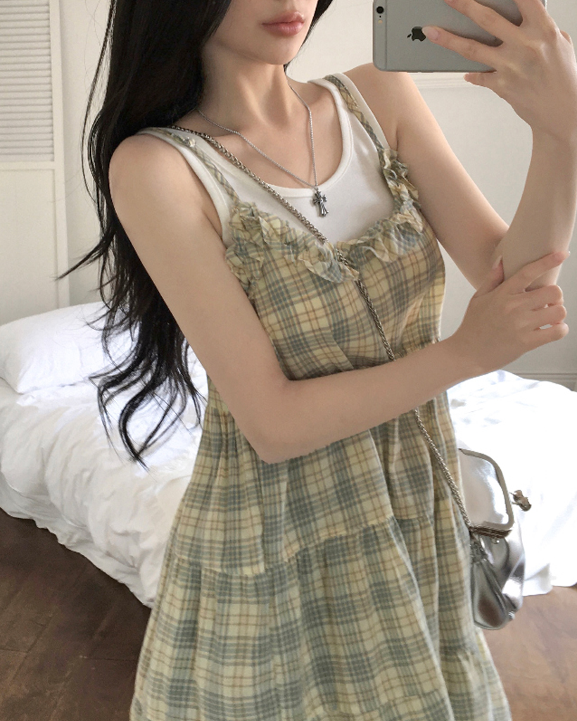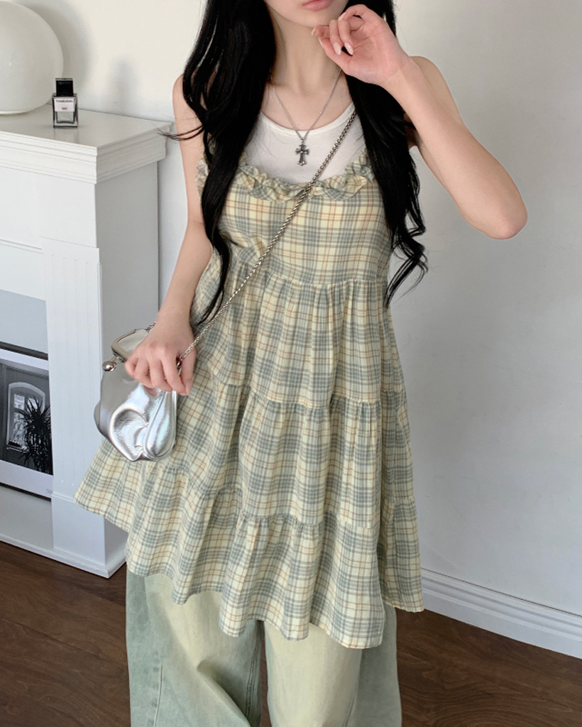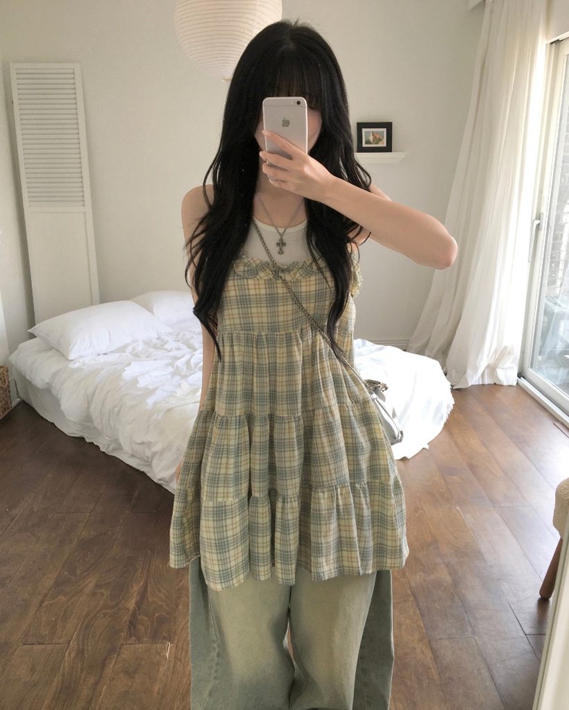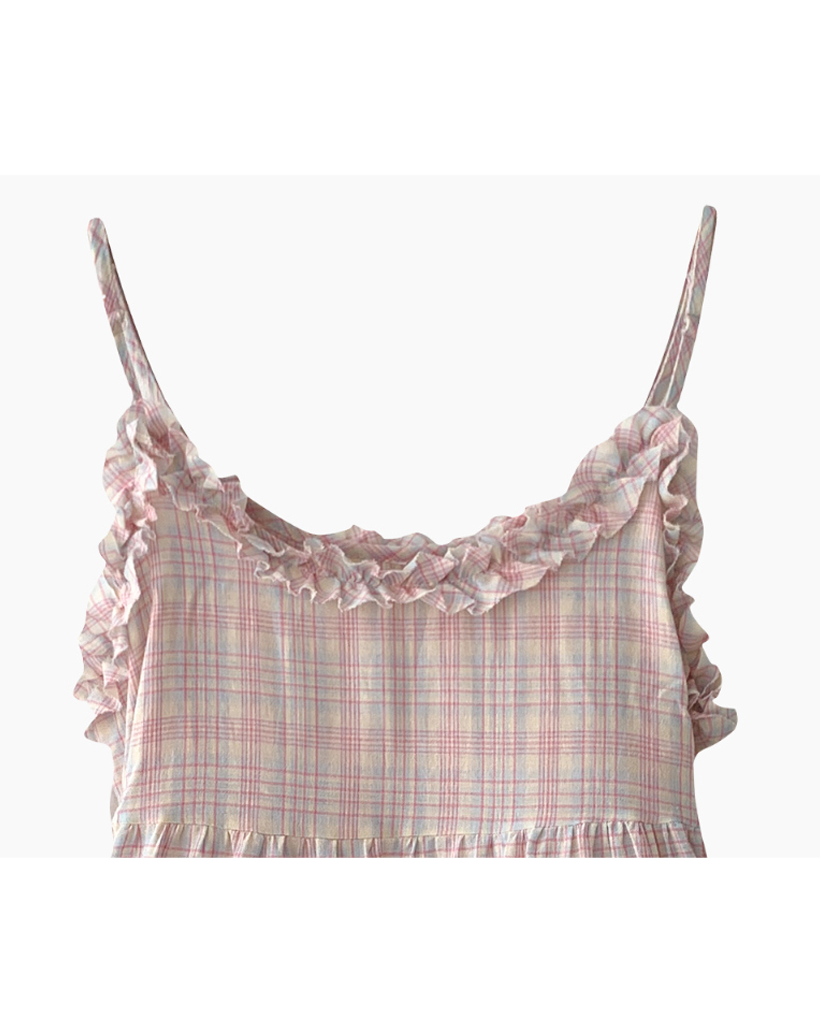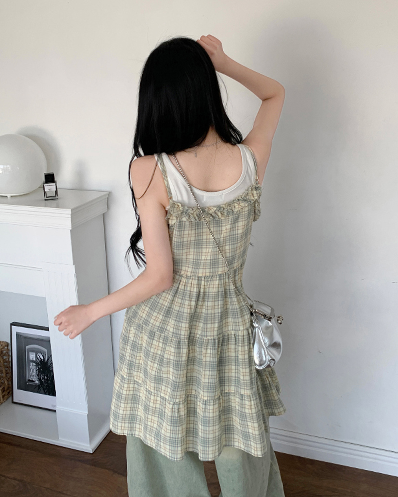 ヴィンテージ チェック フリル ティアード ミニ キャミワンピース