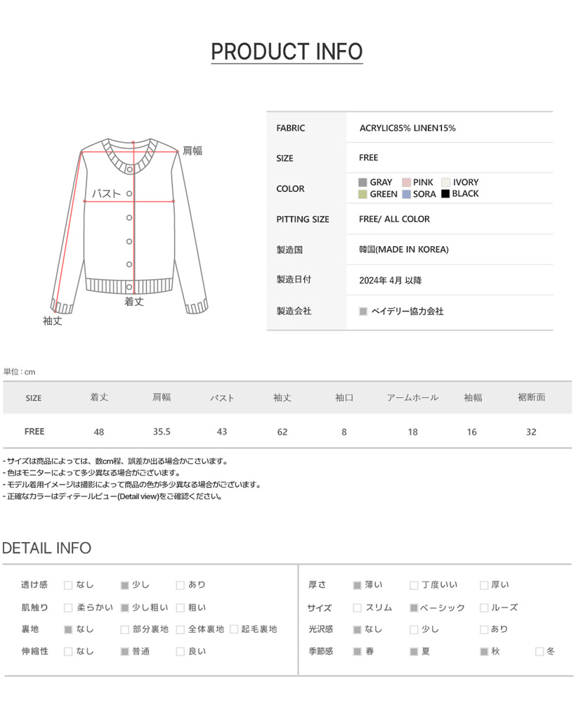 肩断面35.5 バスト43 袖丈62 袖断面8 アームホール18 袖幅16 裾断面32 着丈48