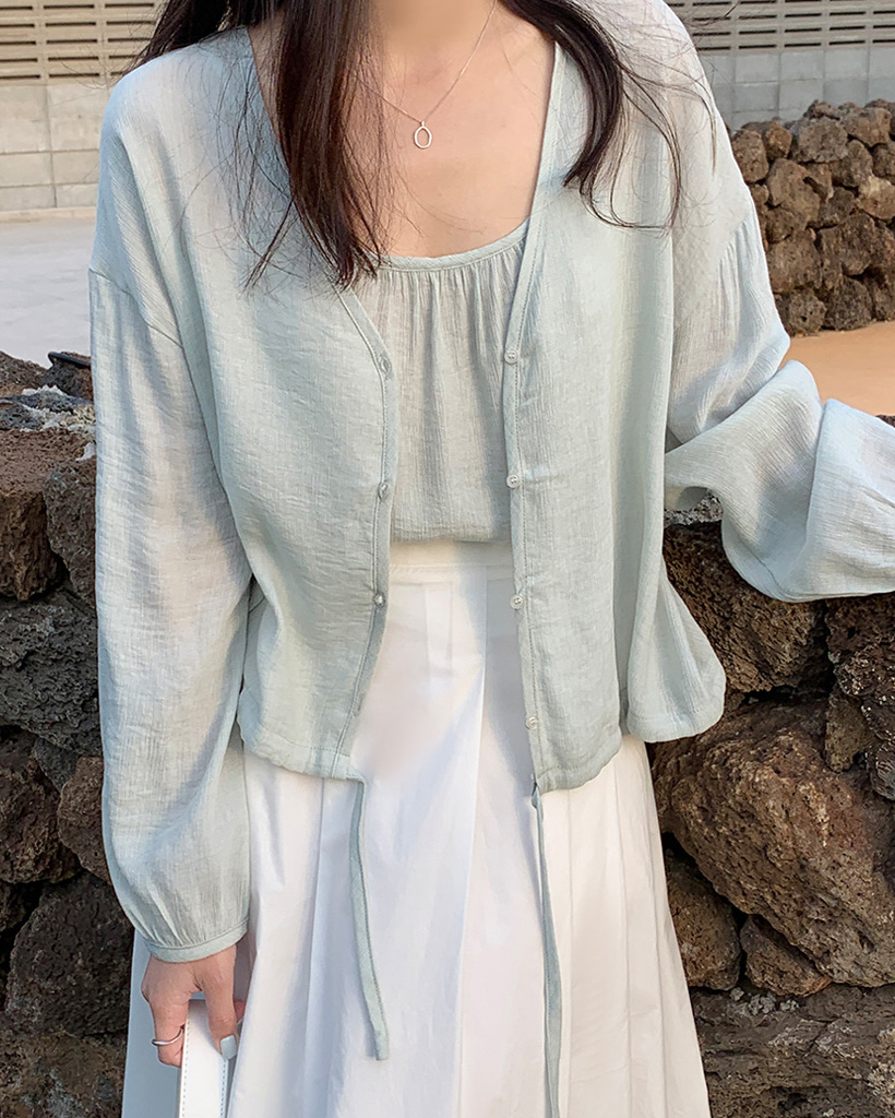 [original/S-XL/SET]シャーリングノースリーブVネックカーディガンセット
