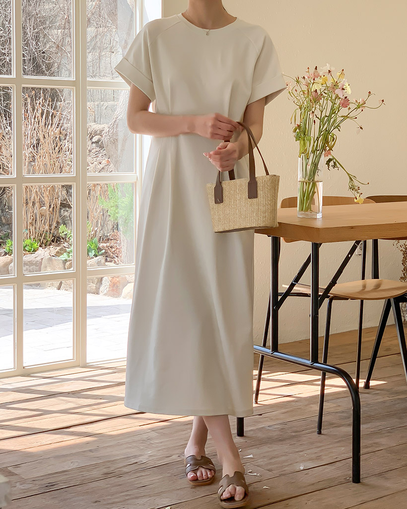 ピンタックロールアップラウンドネックロングワンピースドレス