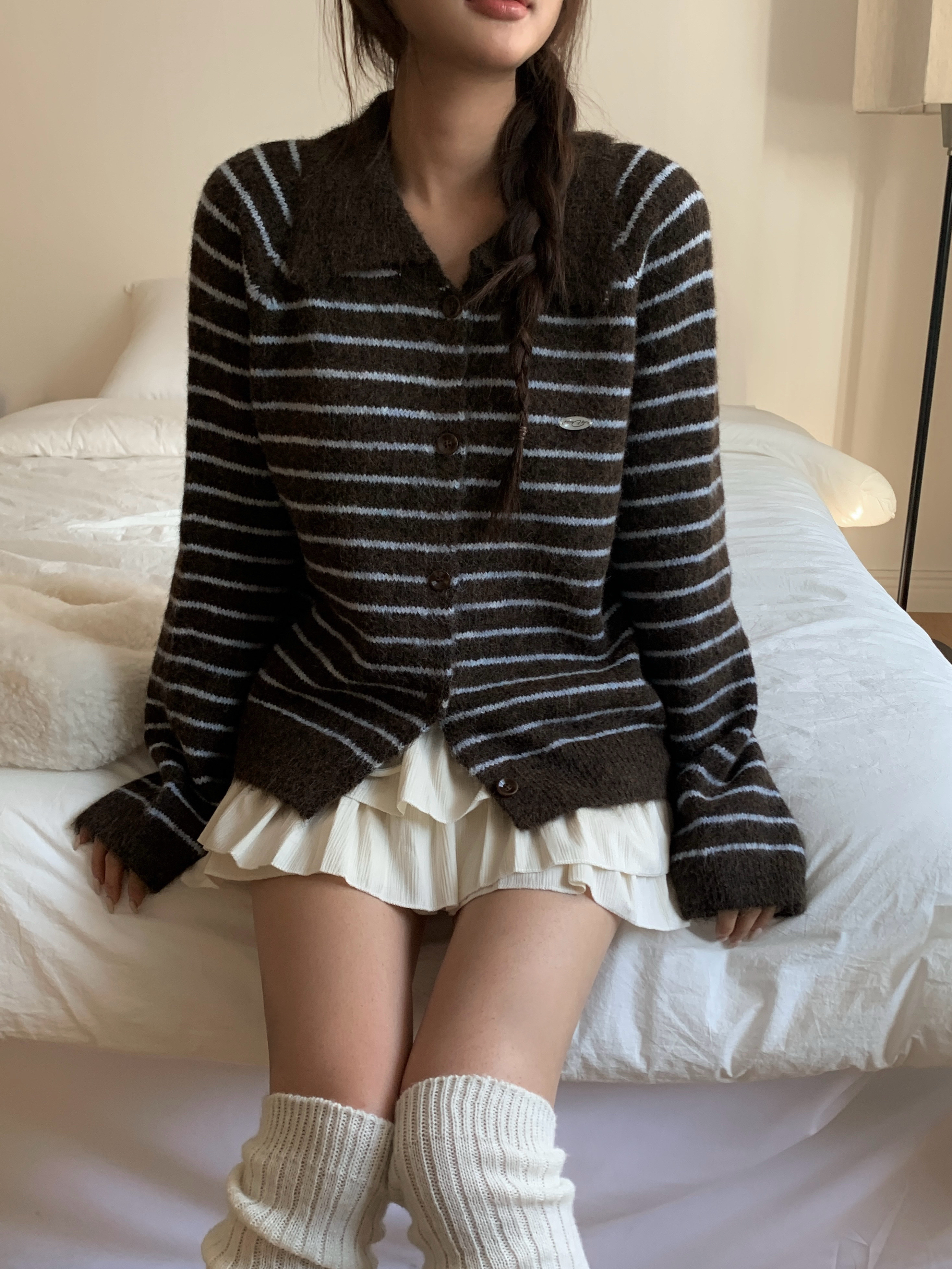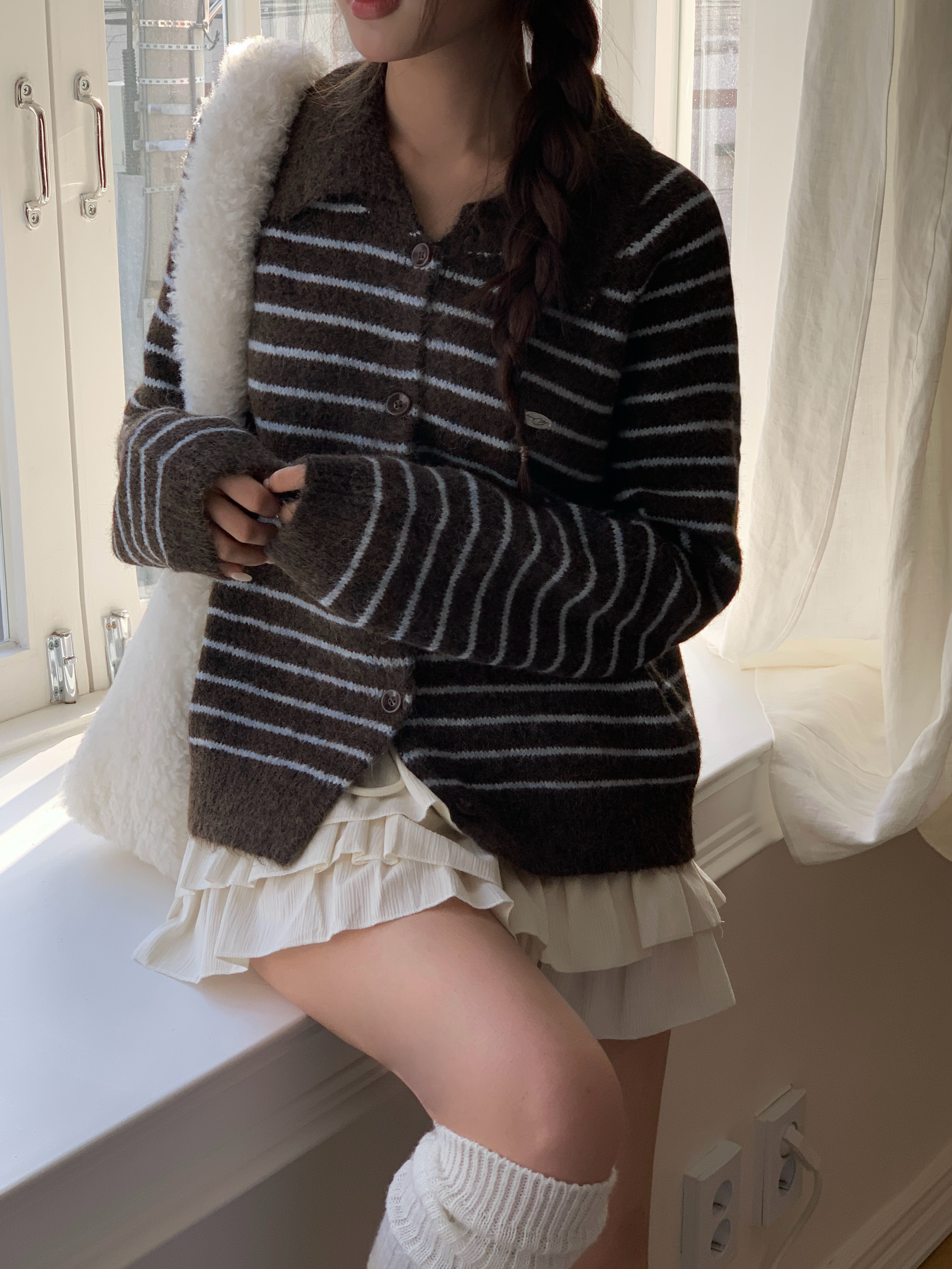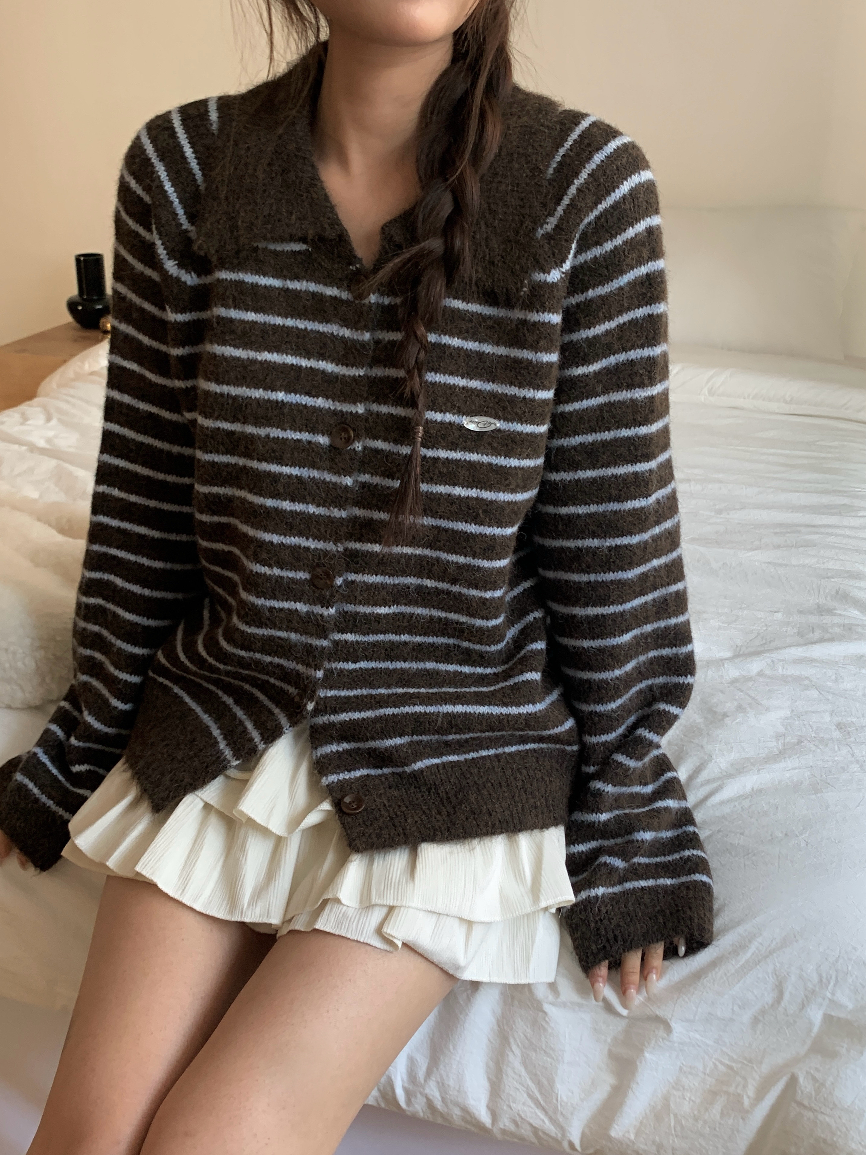 ボーダー柄ペンダント襟付きニットカーディガン