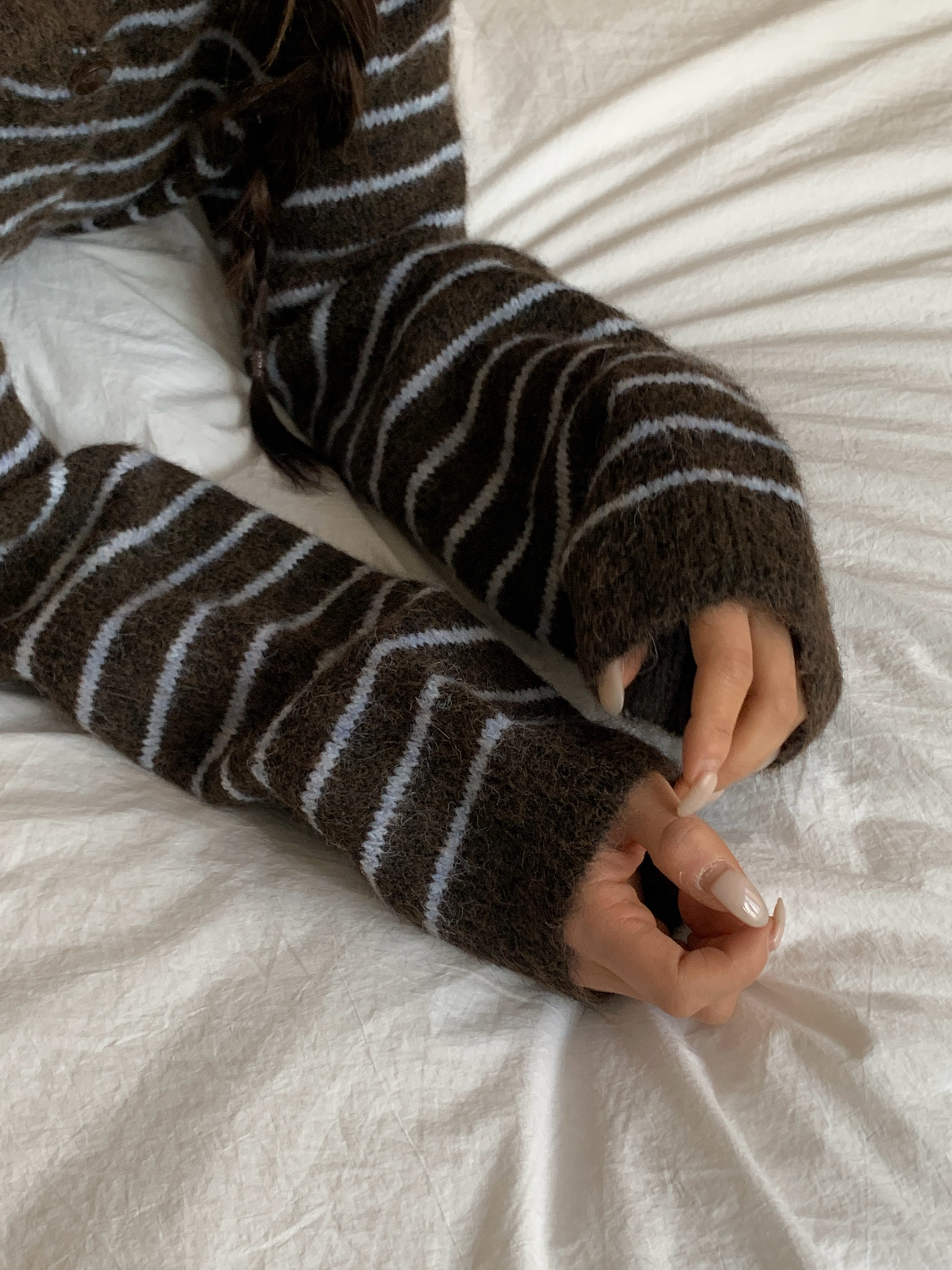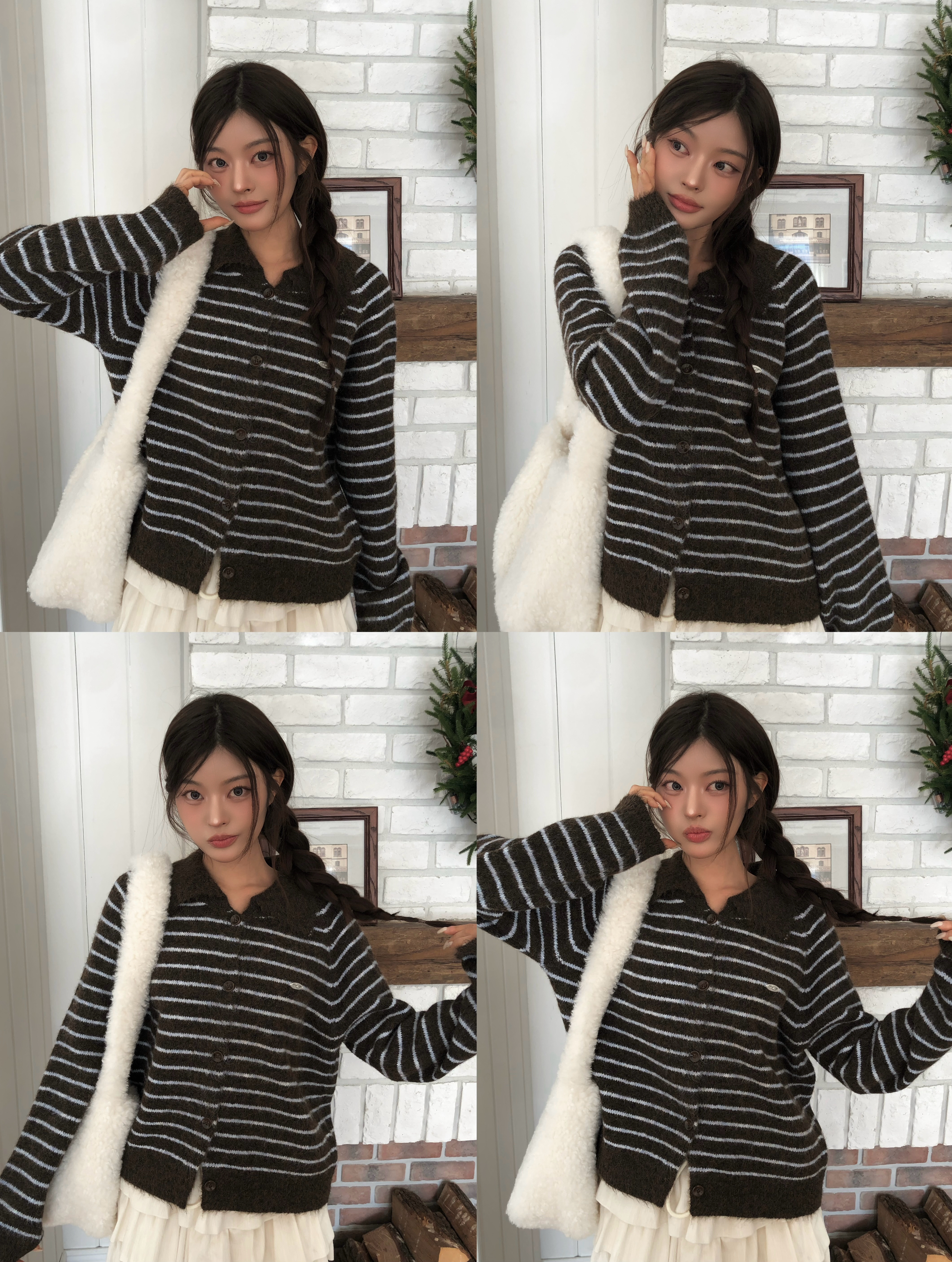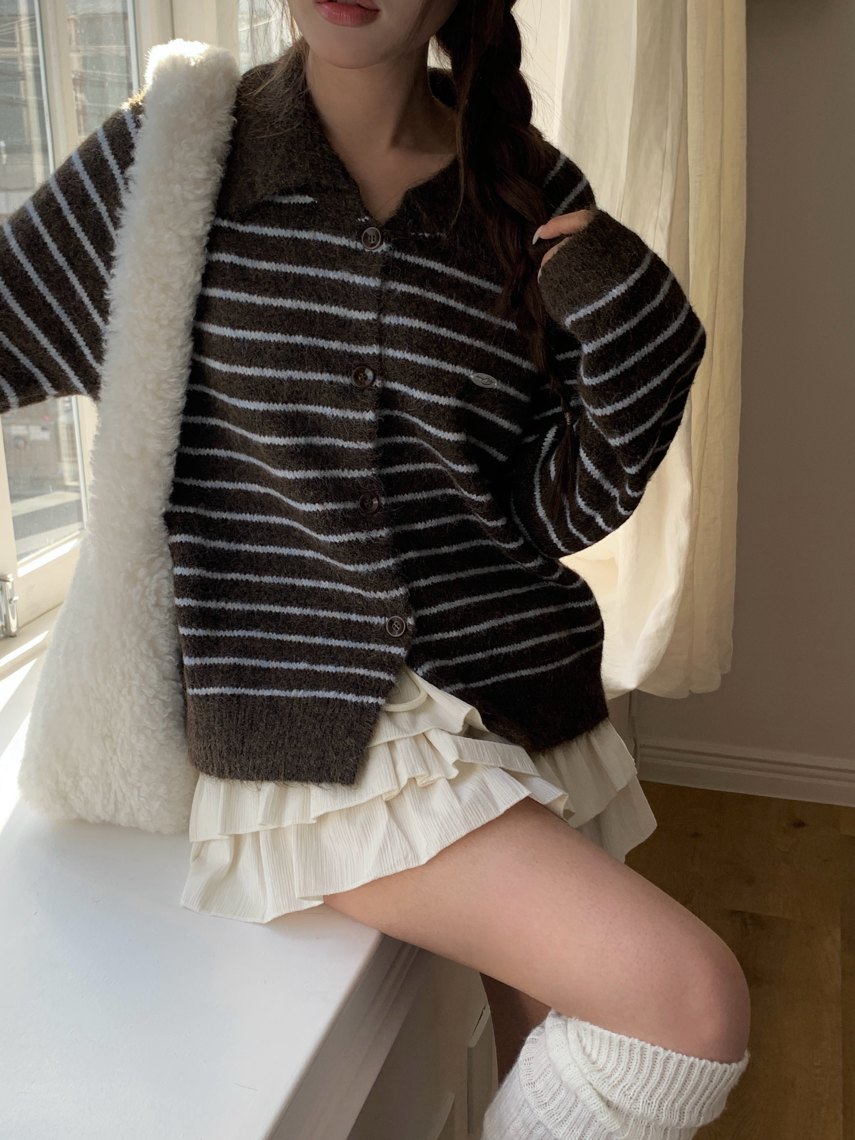 ボーダー柄ペンダント襟付きニットカーディガン