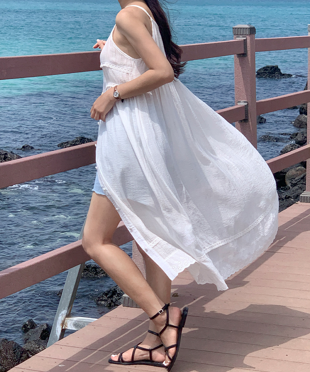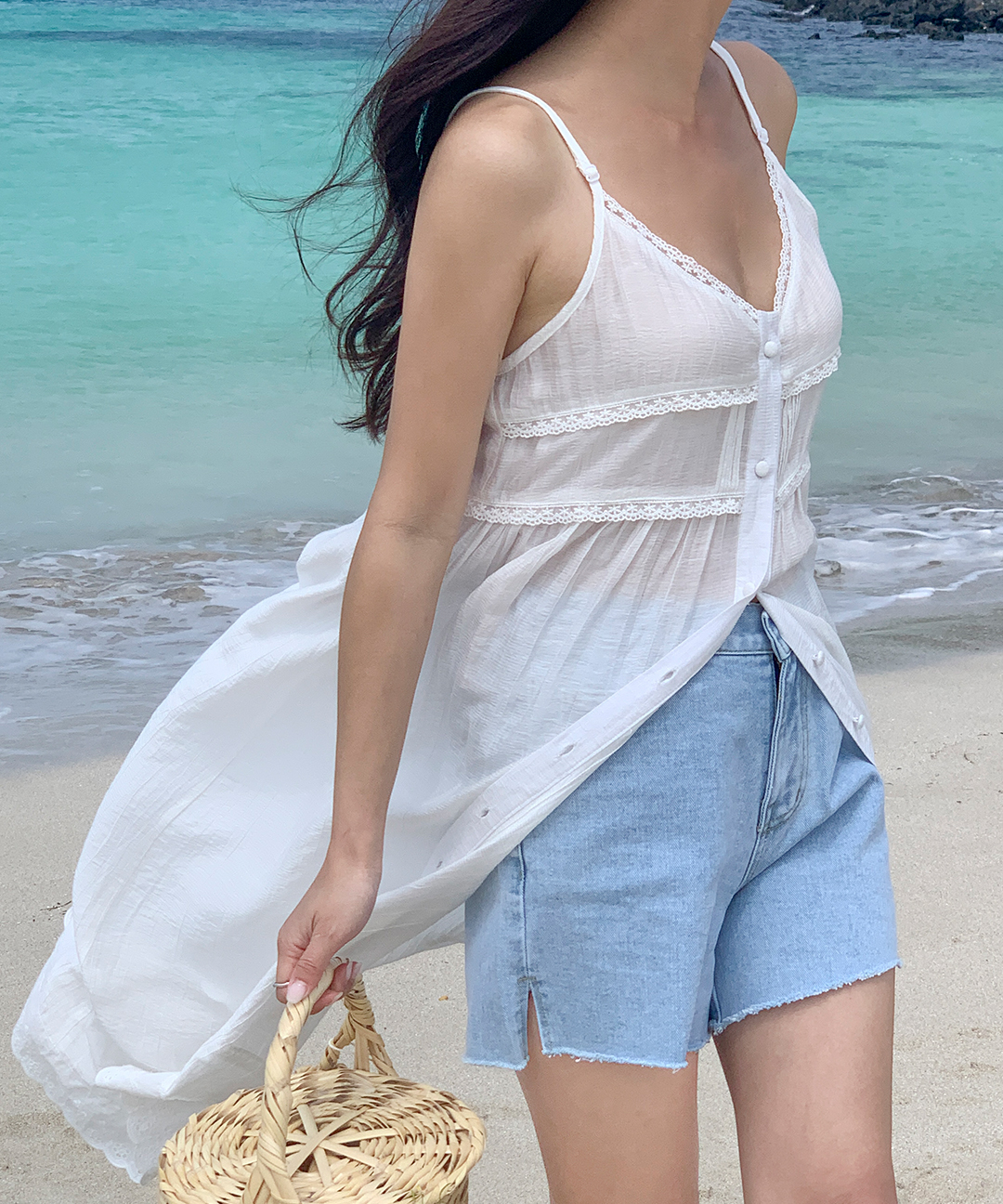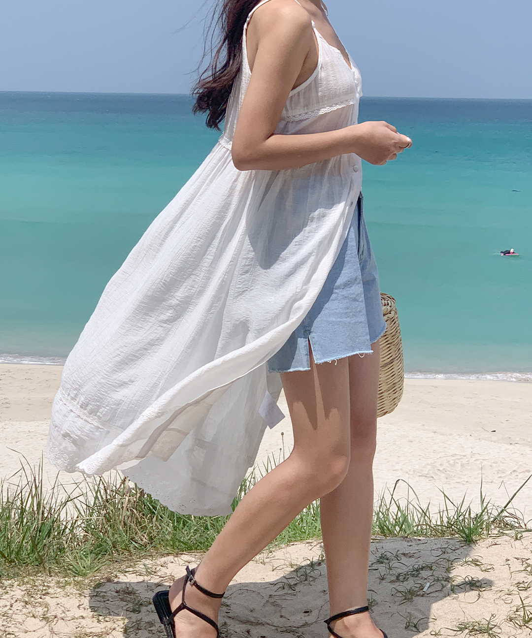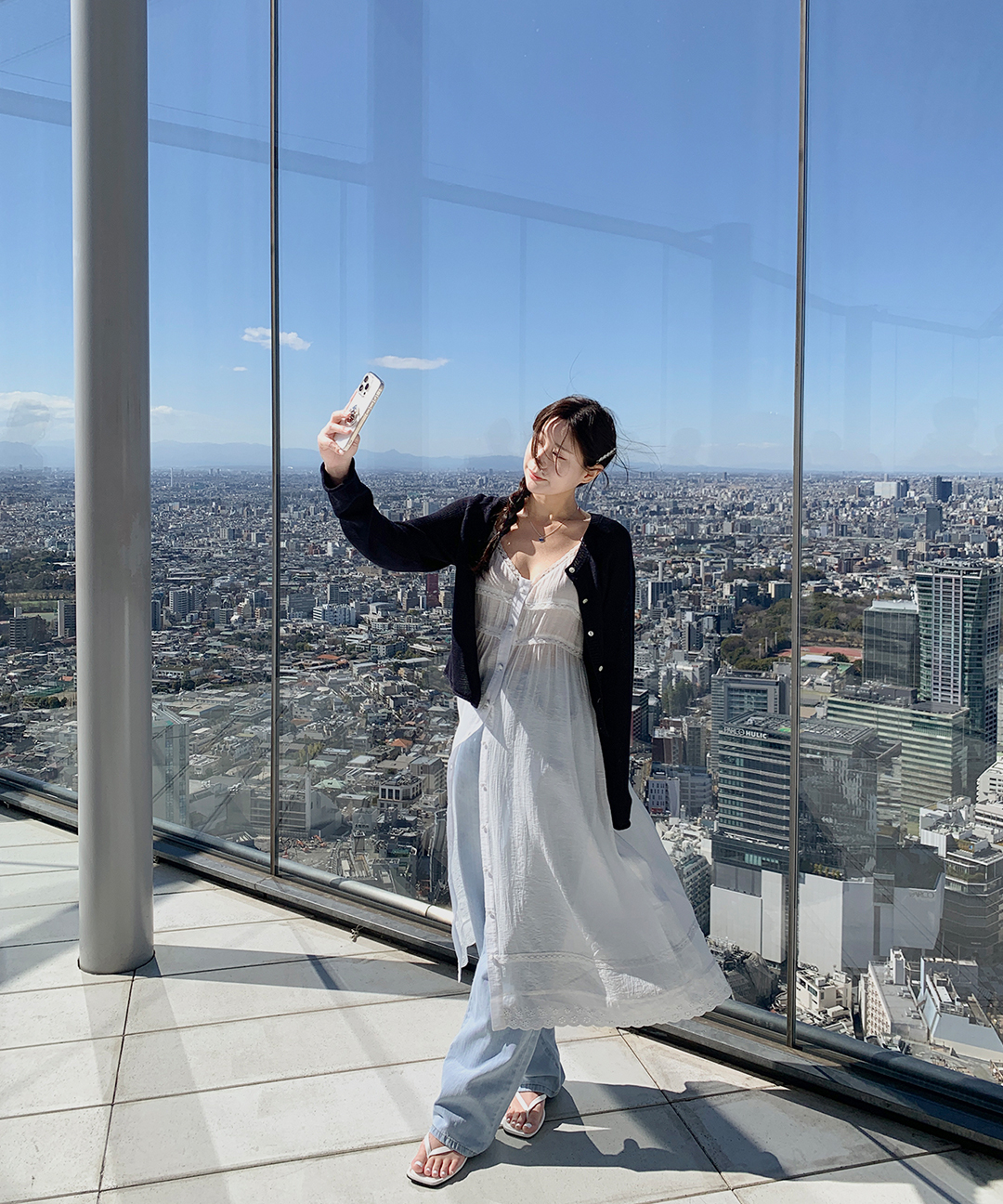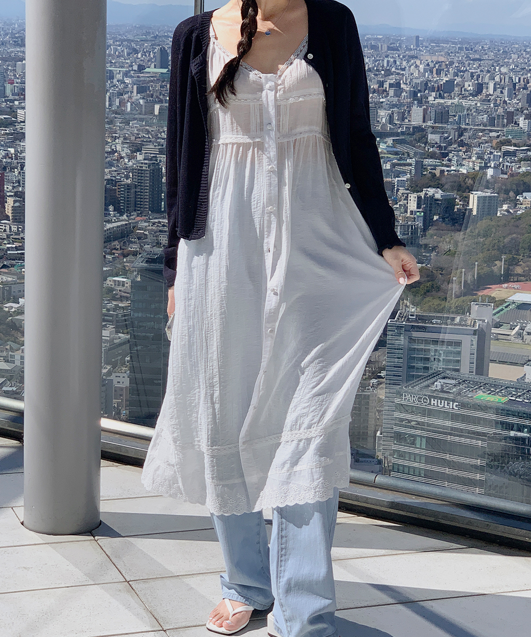 胸元から裾にかけて並んだボタンディテールがポイントで、