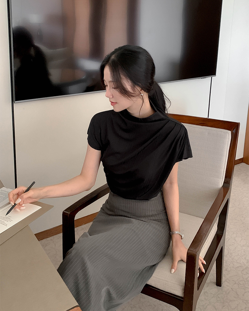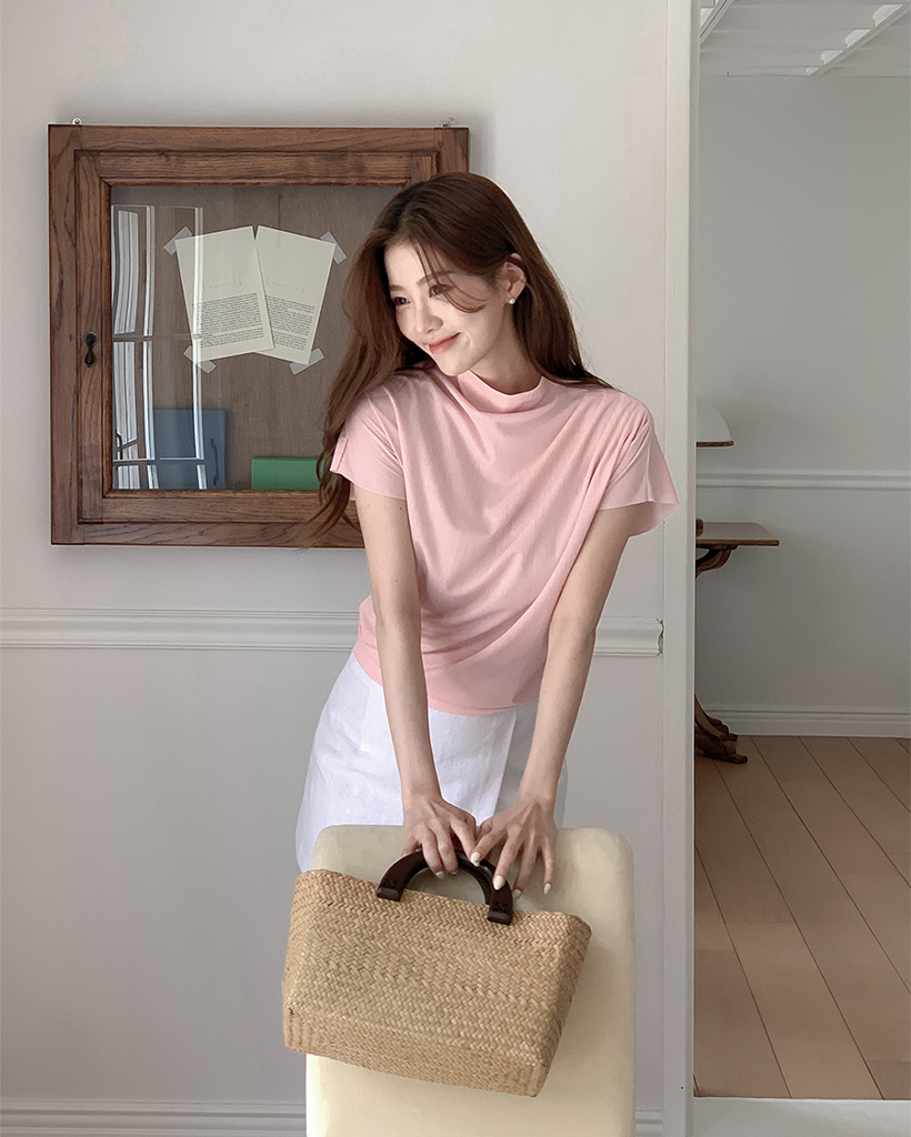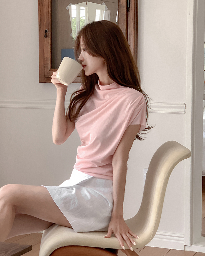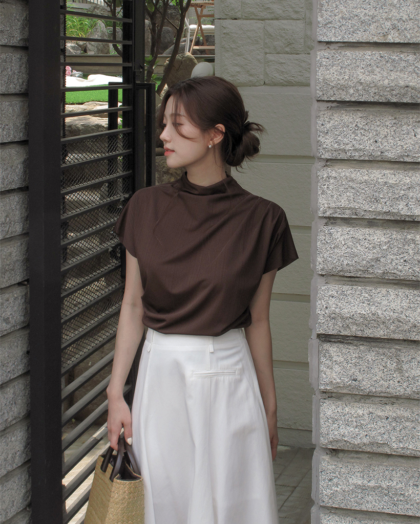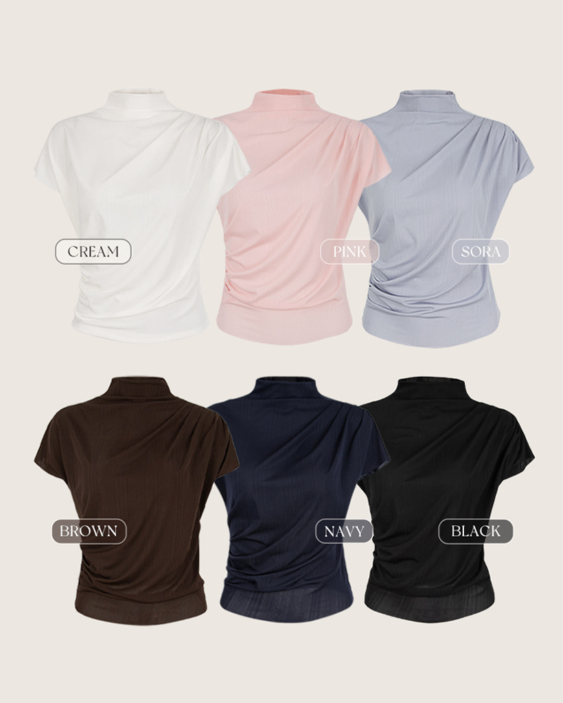 (6color) ハイネック ドレープ シャーリング ブラウス トップス
