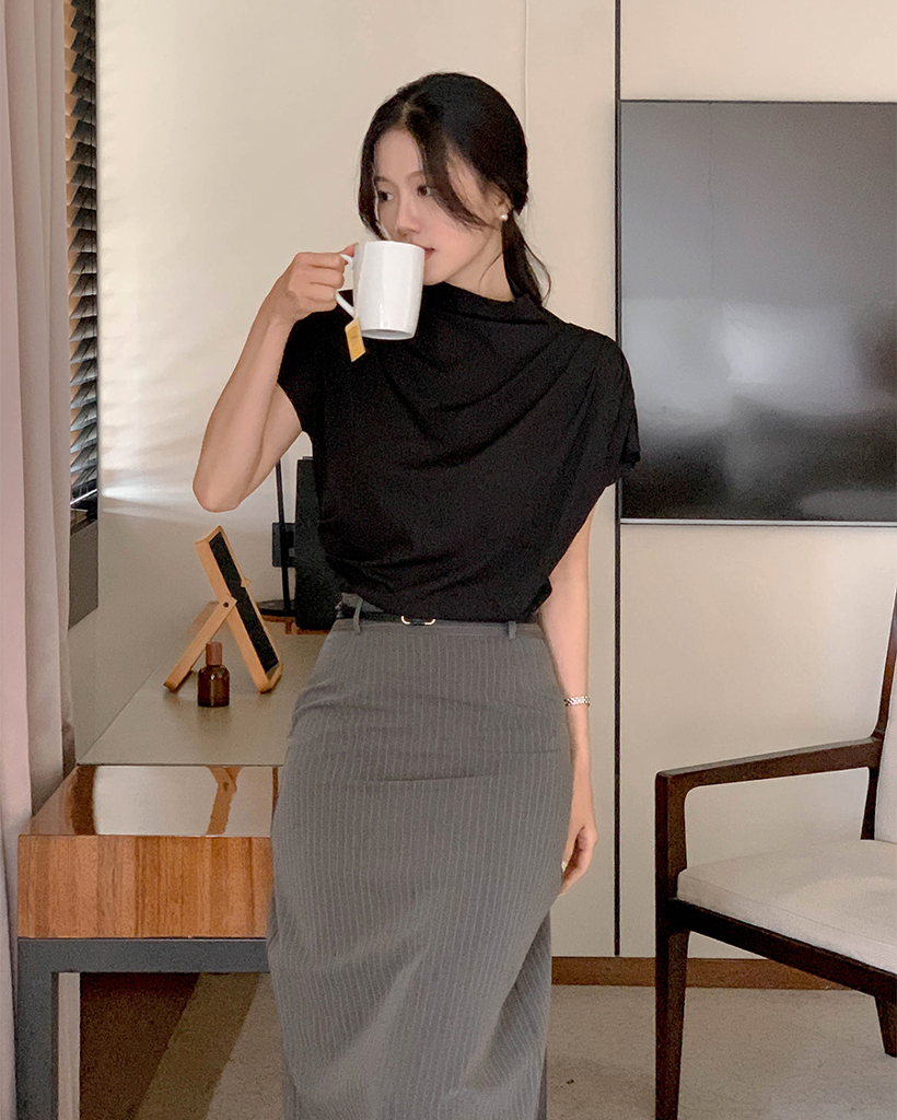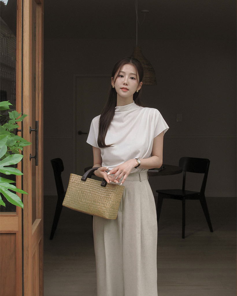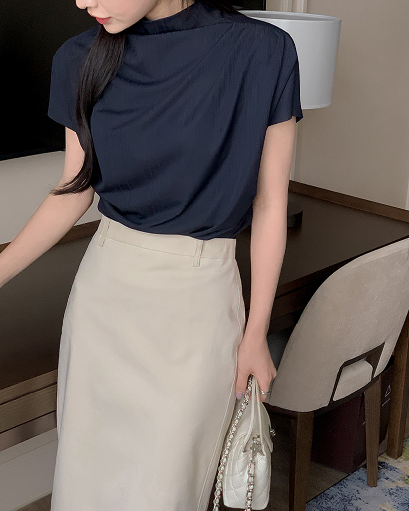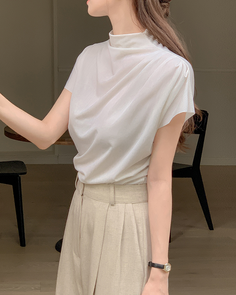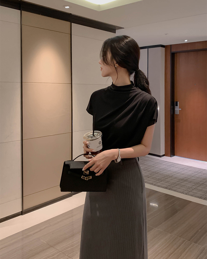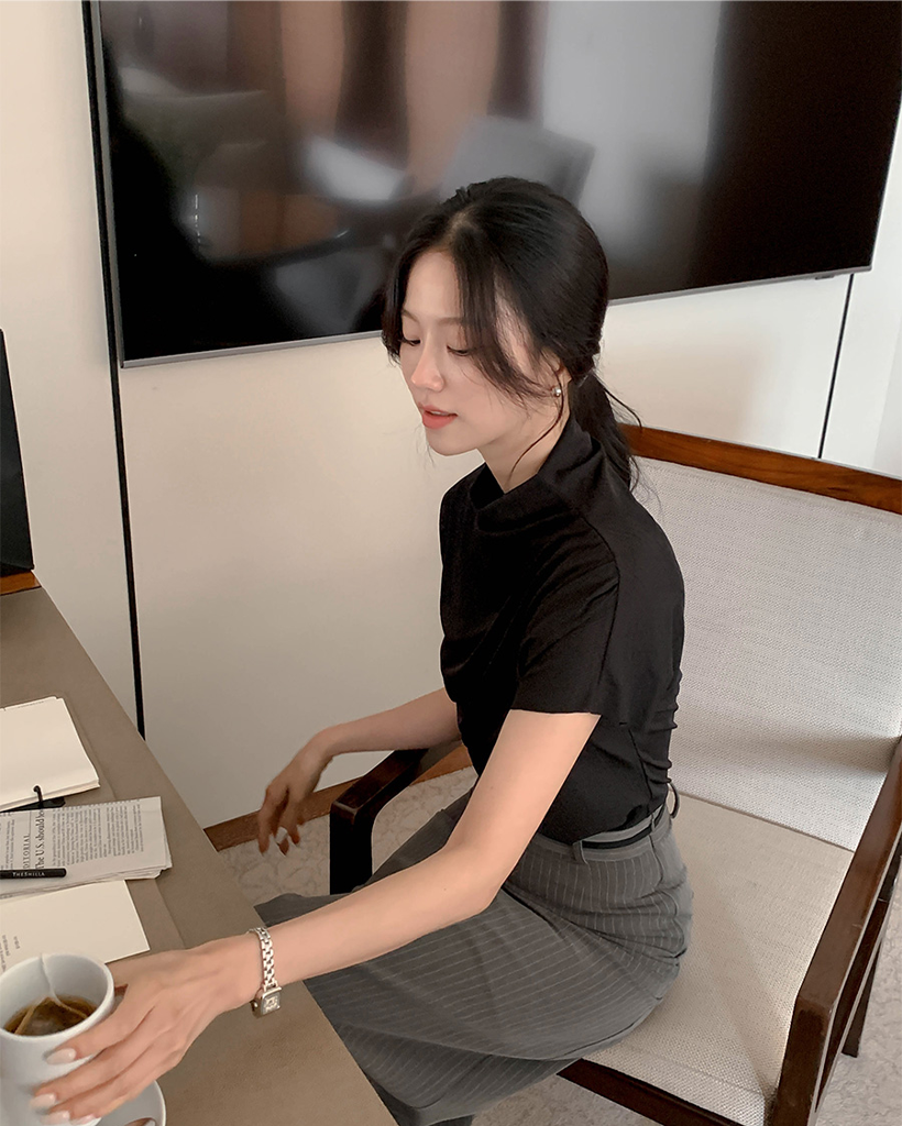 (6color) ハイネック ドレープ シャーリング ブラウス トップス