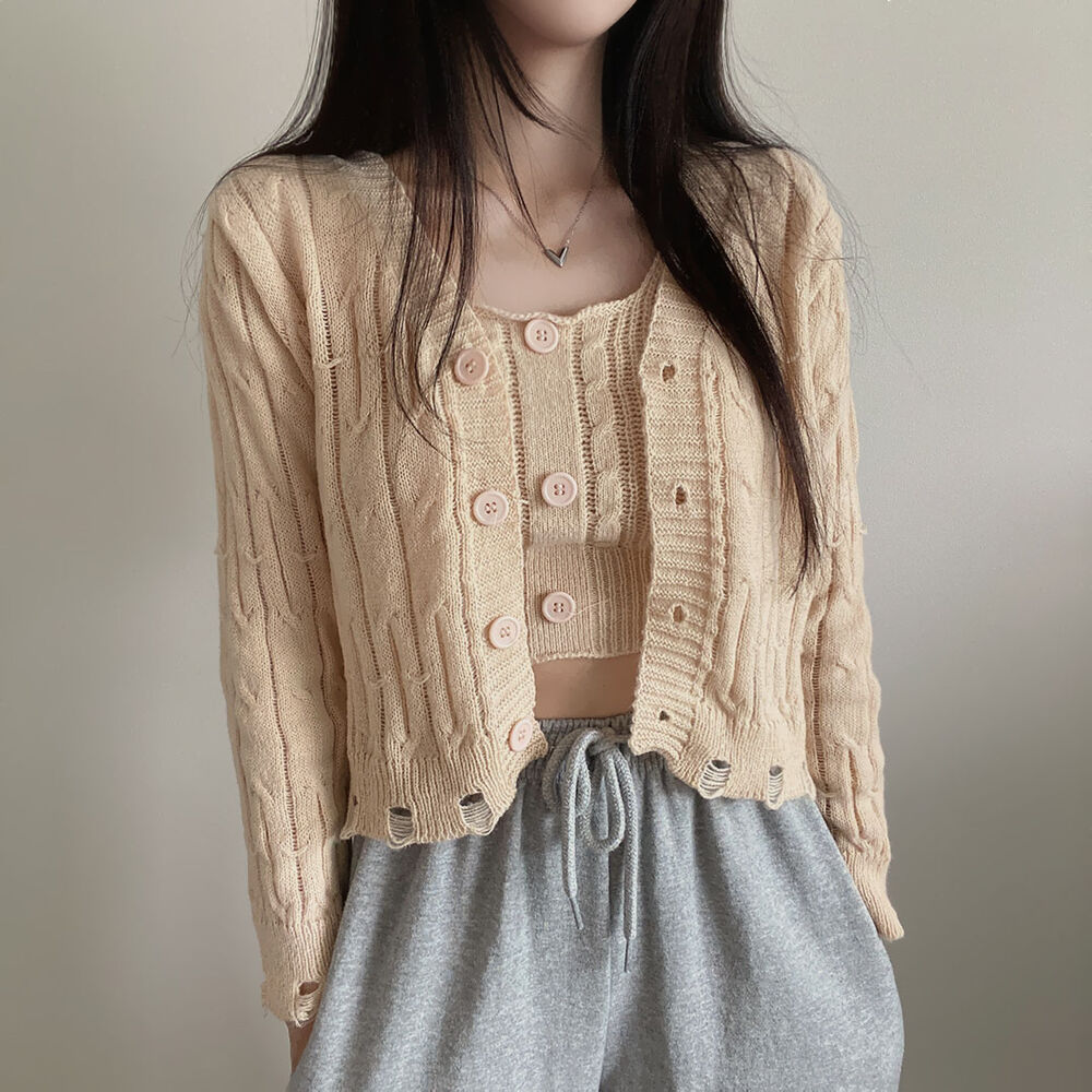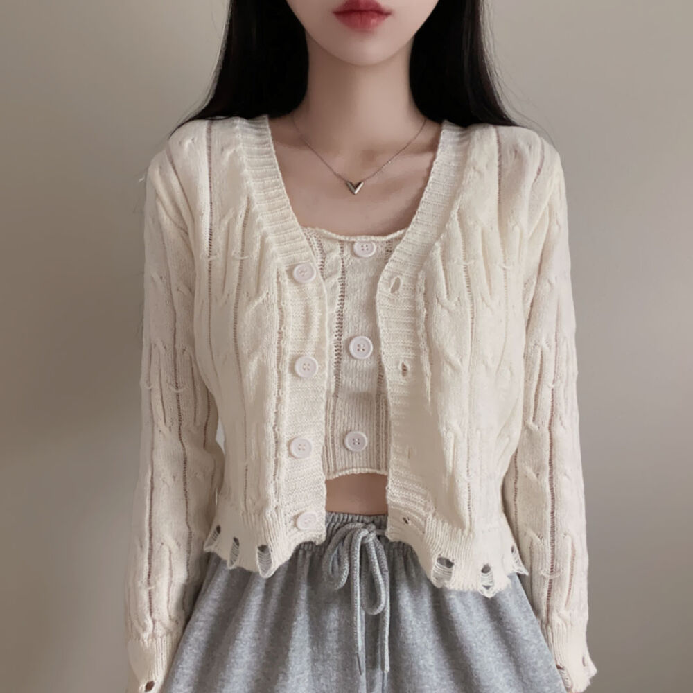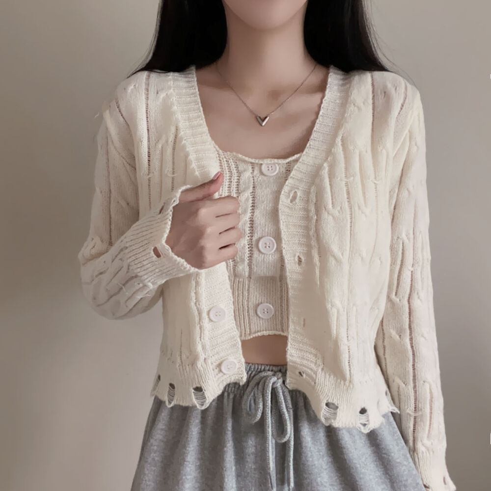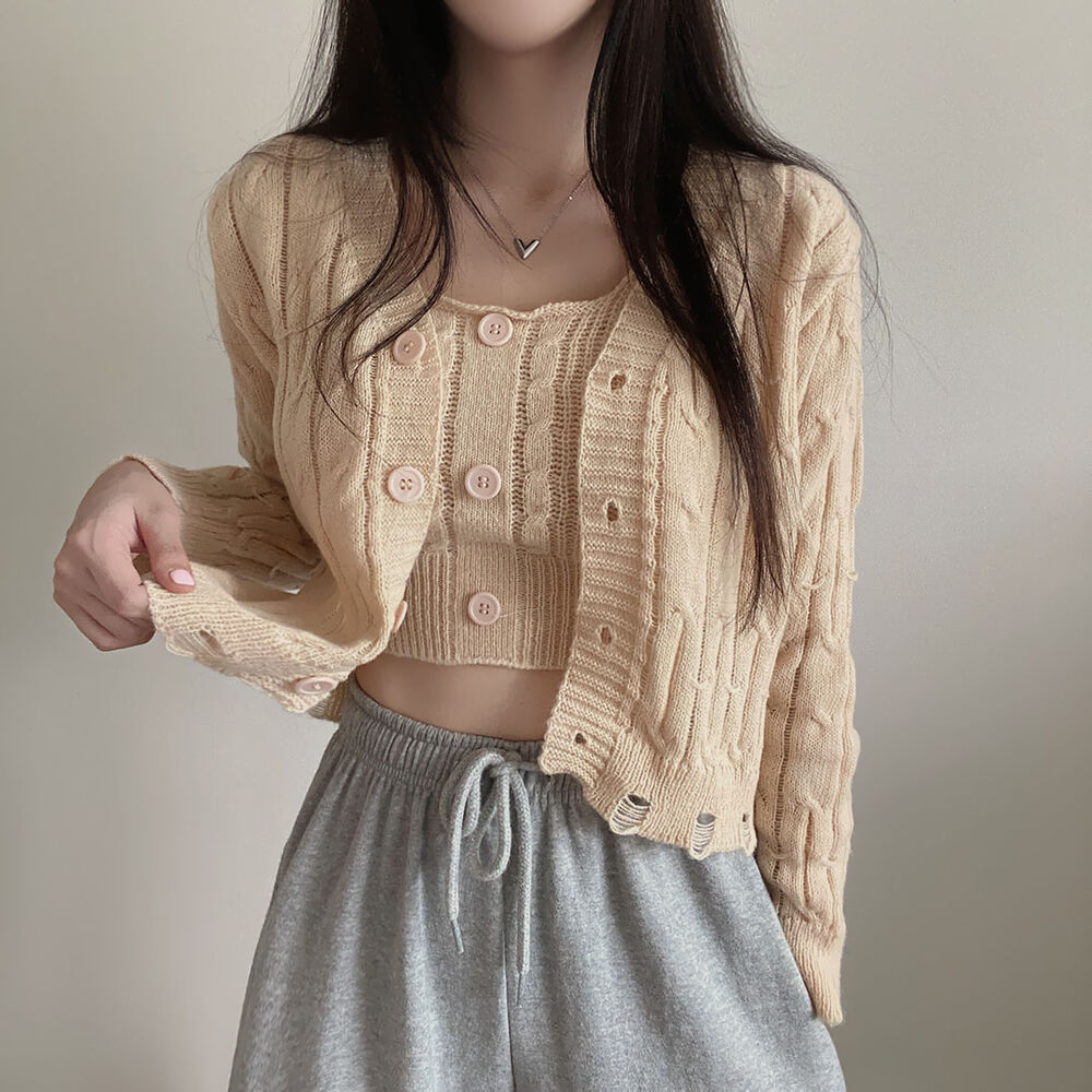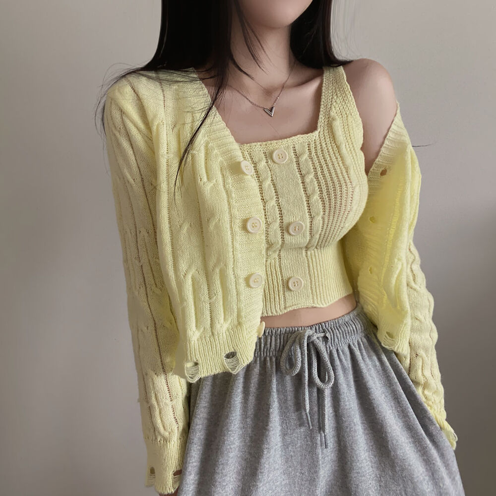 (SET)クロップドダメージニットキャミソール+カーディガン