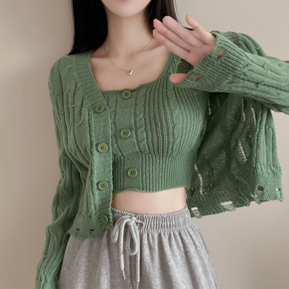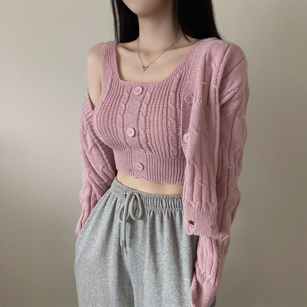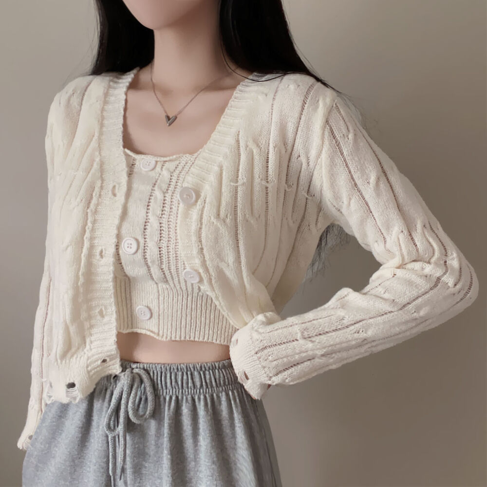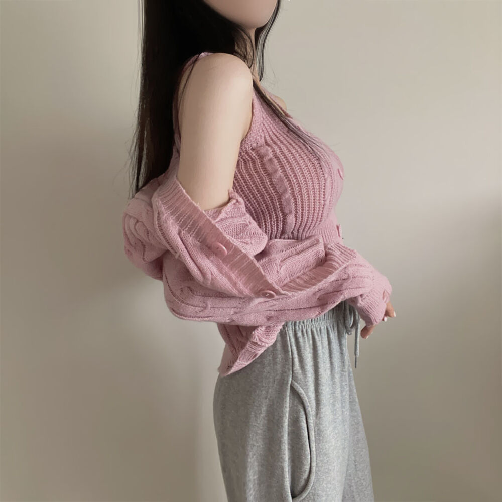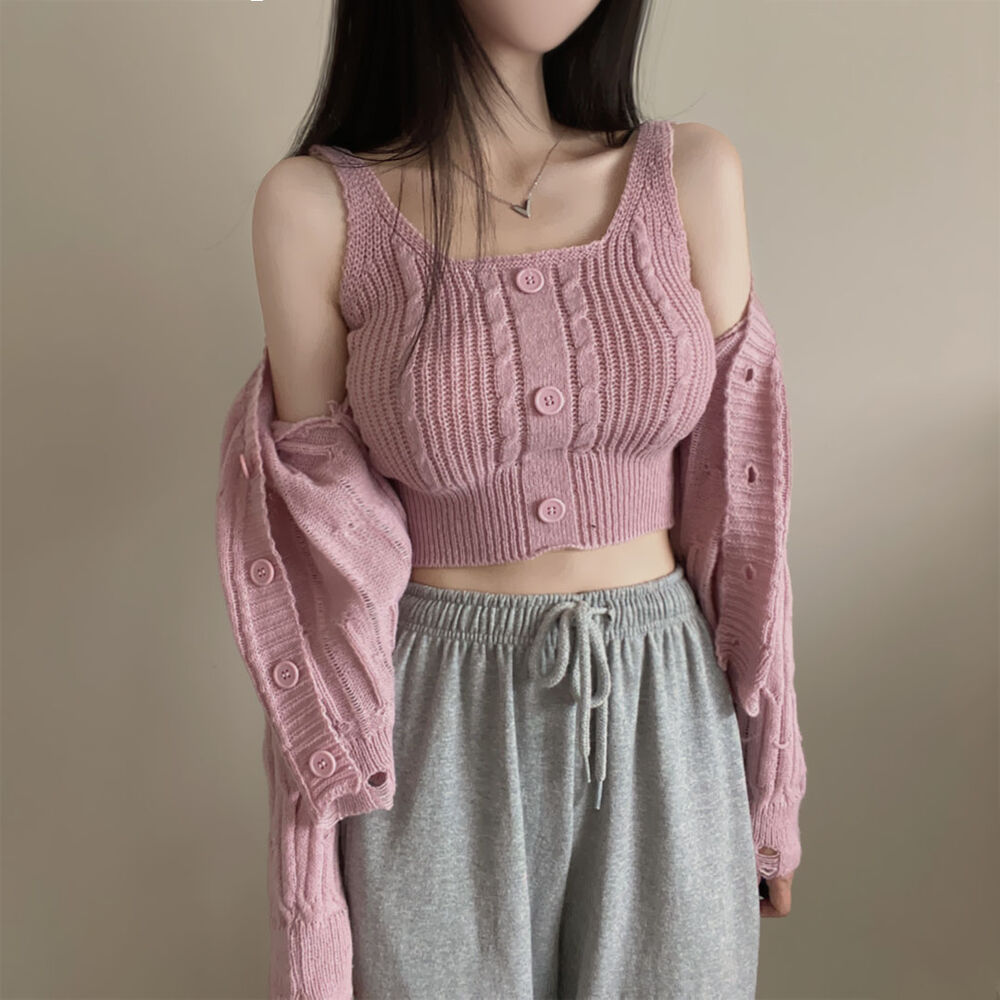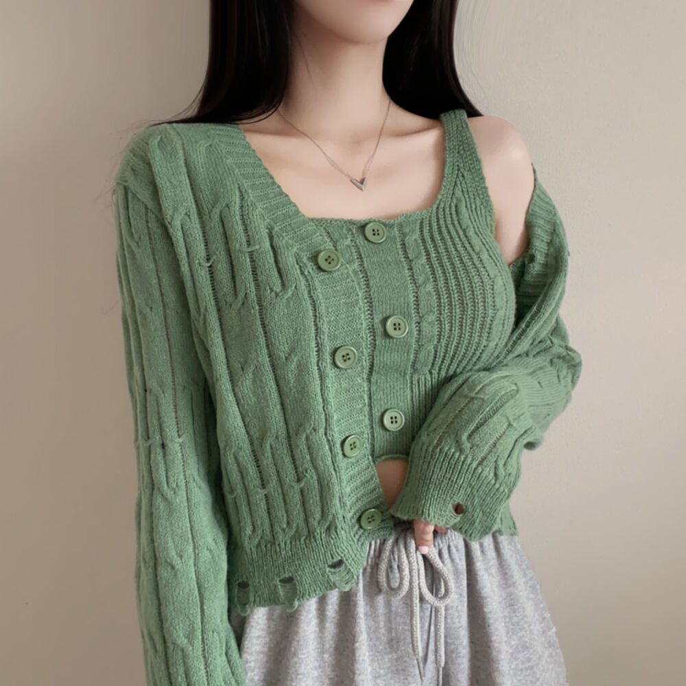 (SET)クロップドダメージニットキャミソール+カーディガン