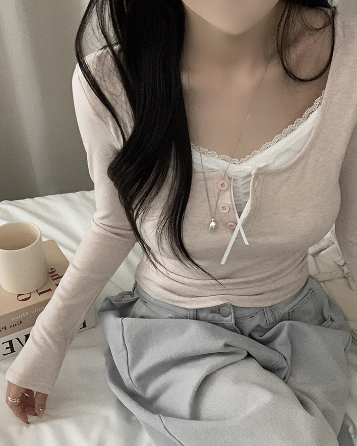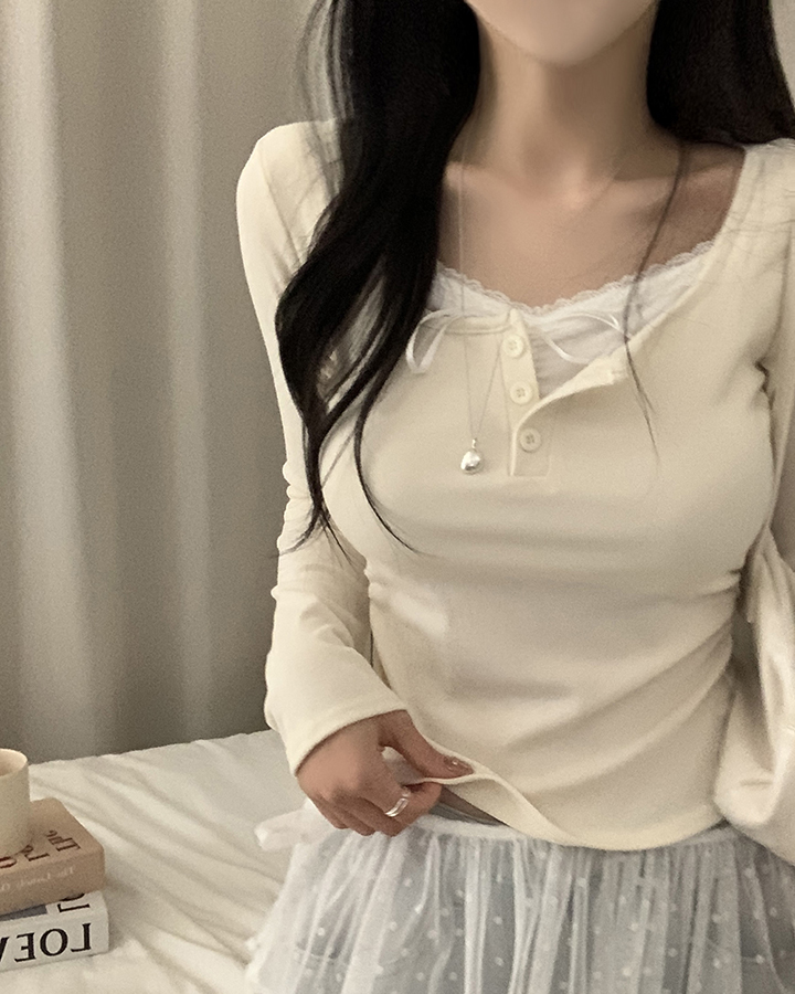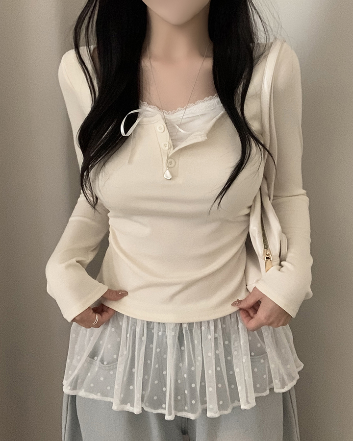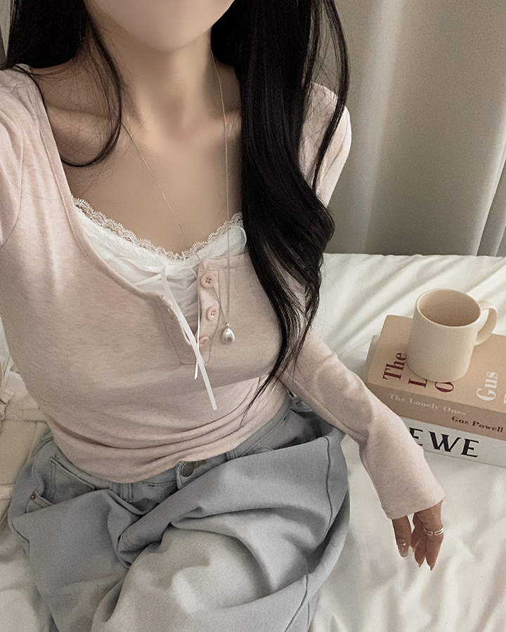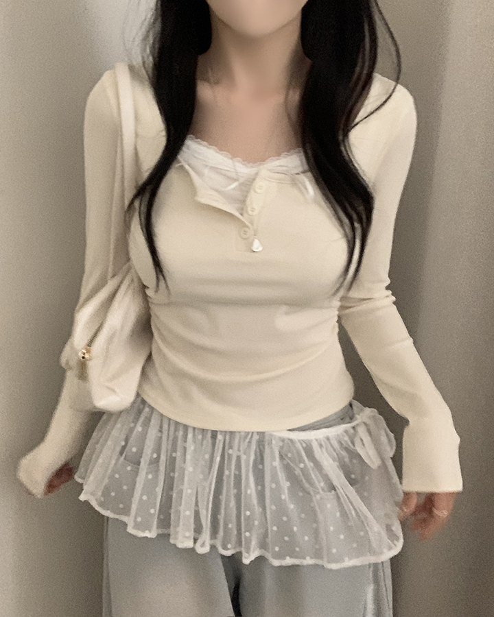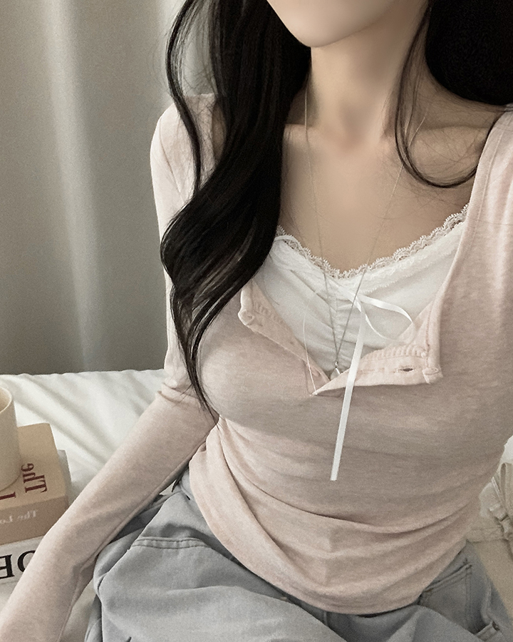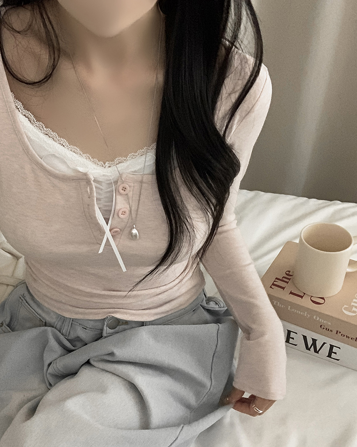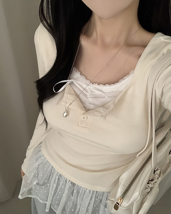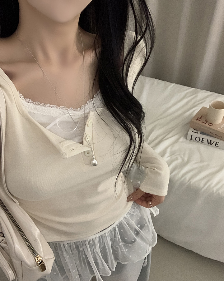 (一体型)レースキャミソールレイヤード風フロントボタンTシャツ