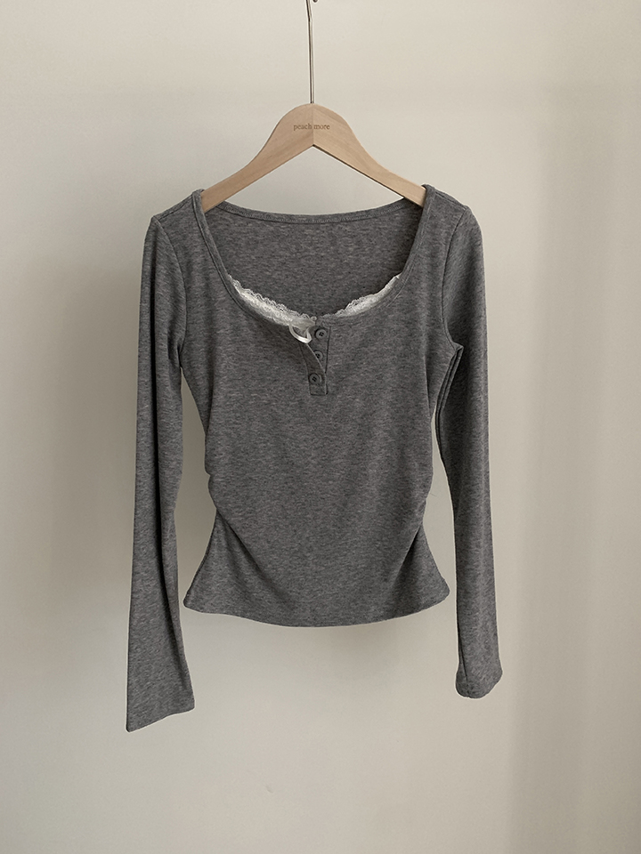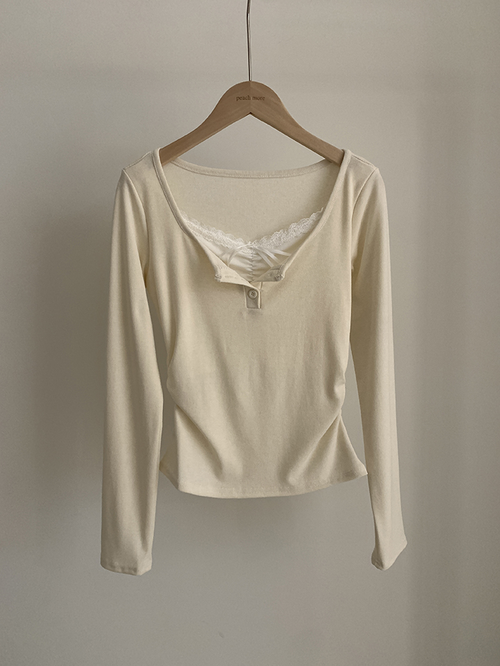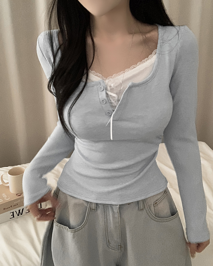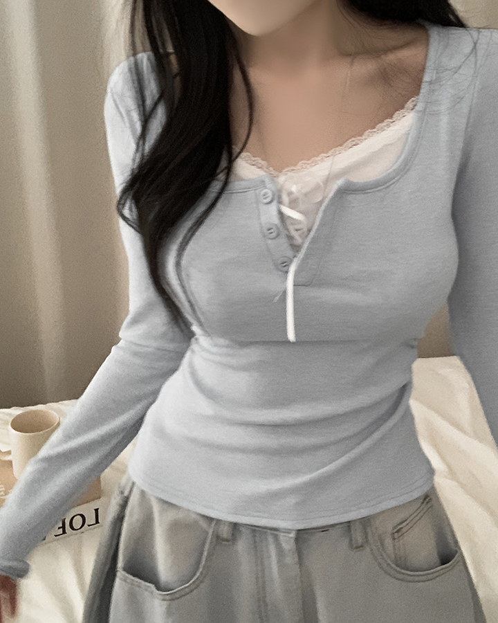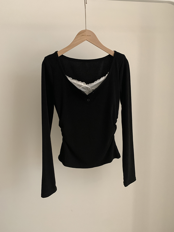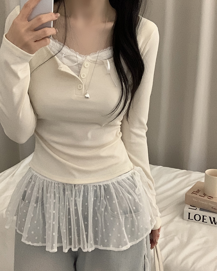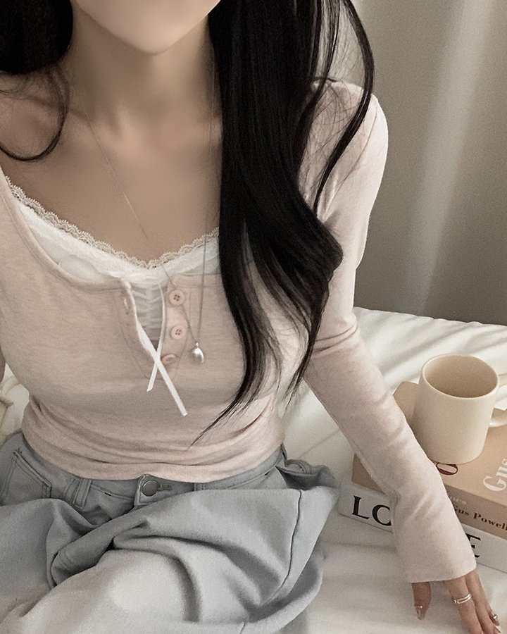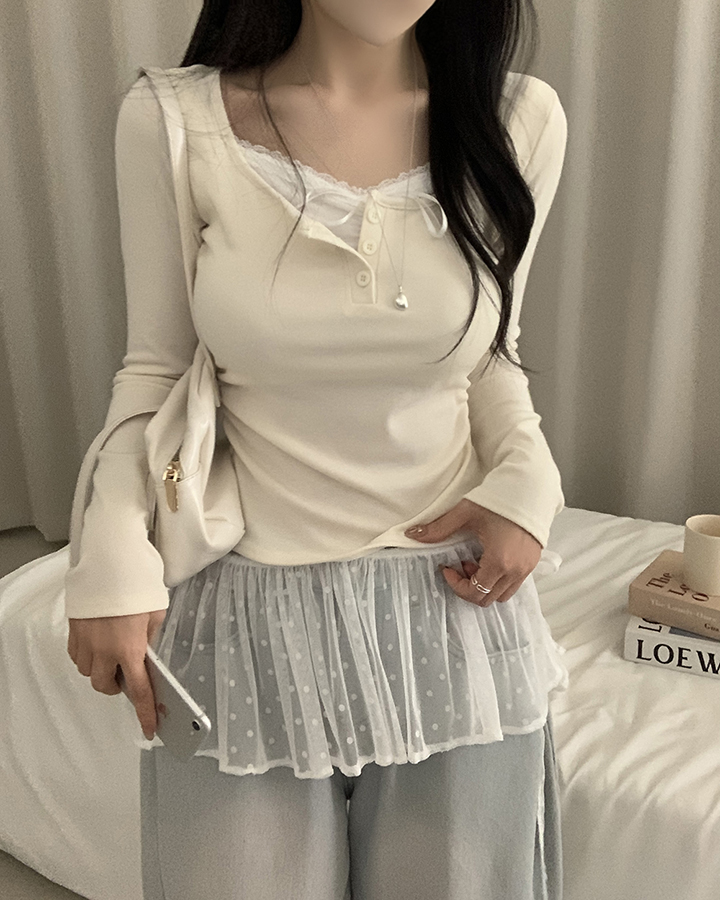 (一体型)レースキャミソールレイヤード風フロントボタンTシャツ