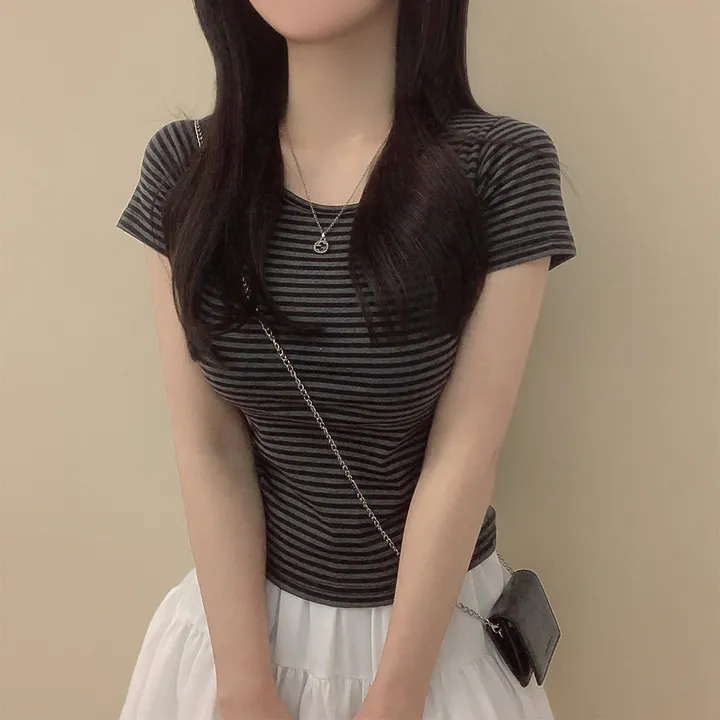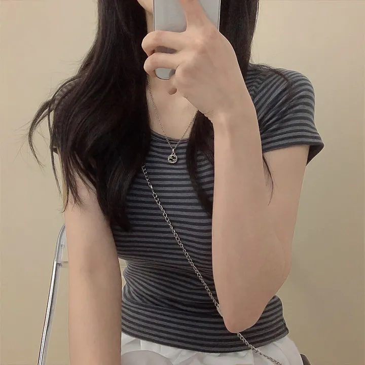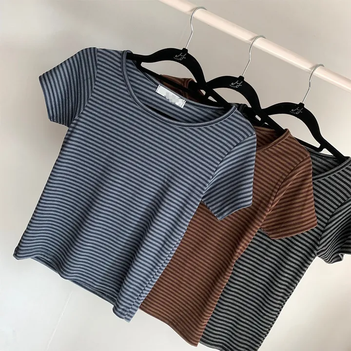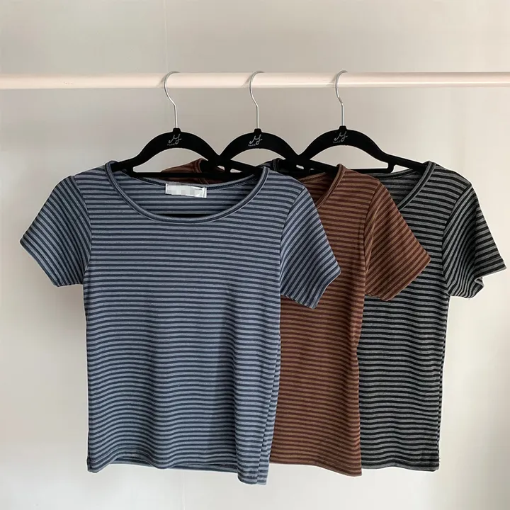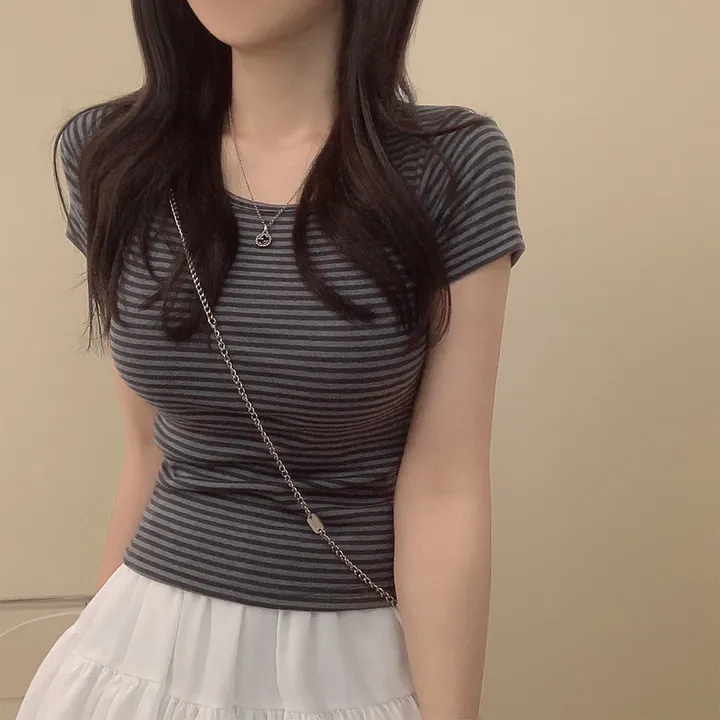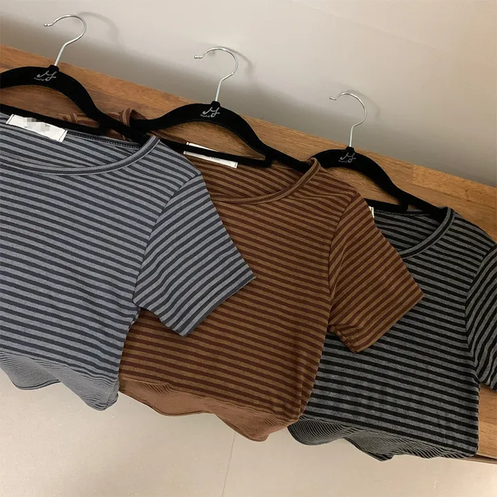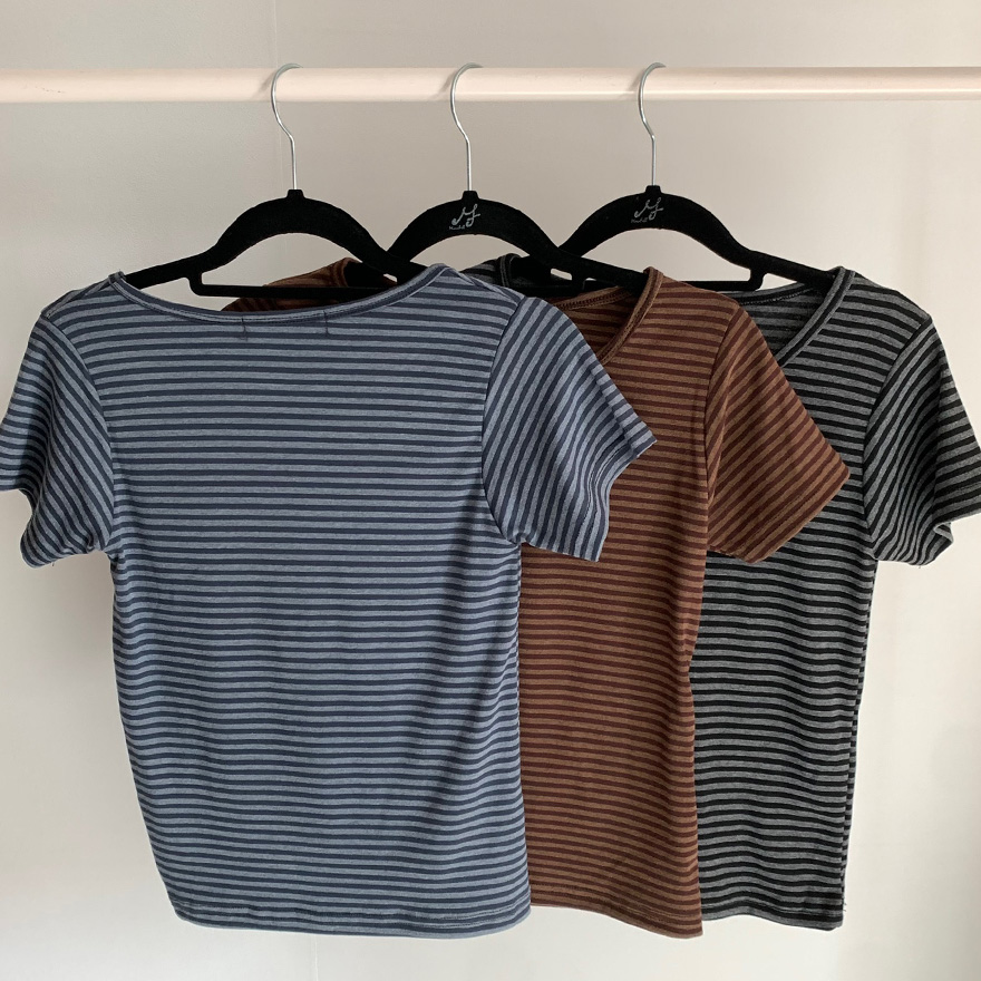 ボーダーUネックスリム半袖Tシャツ