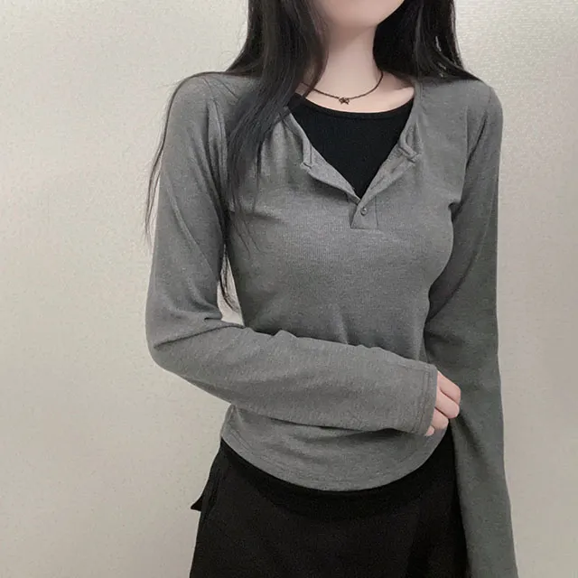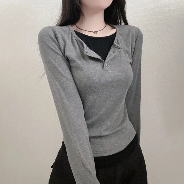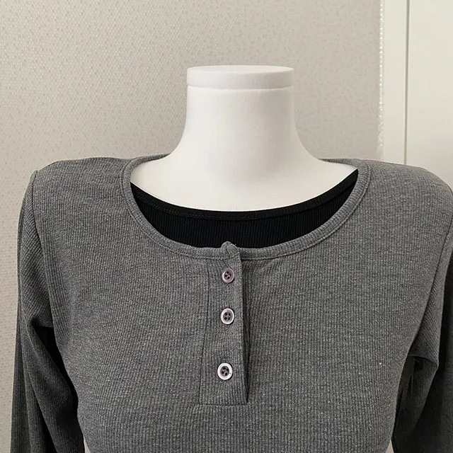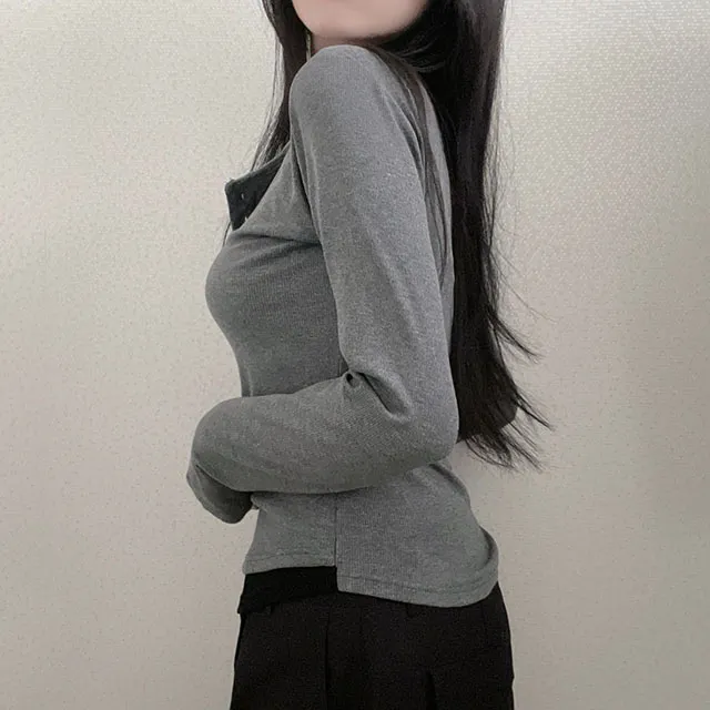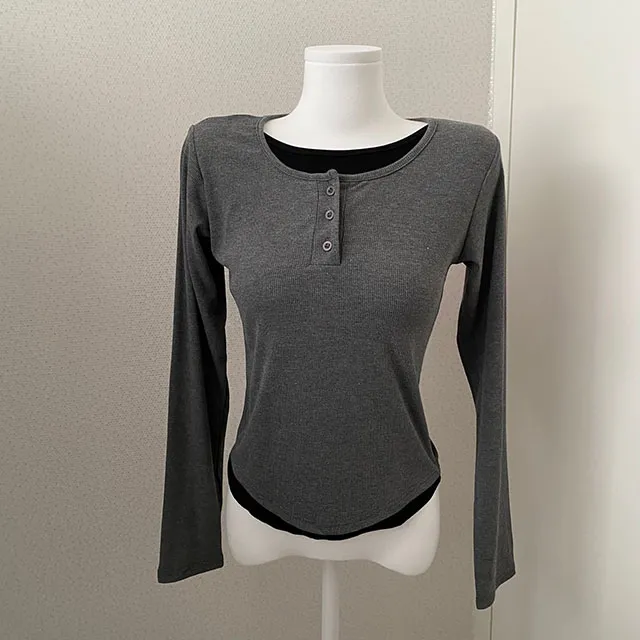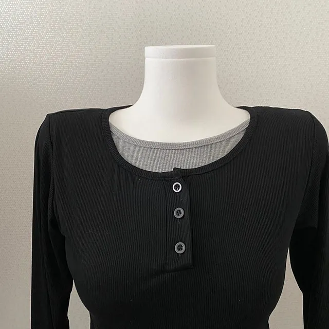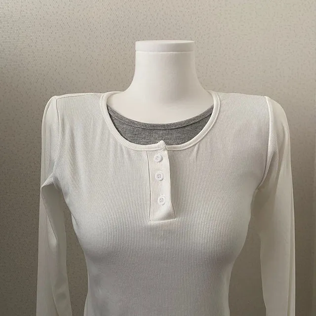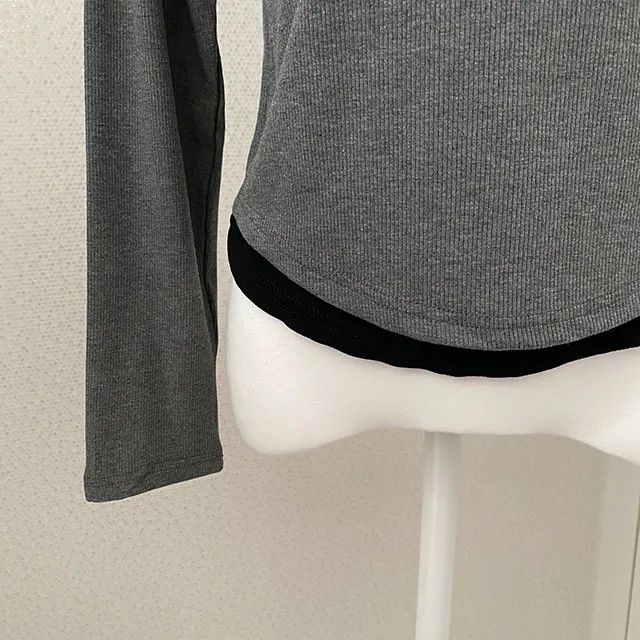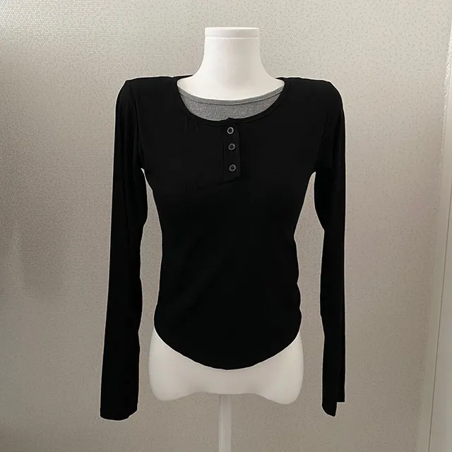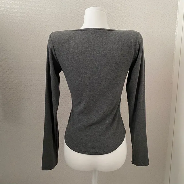ボタンシャーリングクロップドリブ長袖Tシャツ