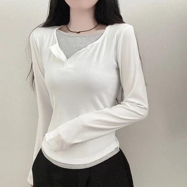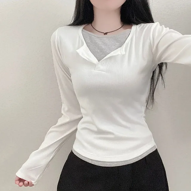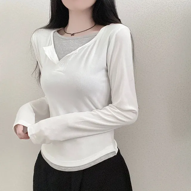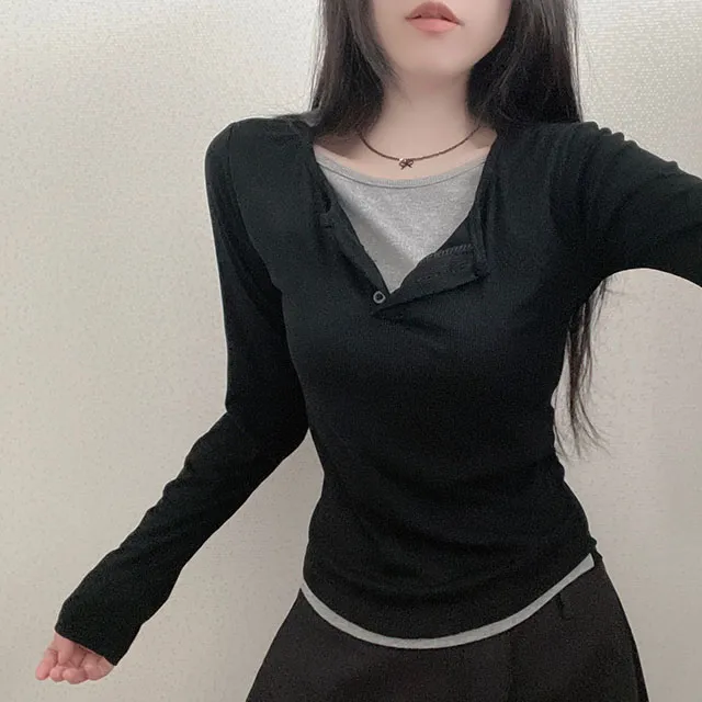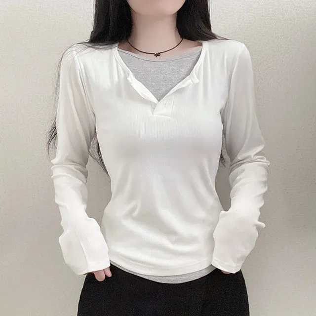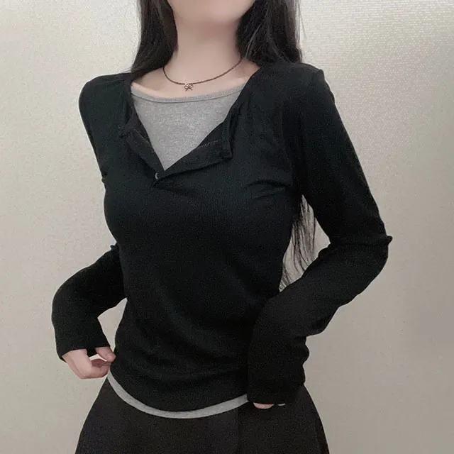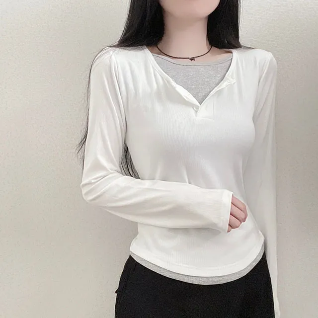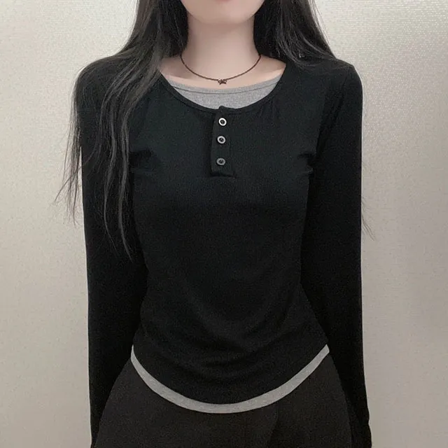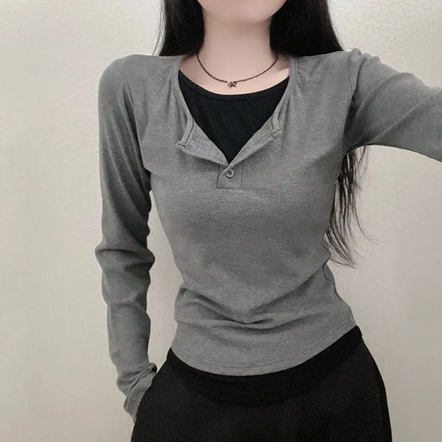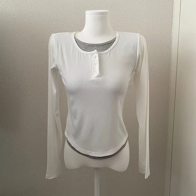 ボタンシャーリングクロップドリブ長袖Tシャツ