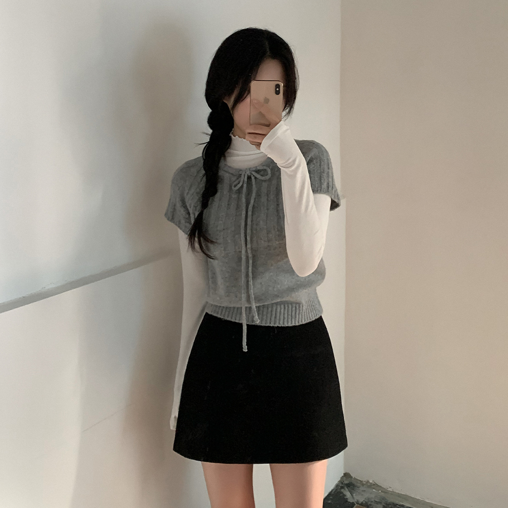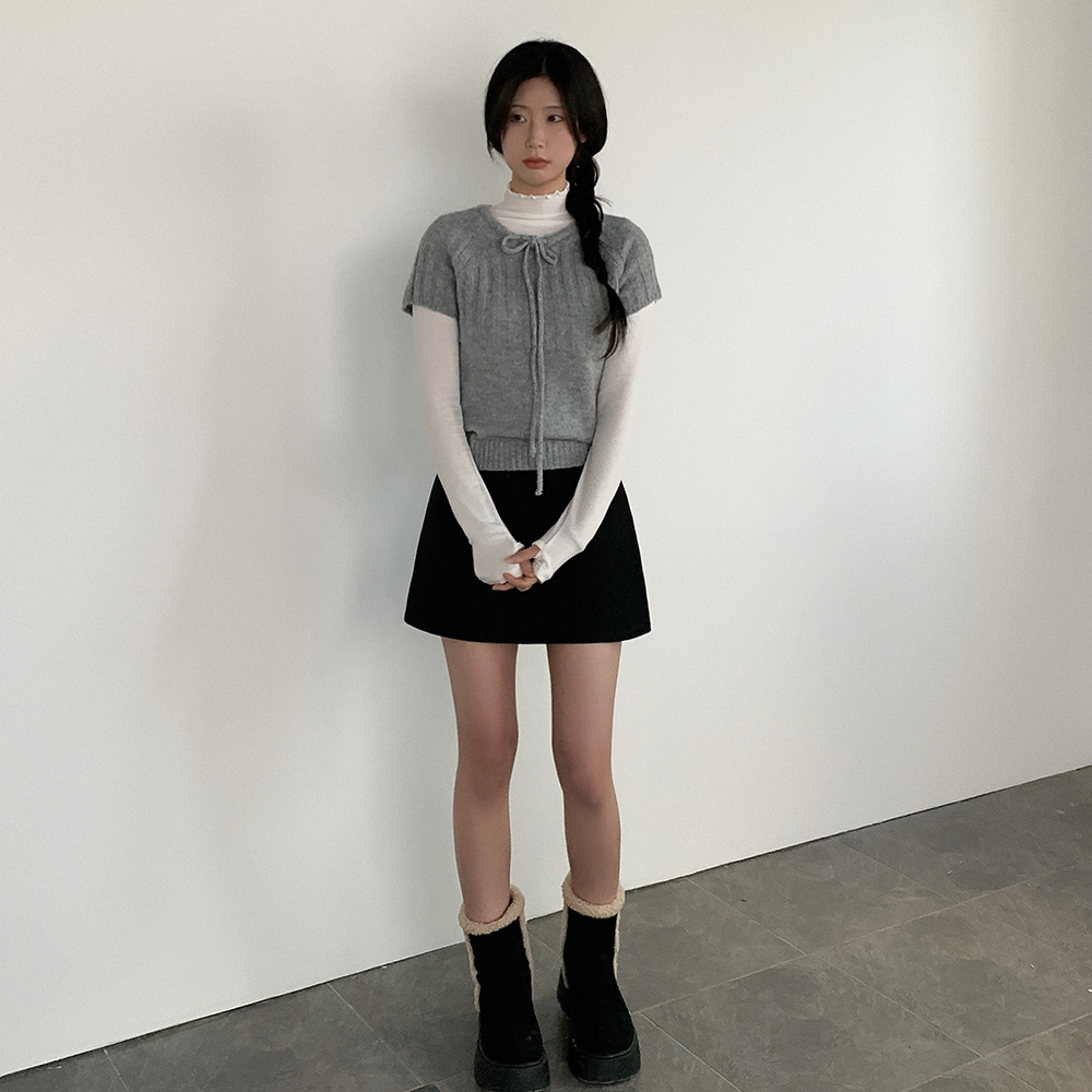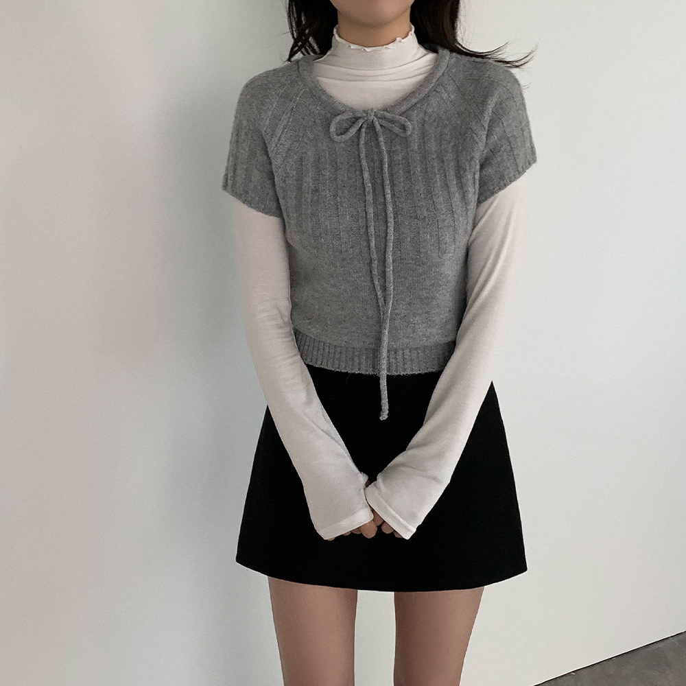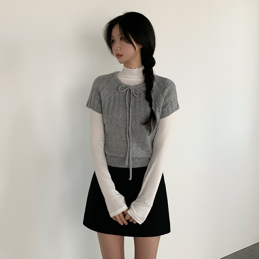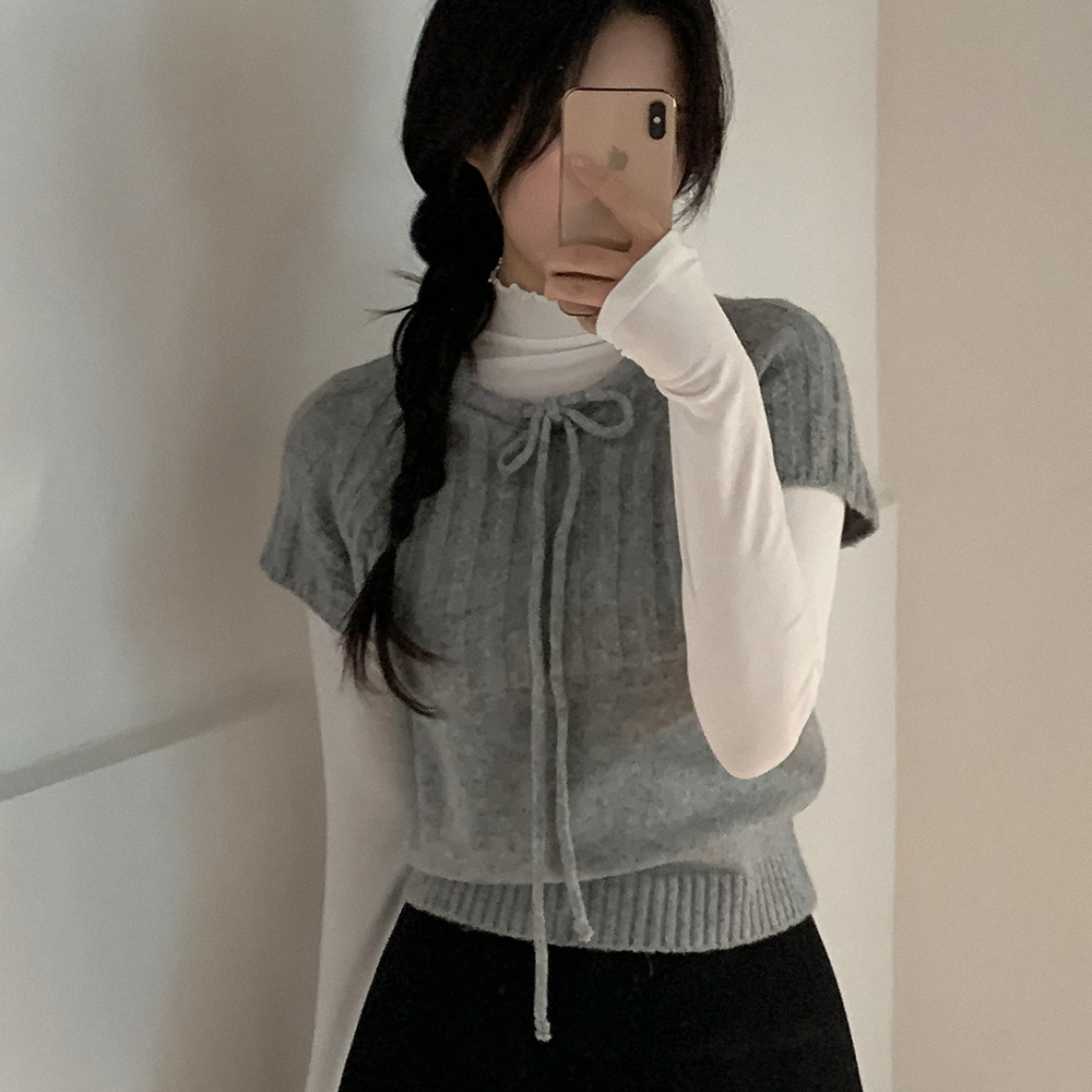 ウール リボン クルーネック 半袖 ニット