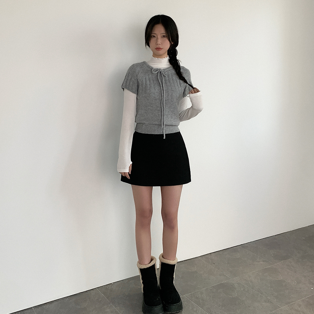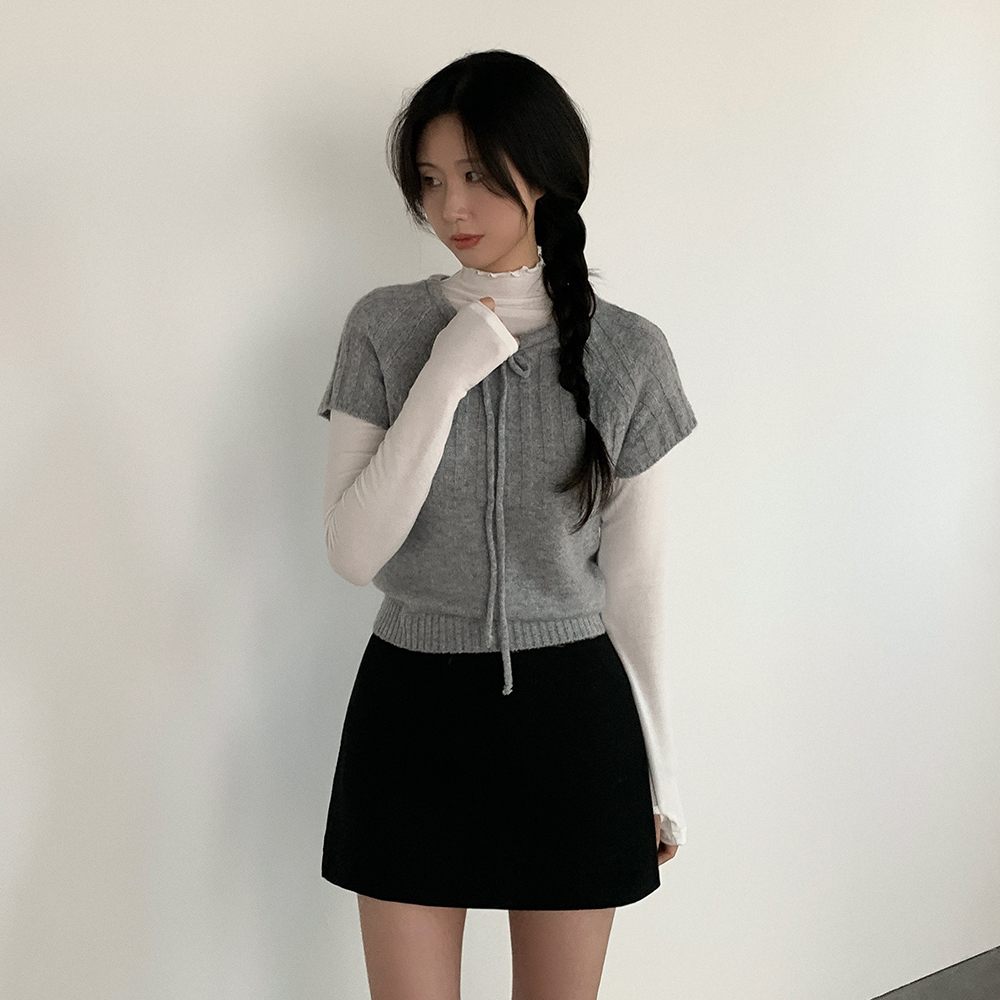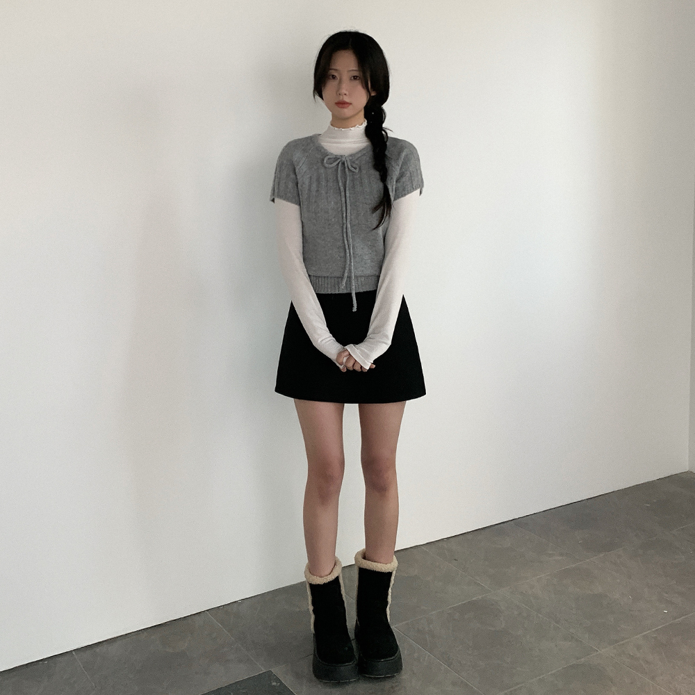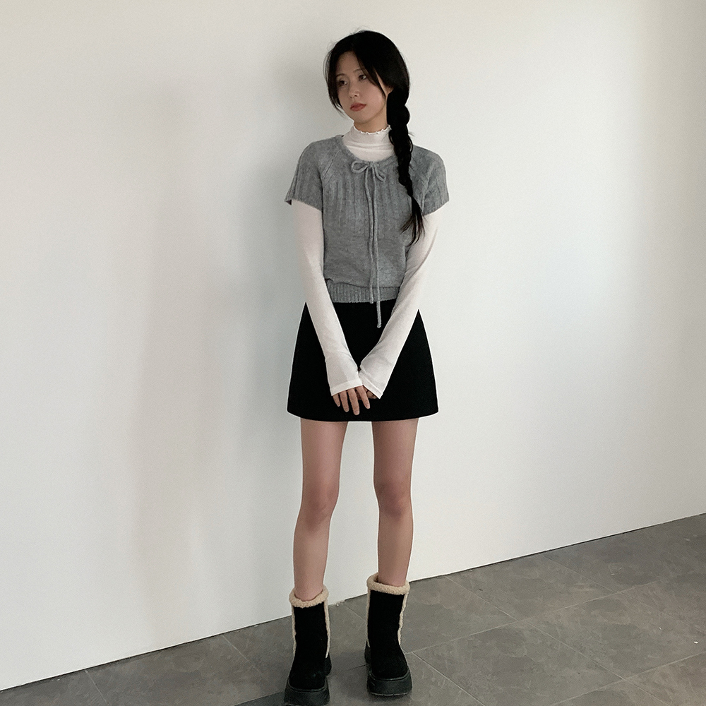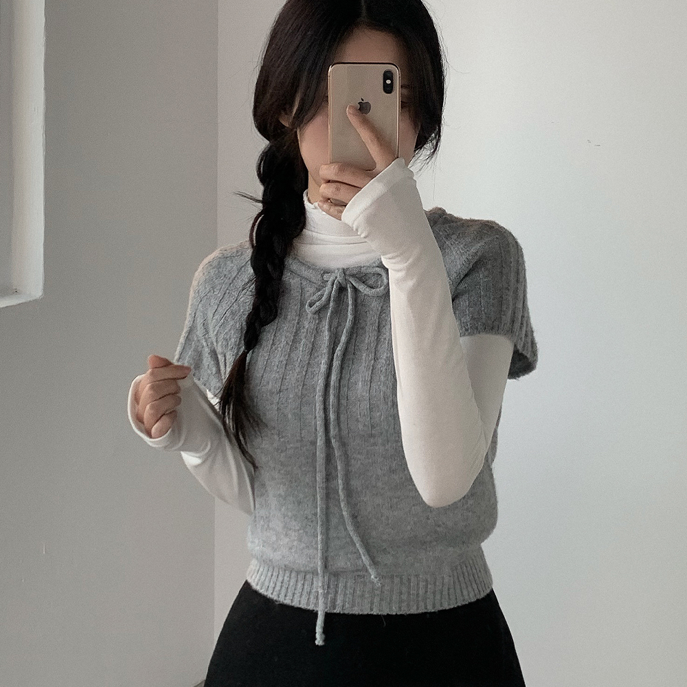 ウール リボン クルーネック 半袖 ニット