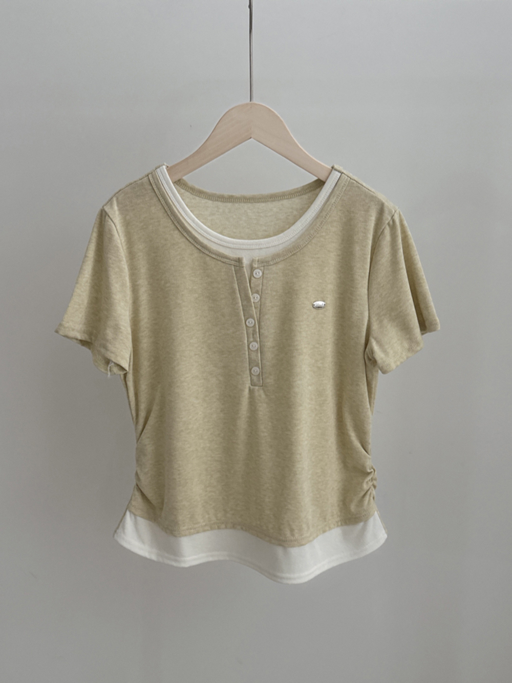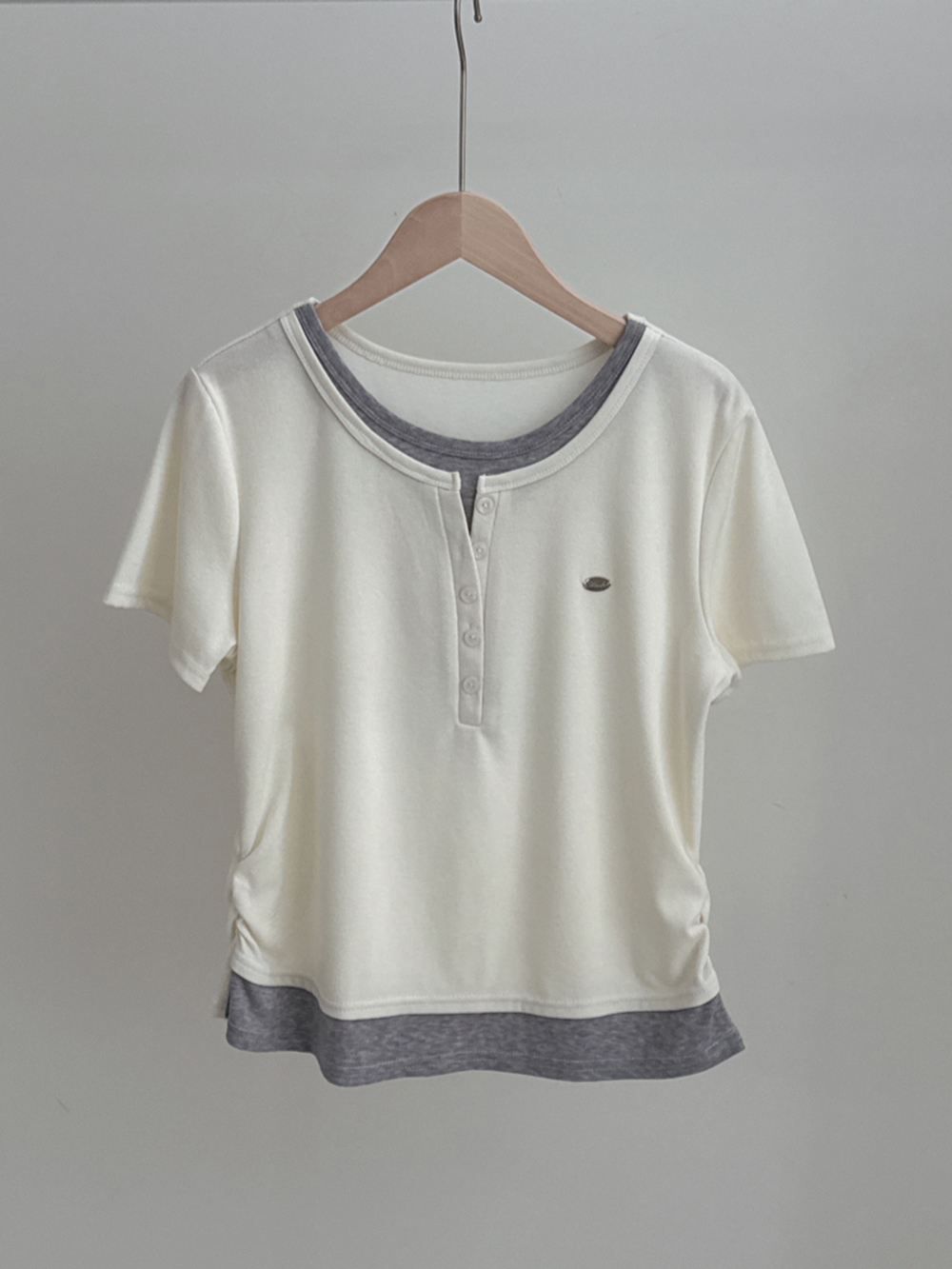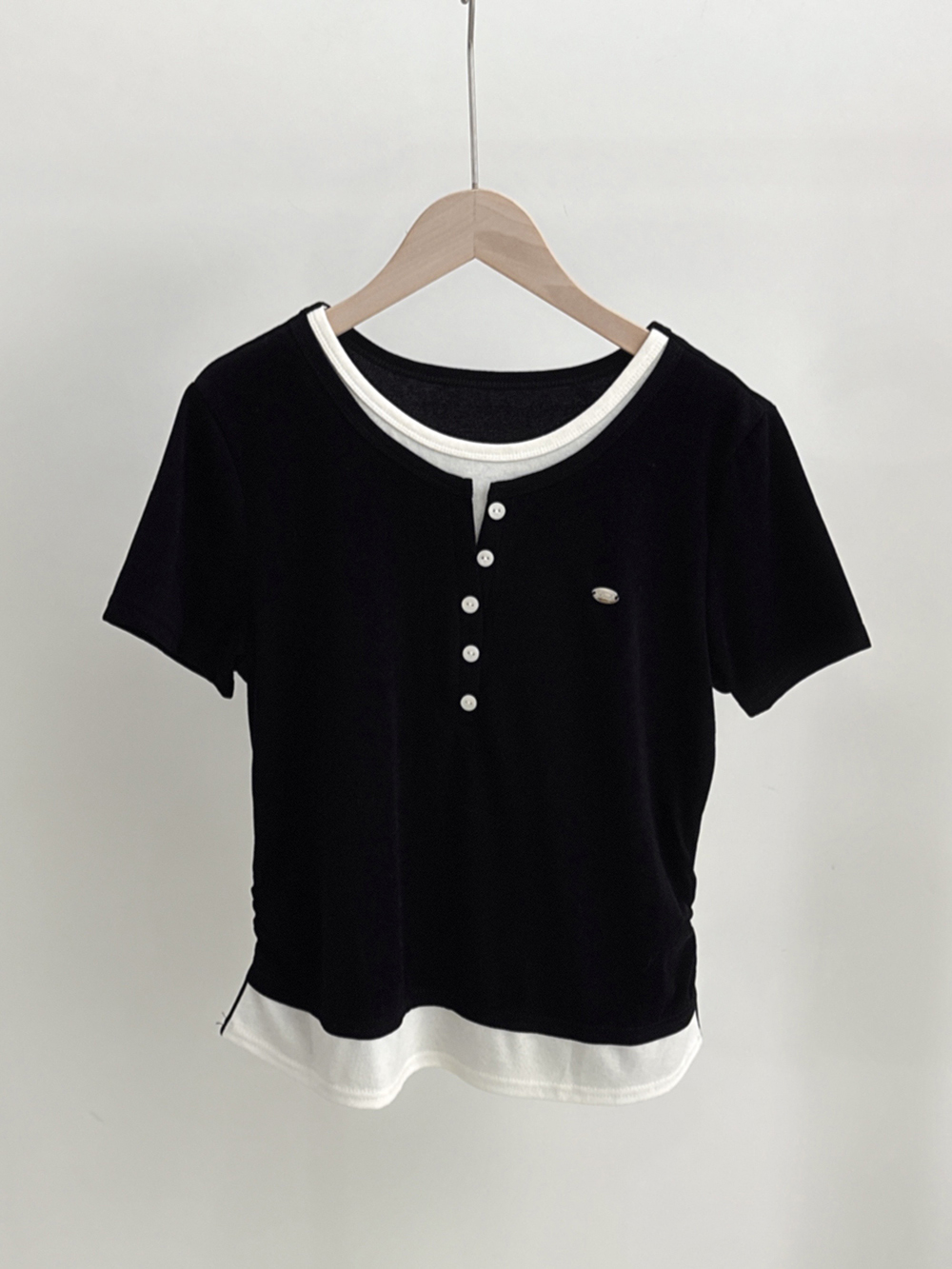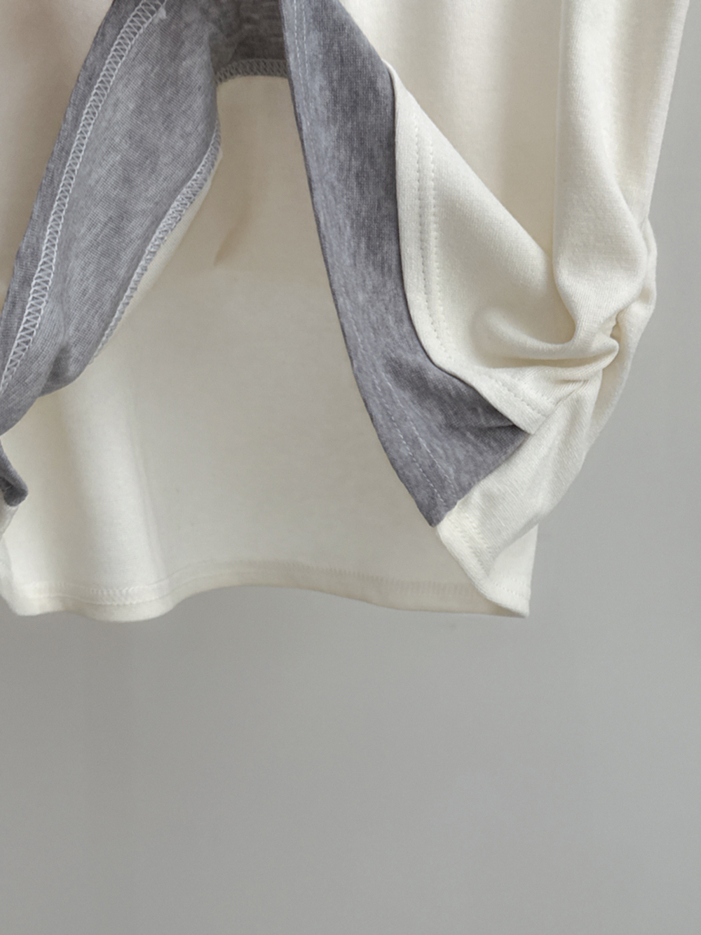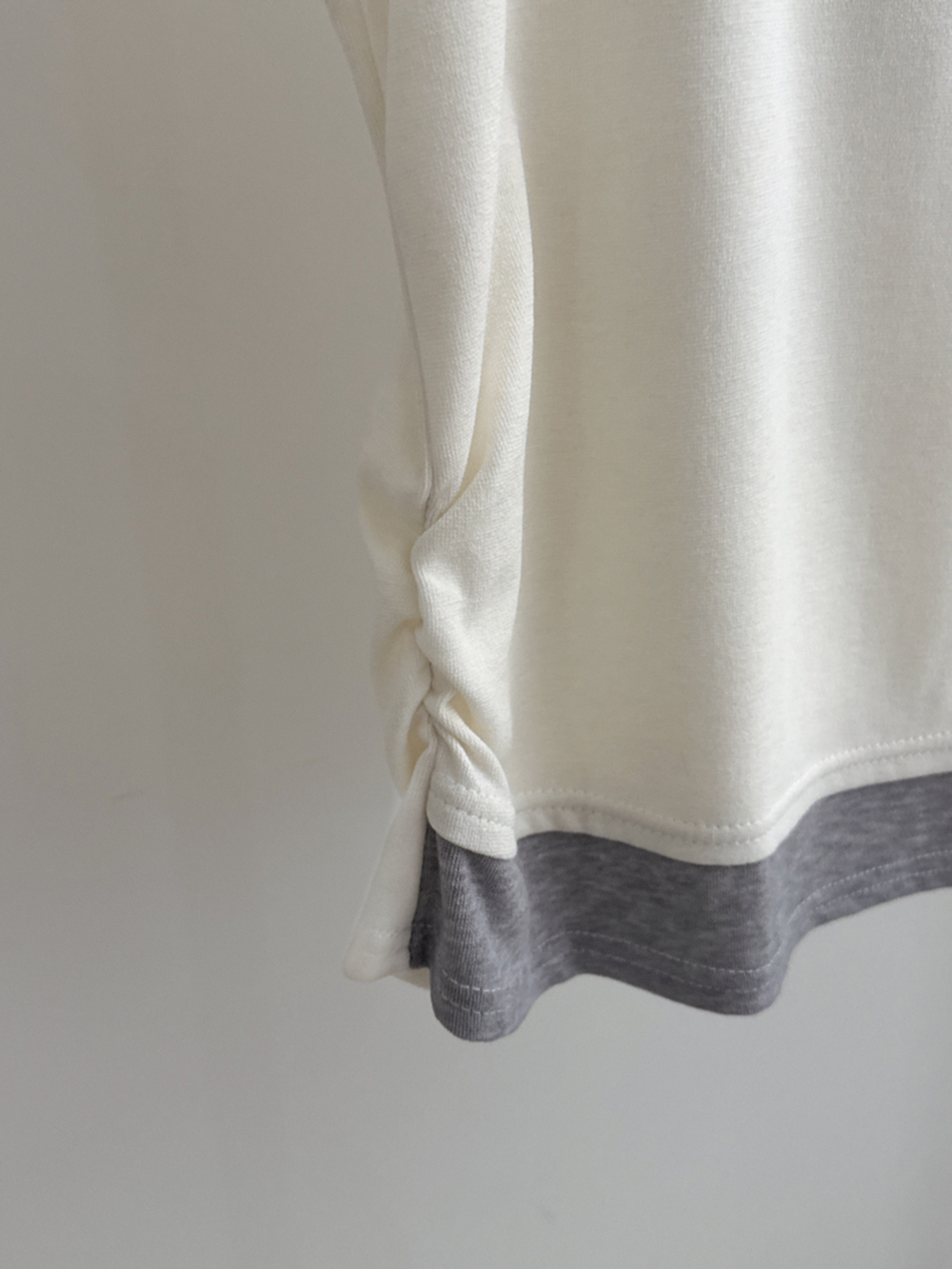 ワッペンバイカラーレイヤードサイドシャーリングラウンドネック半袖Tシャツ