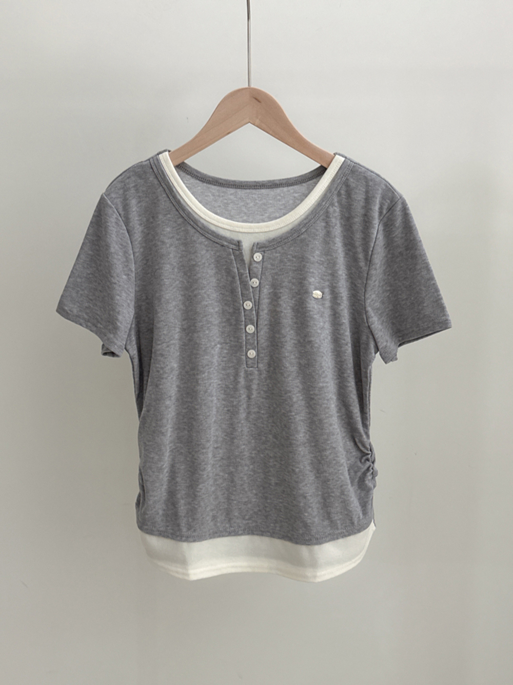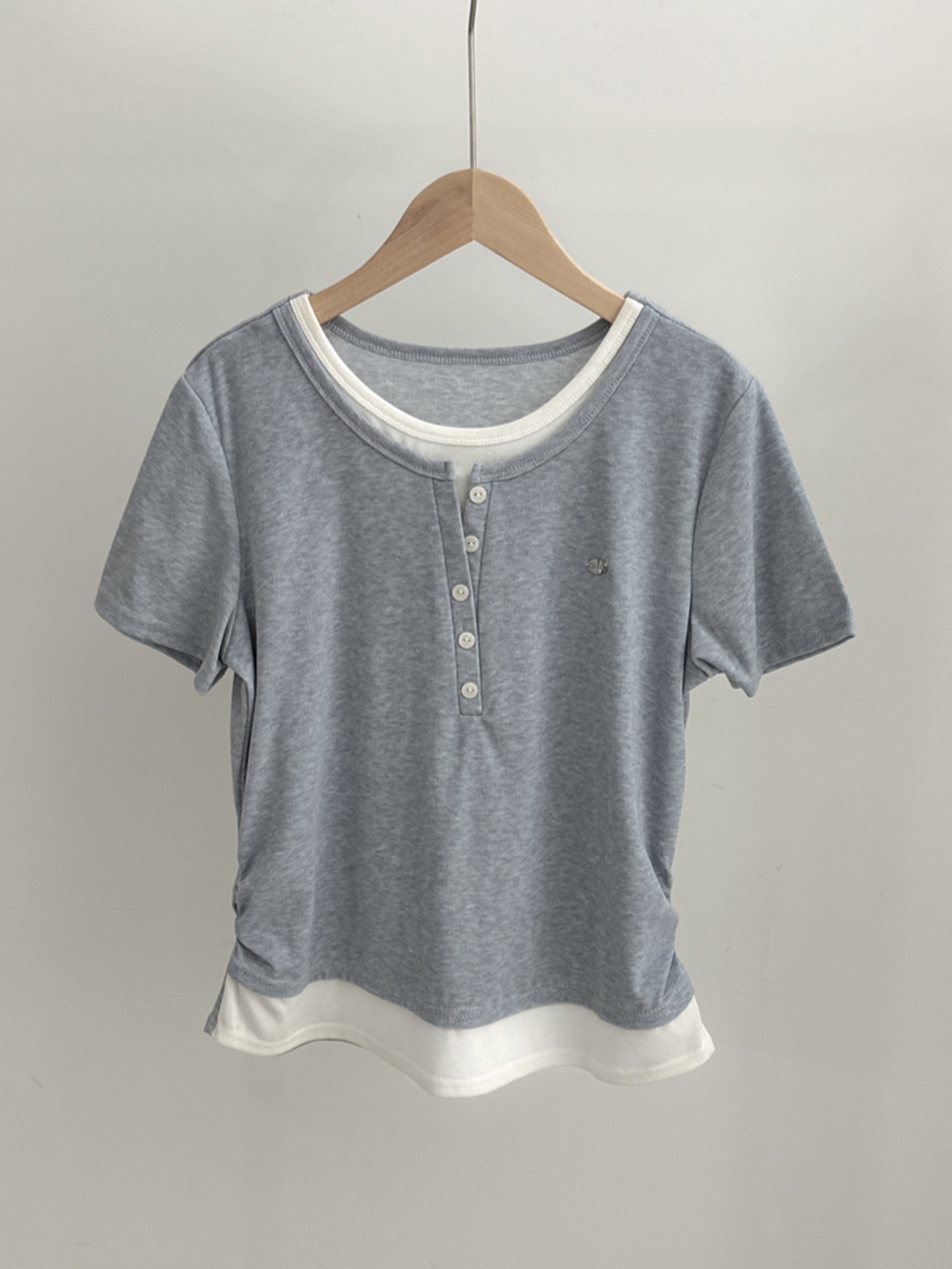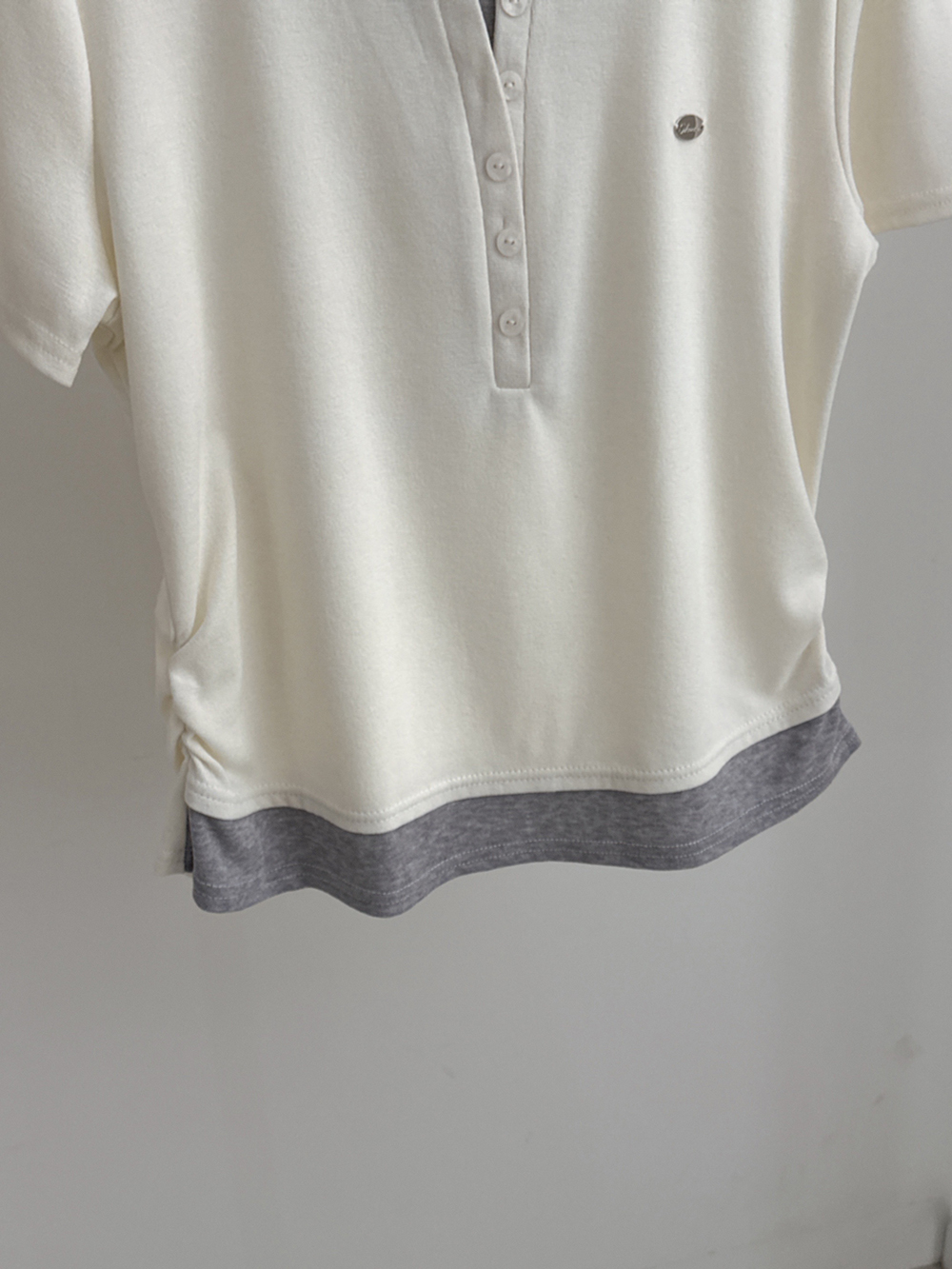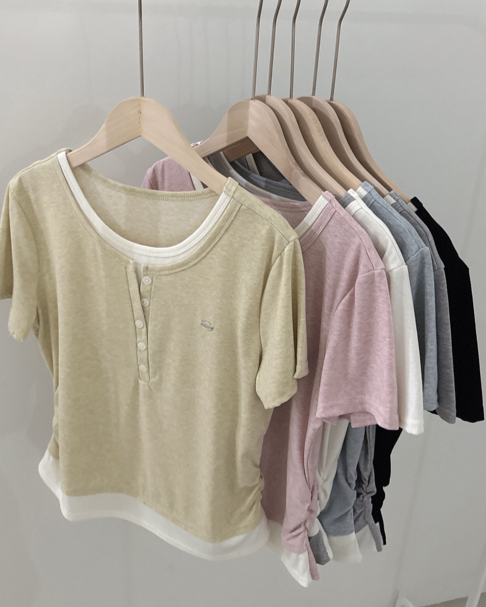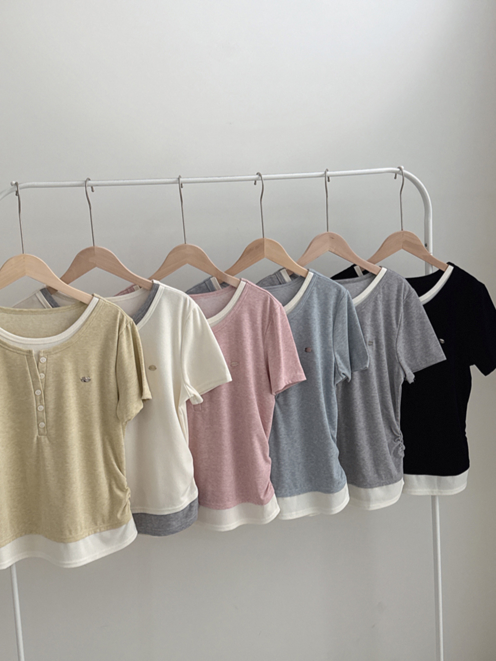 ワッペンバイカラーレイヤードサイドシャーリングラウンドネック半袖Tシャツ