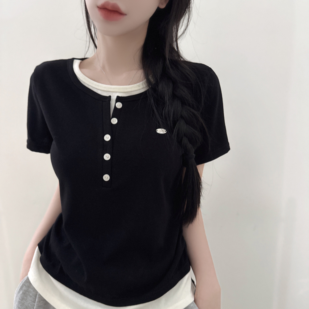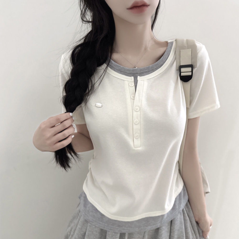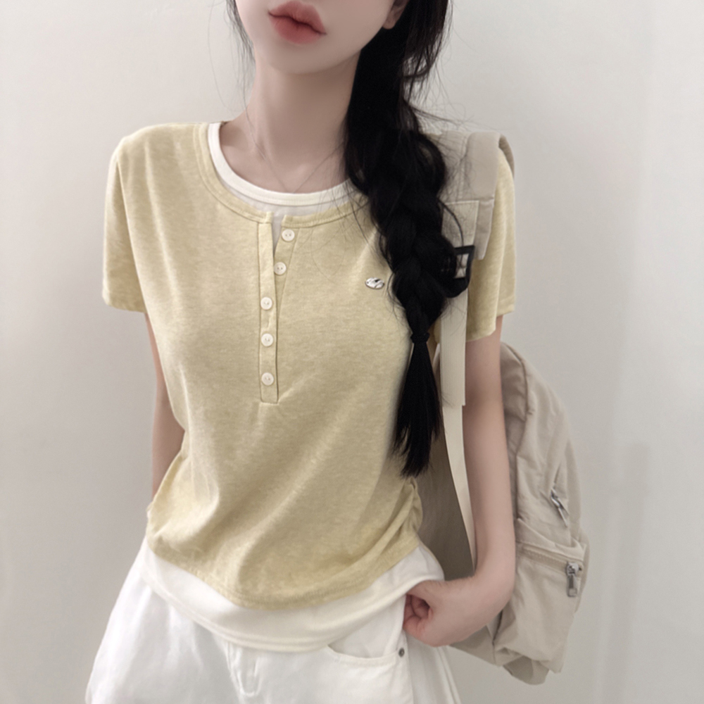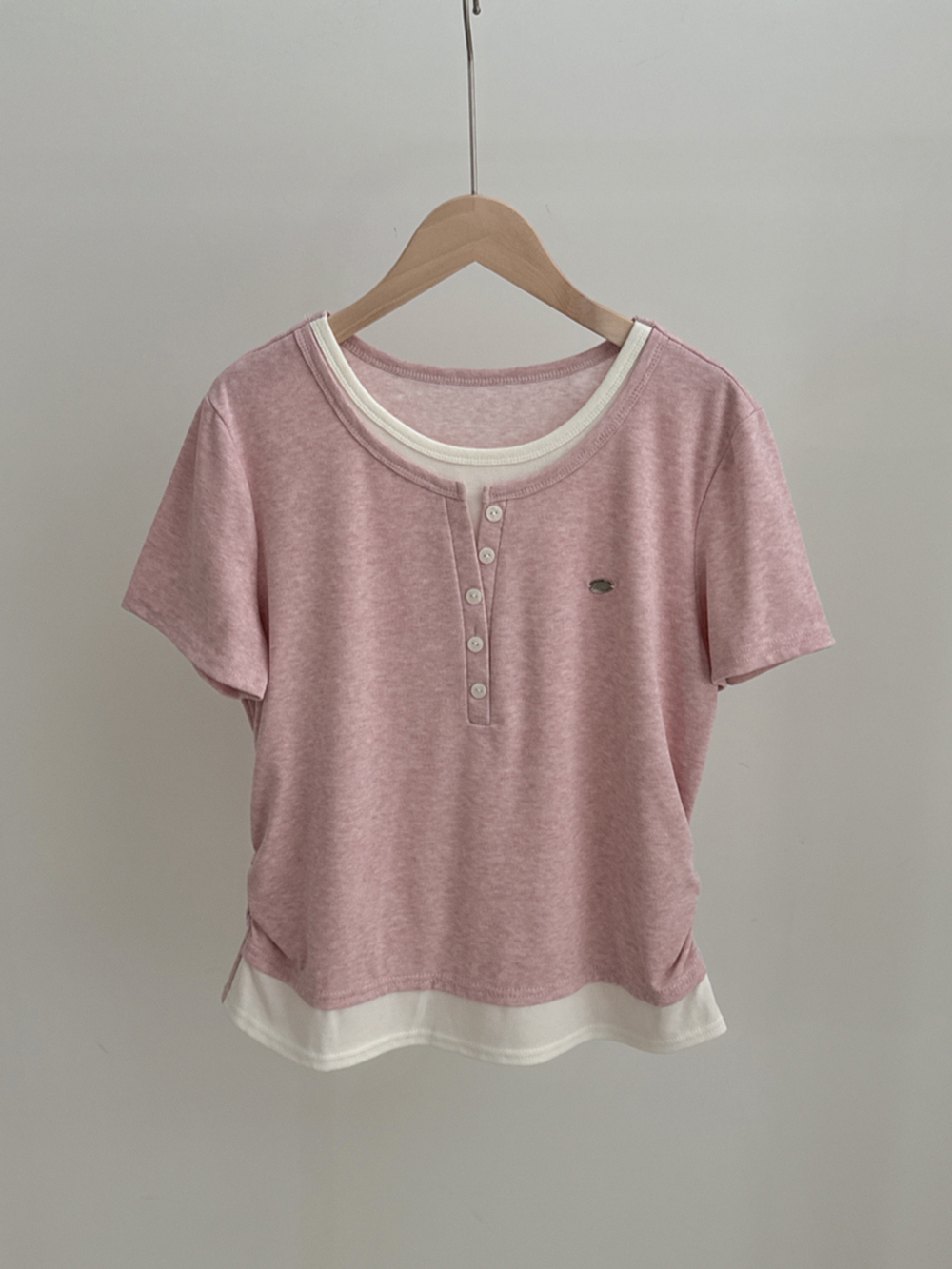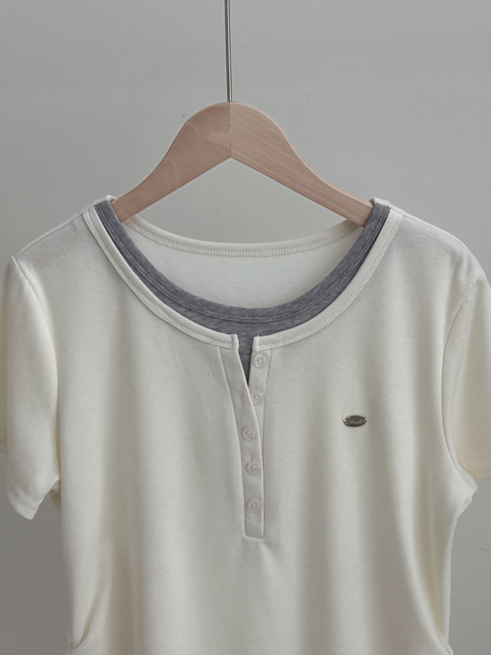 ワッペンバイカラーレイヤードサイドシャーリングラウンドネック半袖Tシャツ