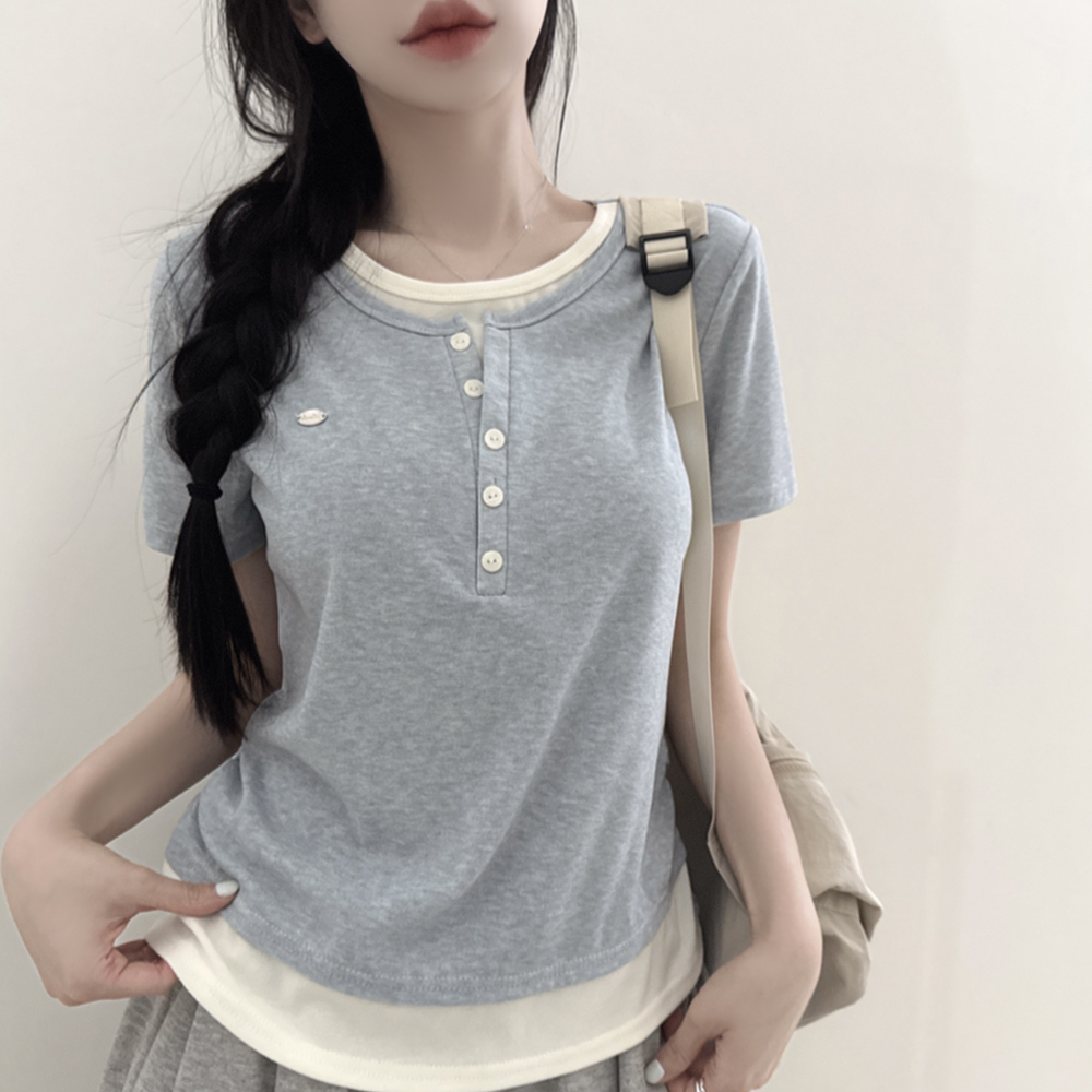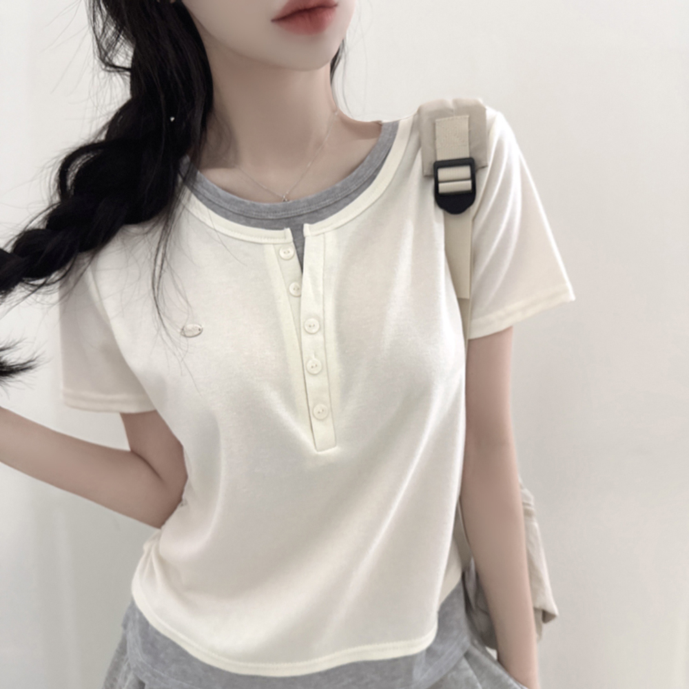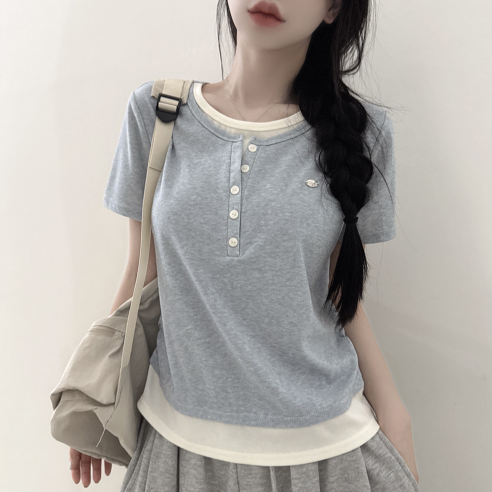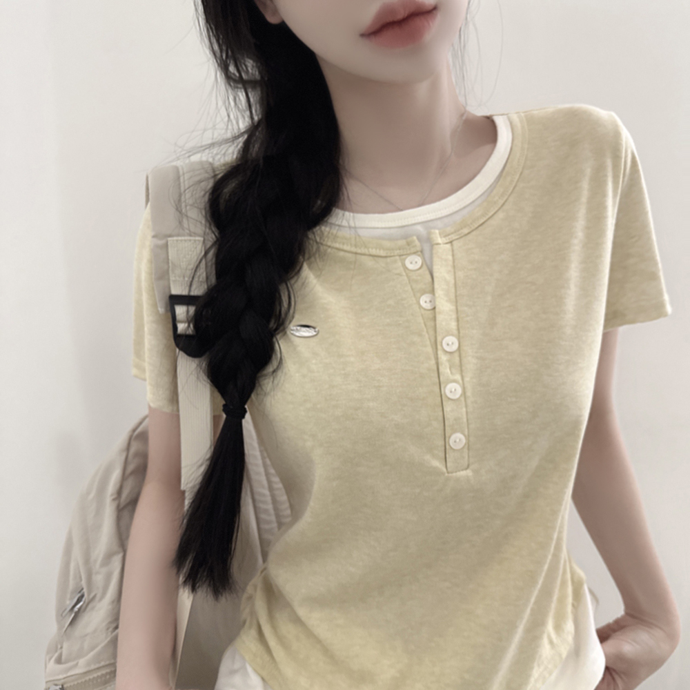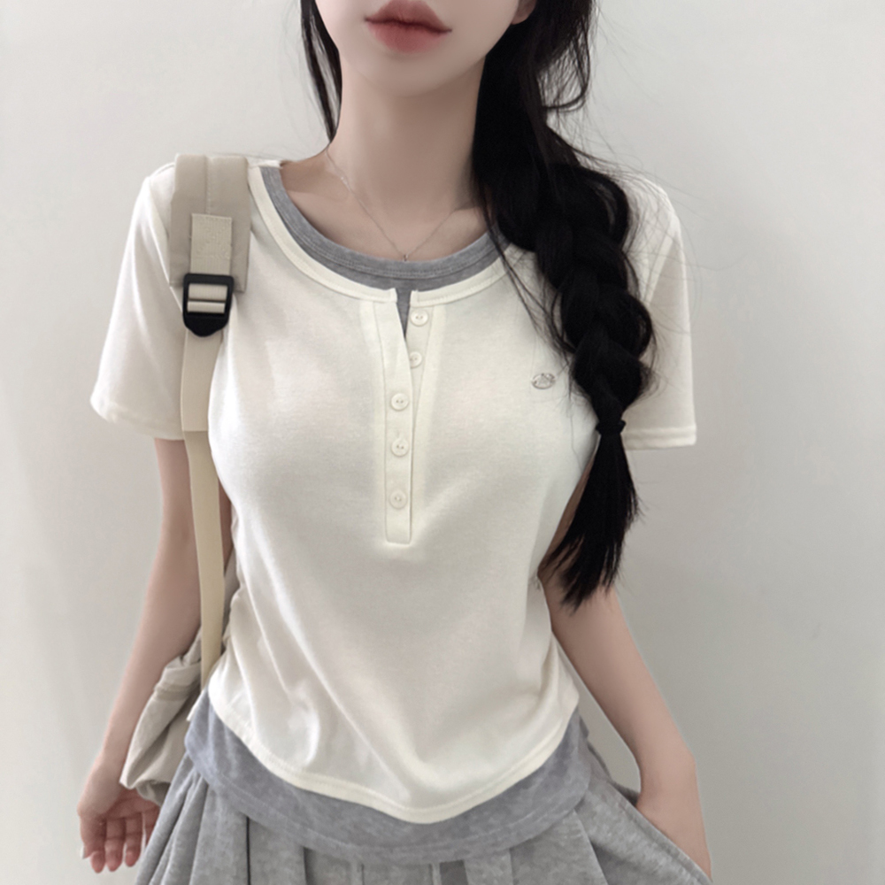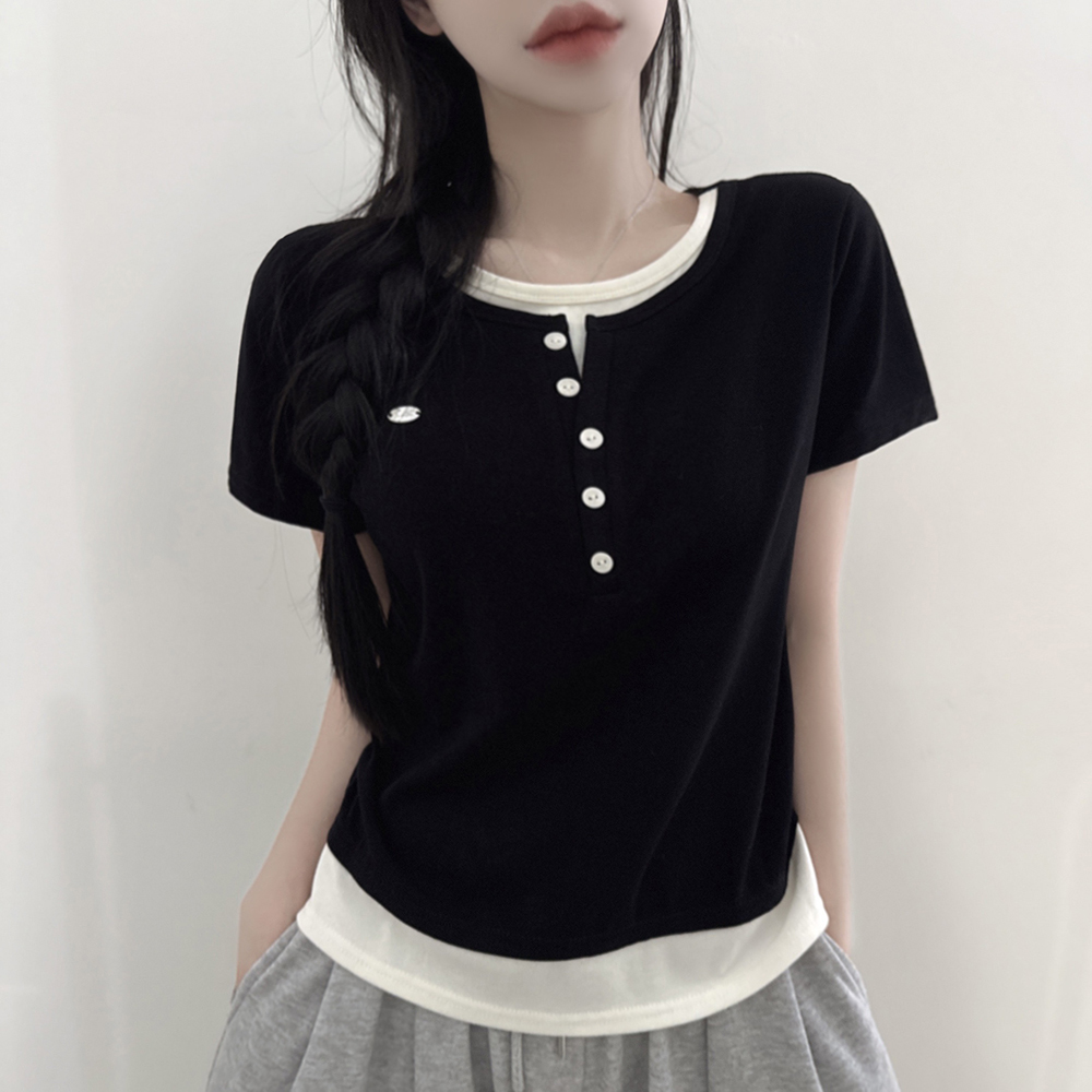 ワッペンバイカラーレイヤードサイドシャーリングラウンドネック半袖Tシャツ