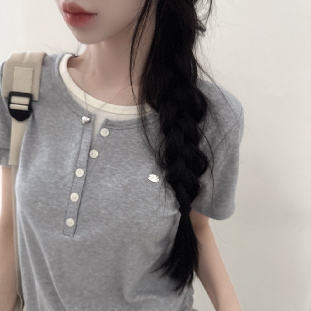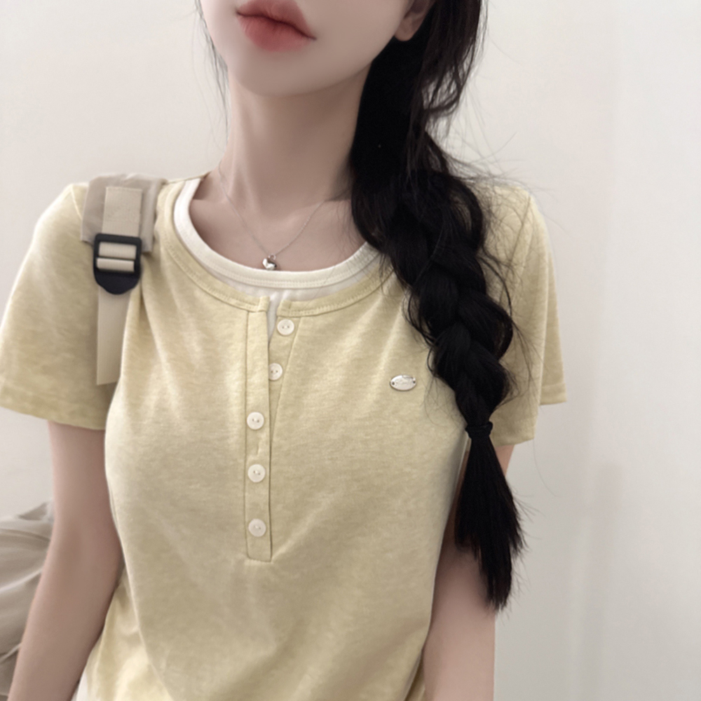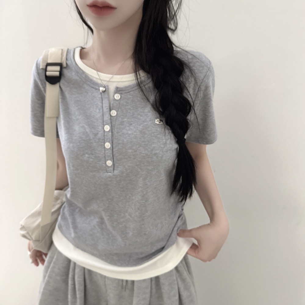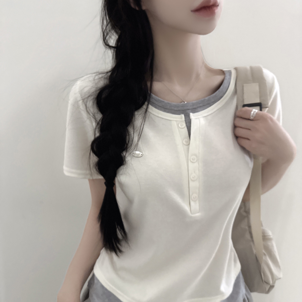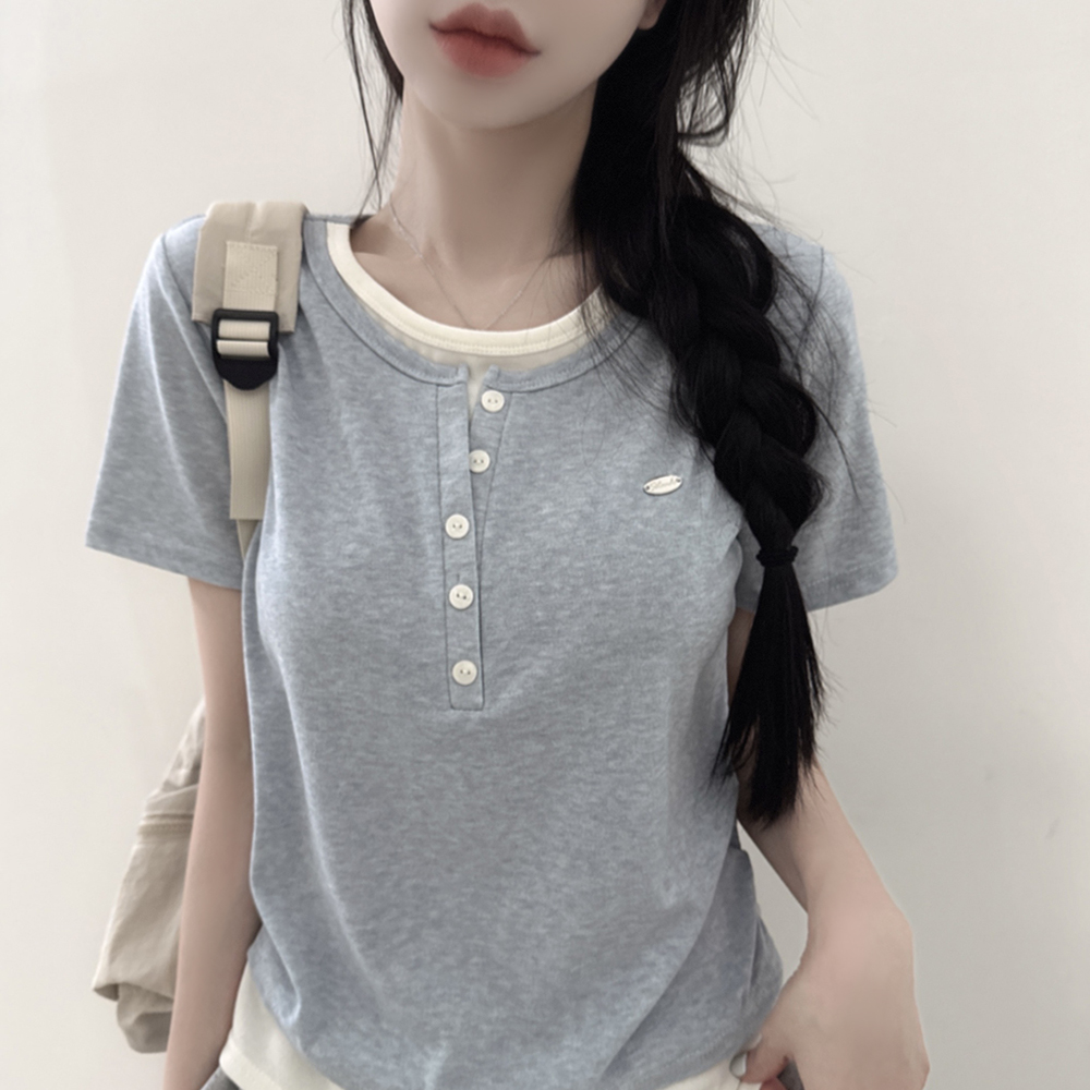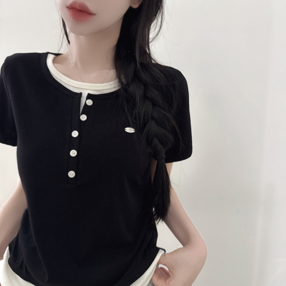 ワッペンバイカラーレイヤードサイドシャーリングラウンドネック半袖Tシャツ