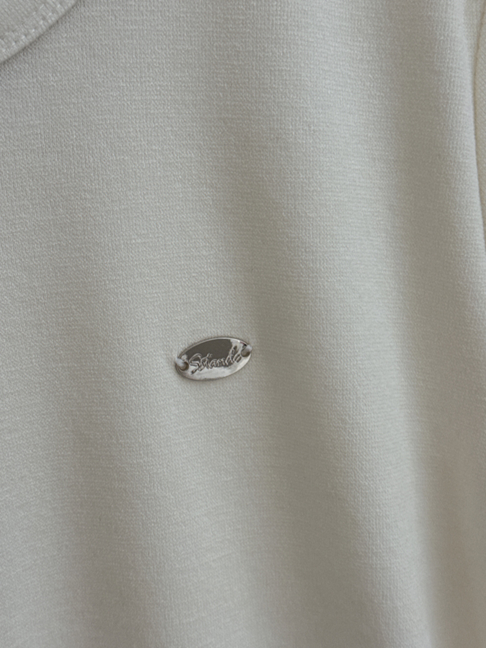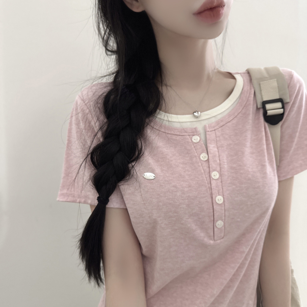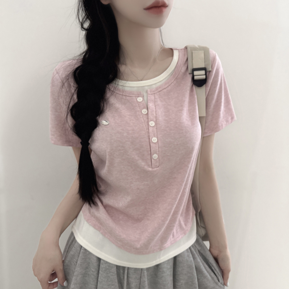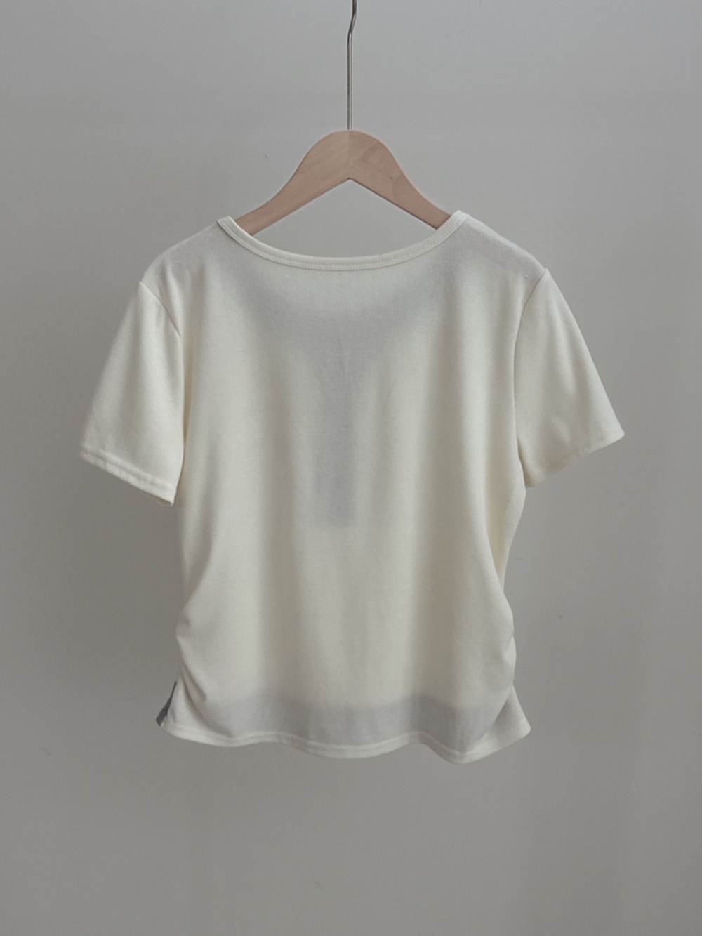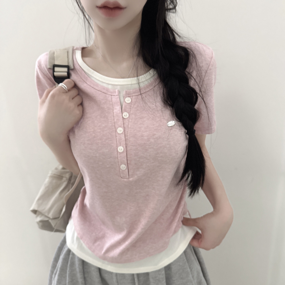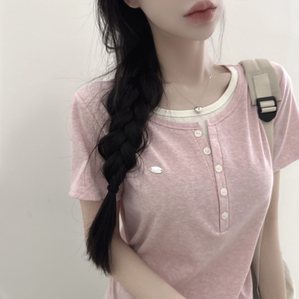 ワッペンバイカラーレイヤードサイドシャーリングラウンドネック半袖Tシャツ