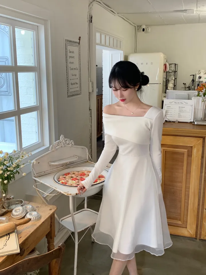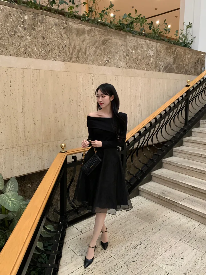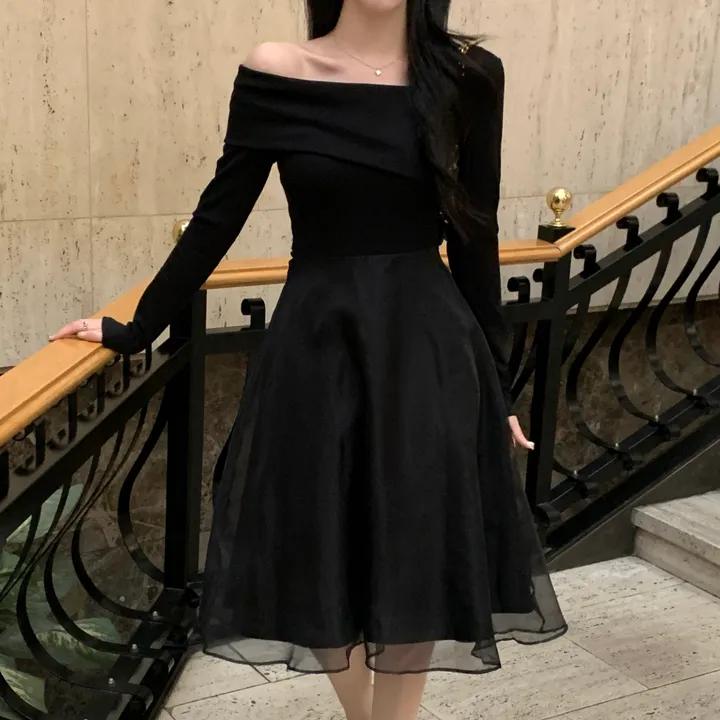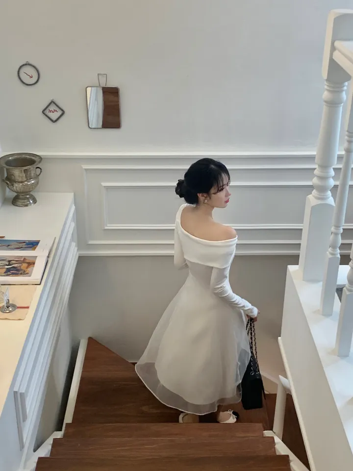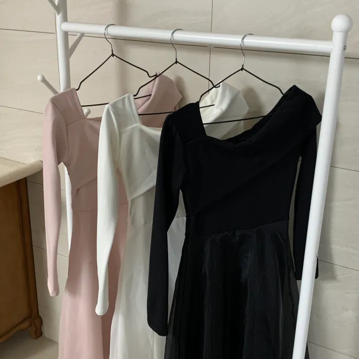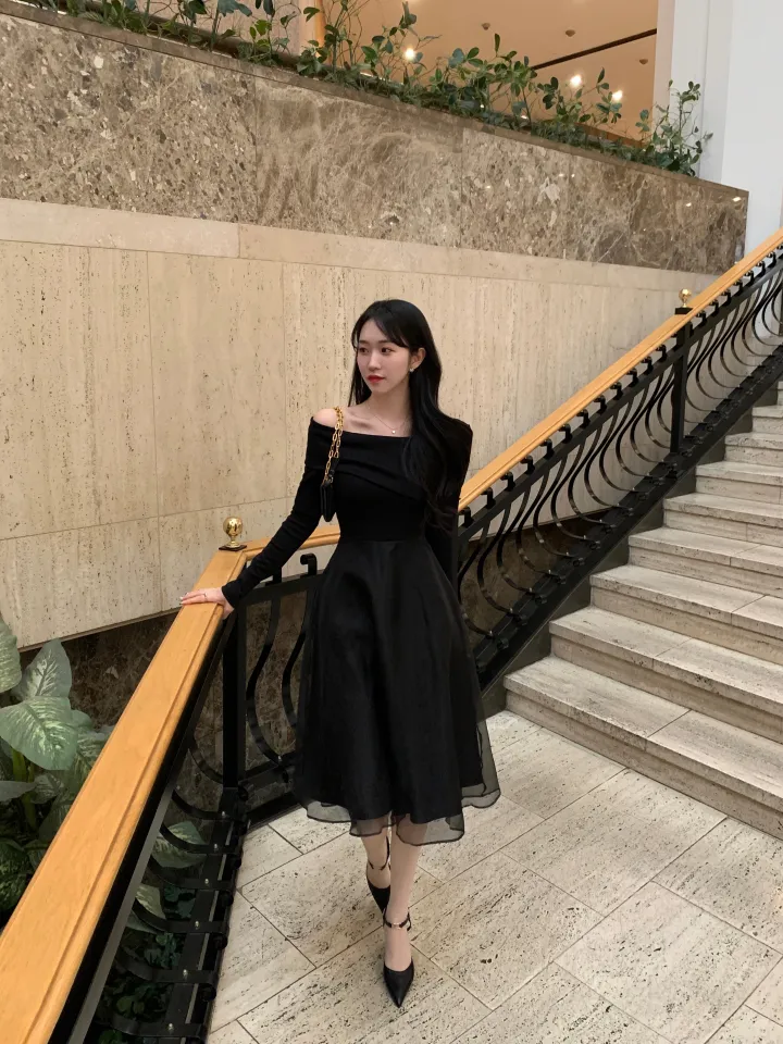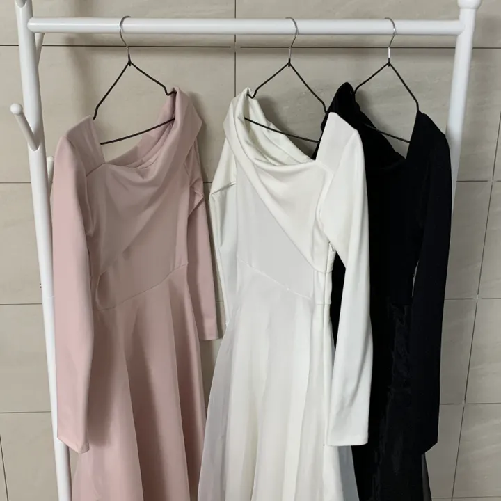 アシンメトリーオフショルシフォンロングフレアワンピース