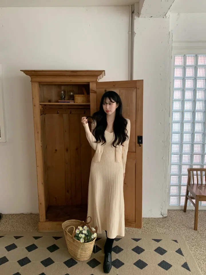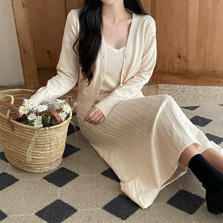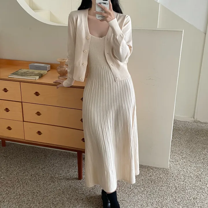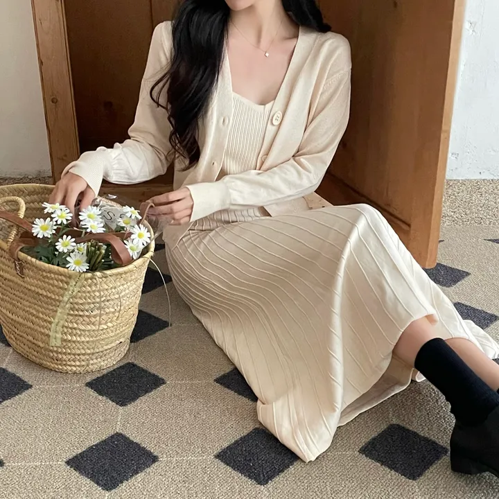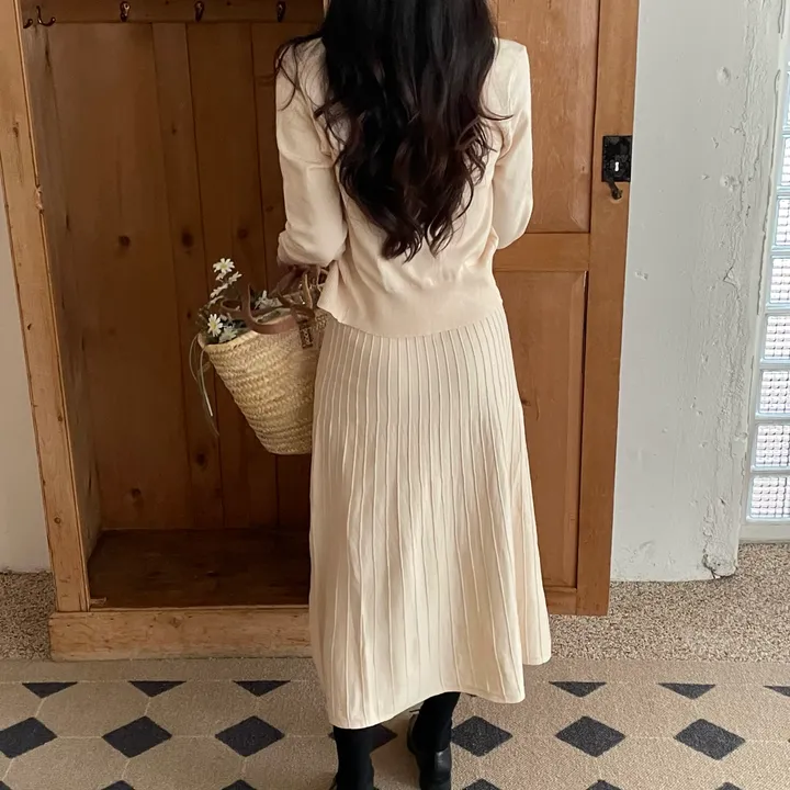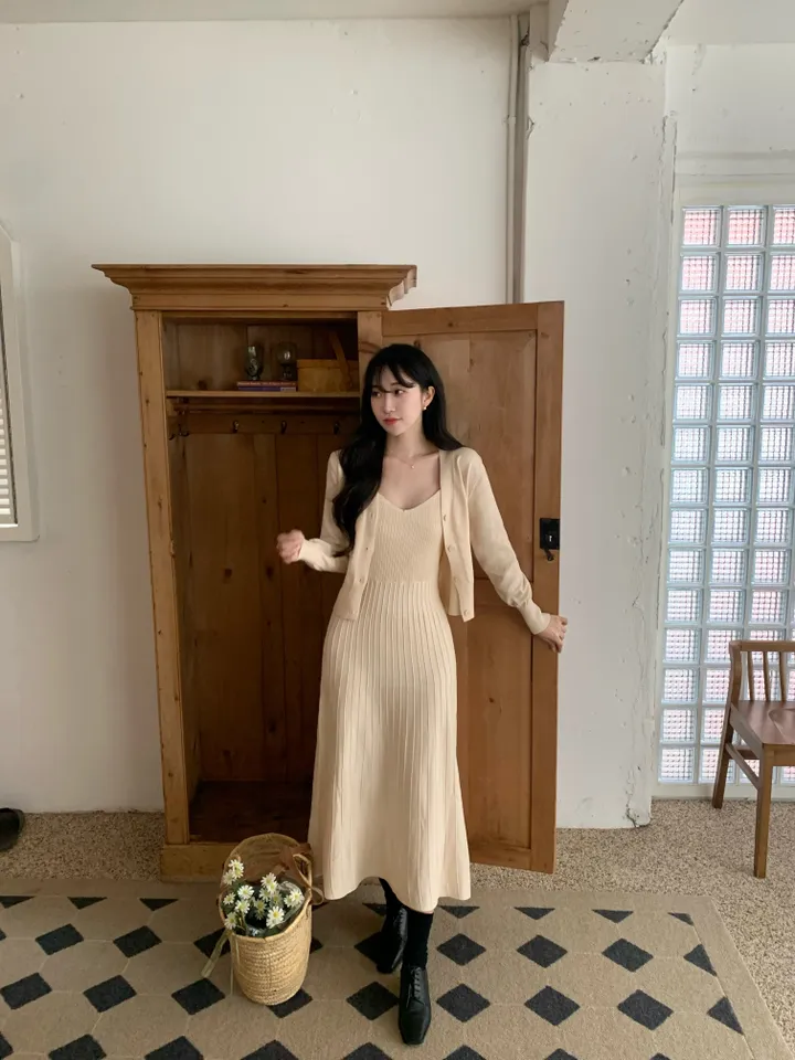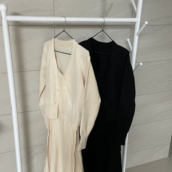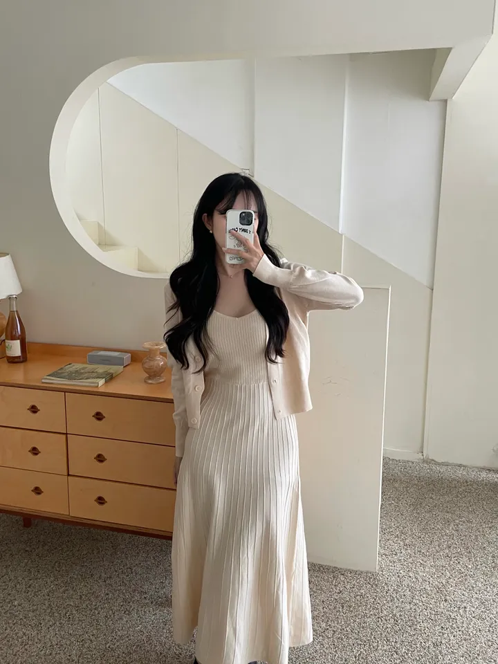 [SET] カーディガン+ノースリーブプリーツロングワンピースセットアップ