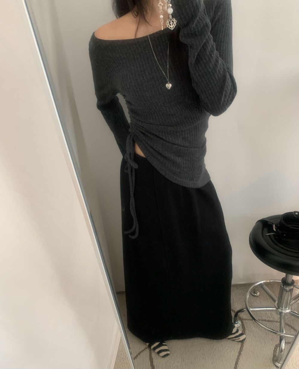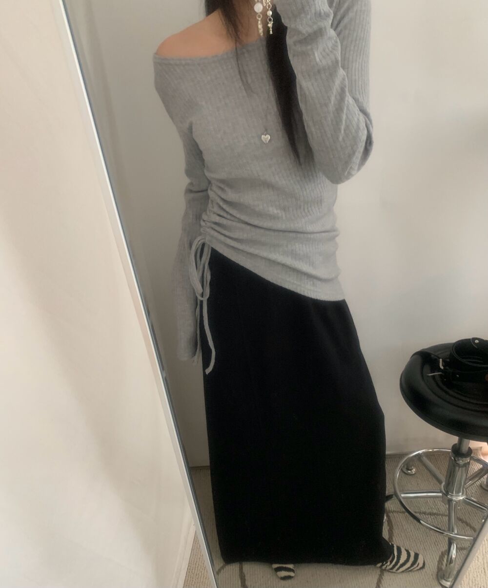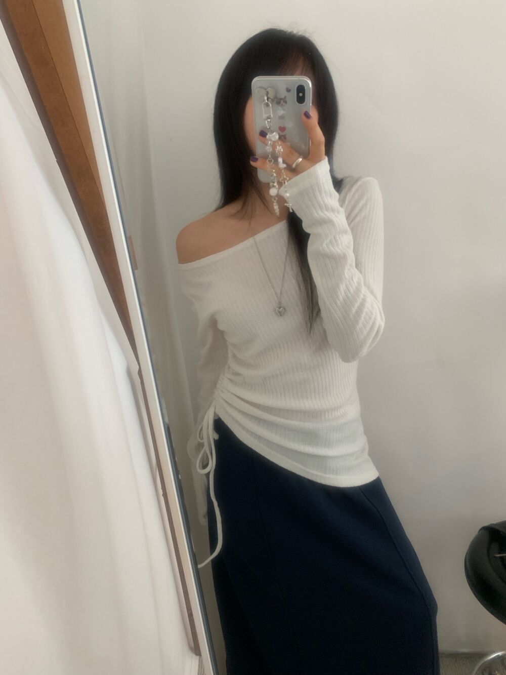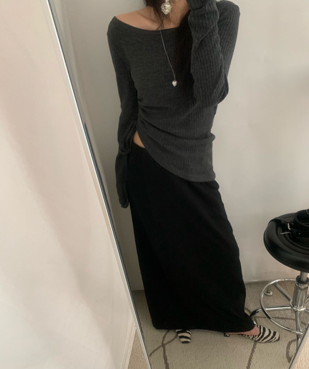 ボートネックリブ斜めストライプアシンメトリーシャーリングオフニット