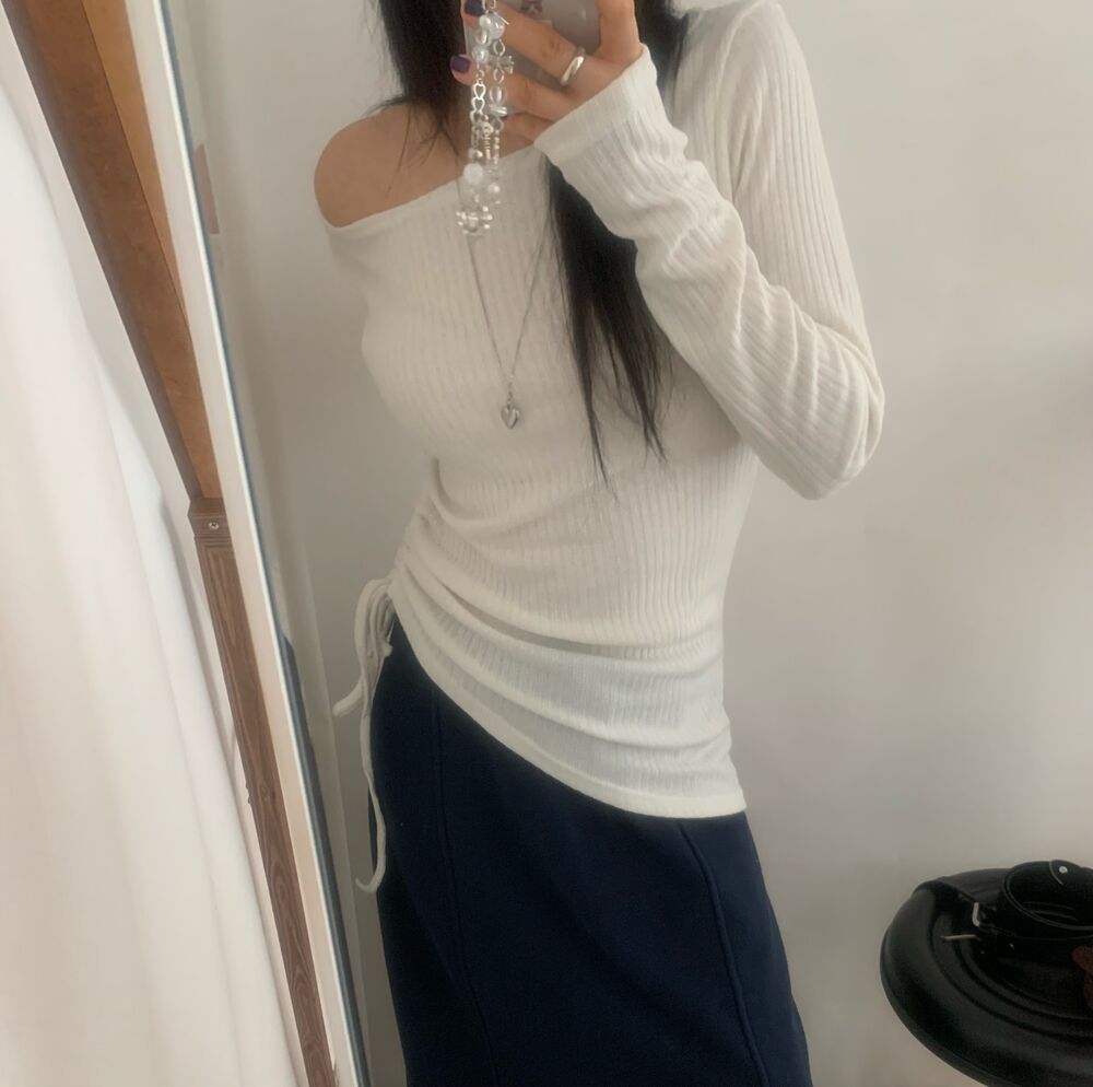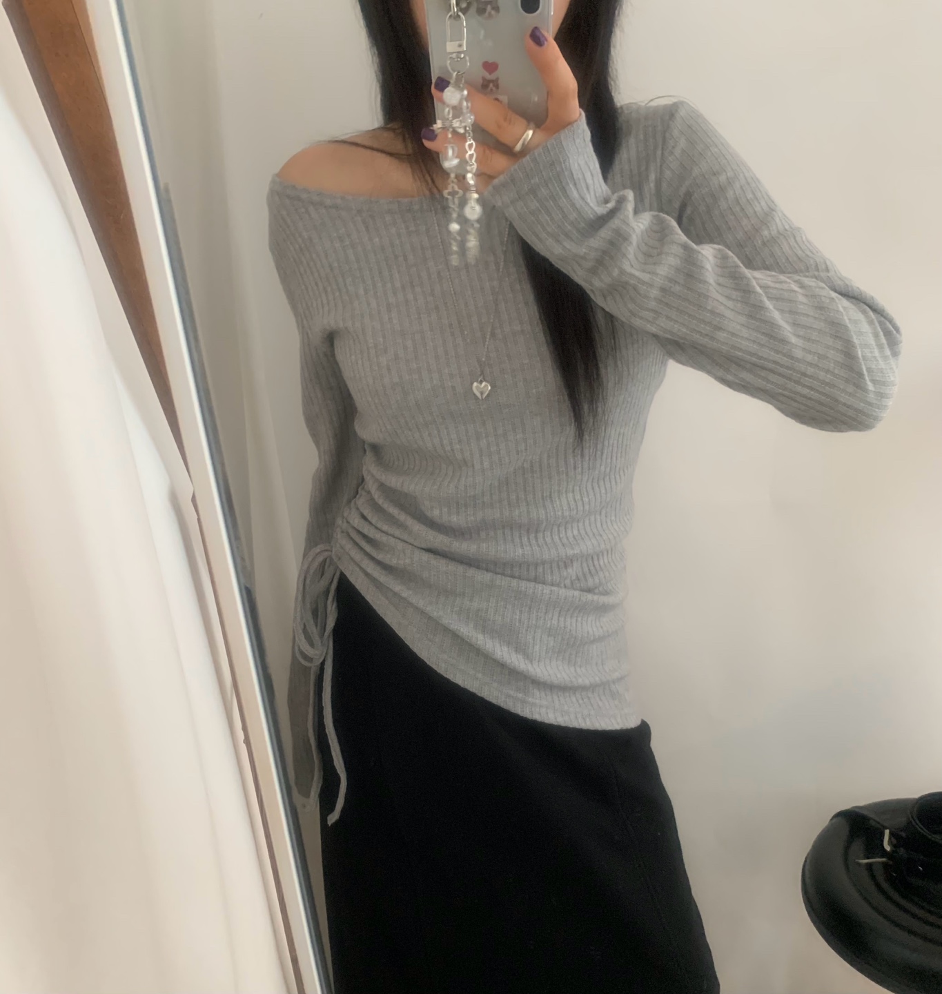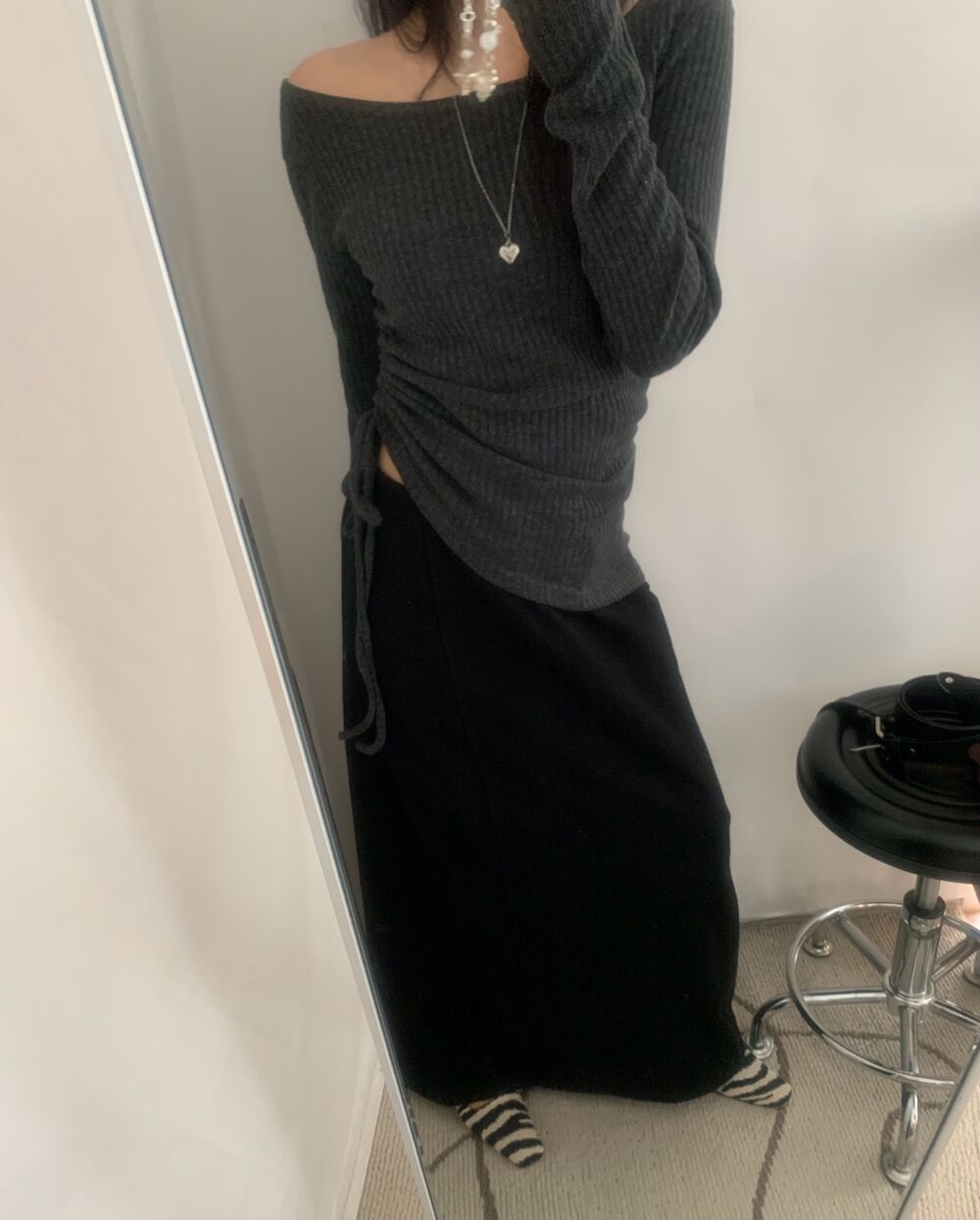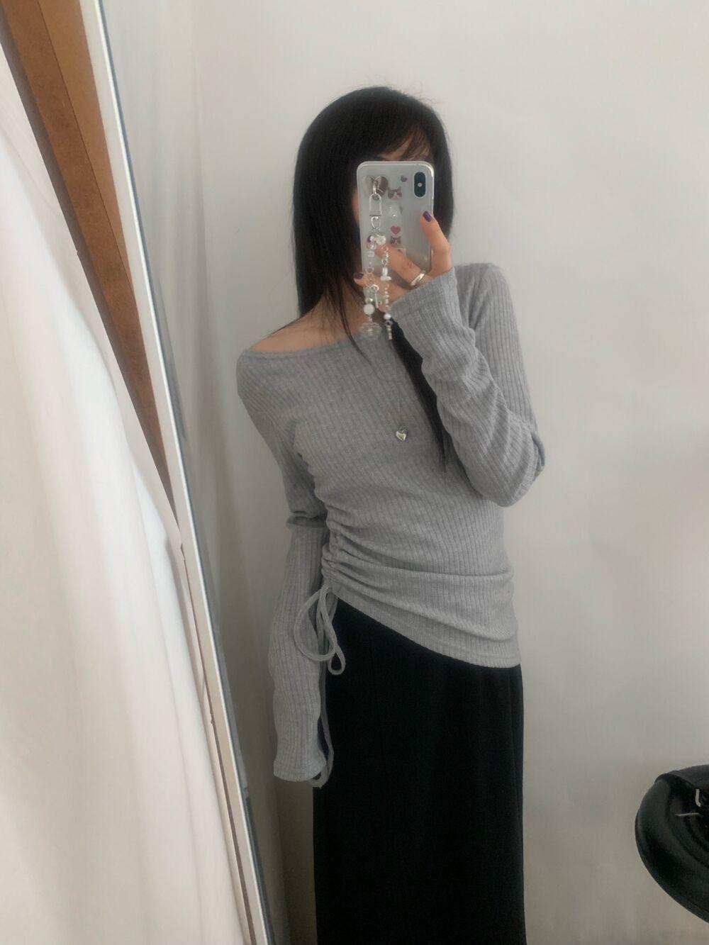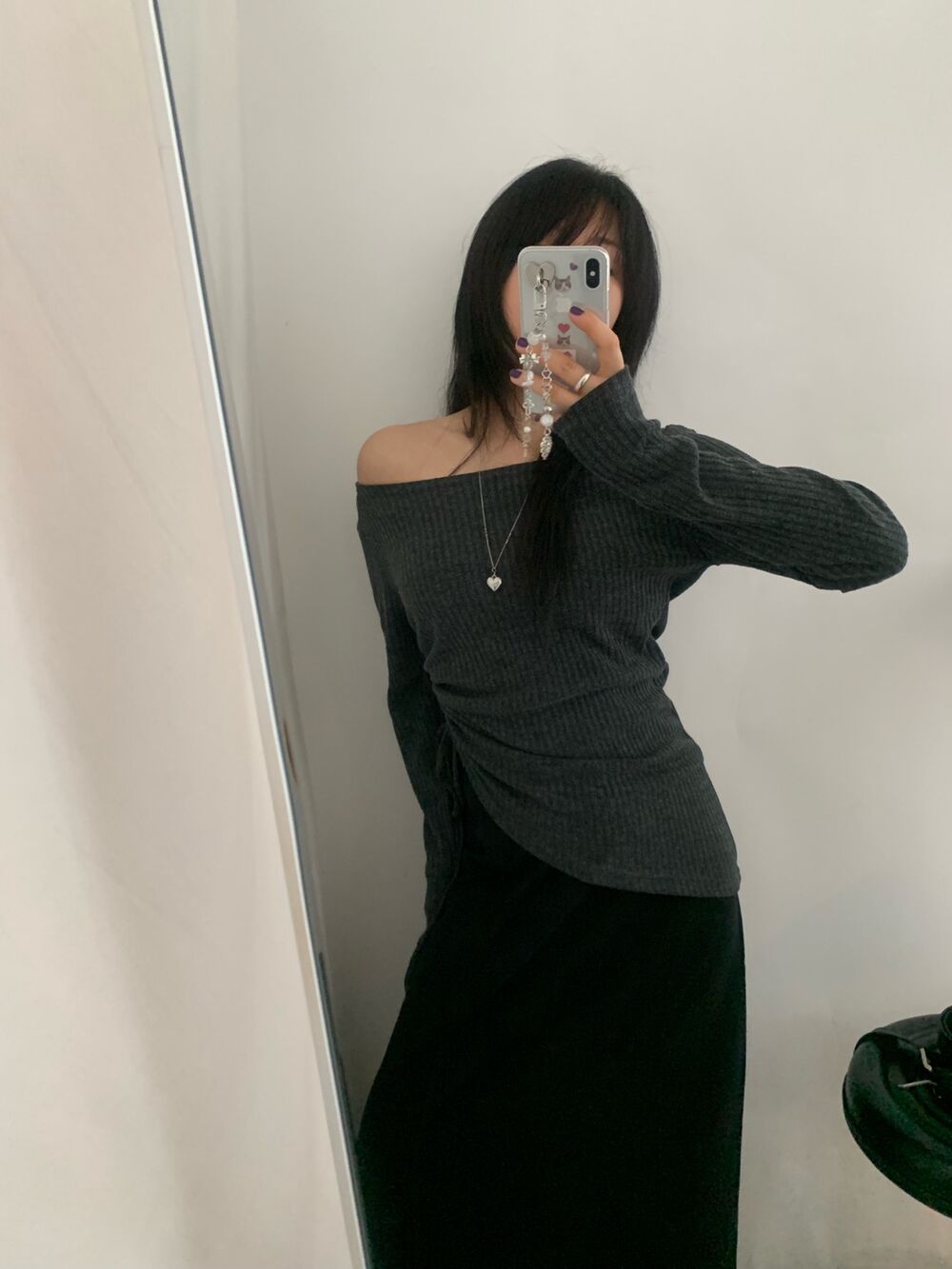 ボートネックリブ斜めストライプアシンメトリーシャーリングオフニット