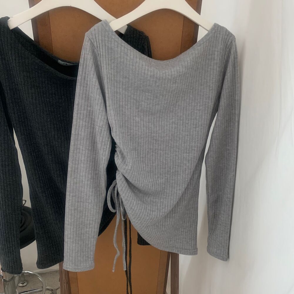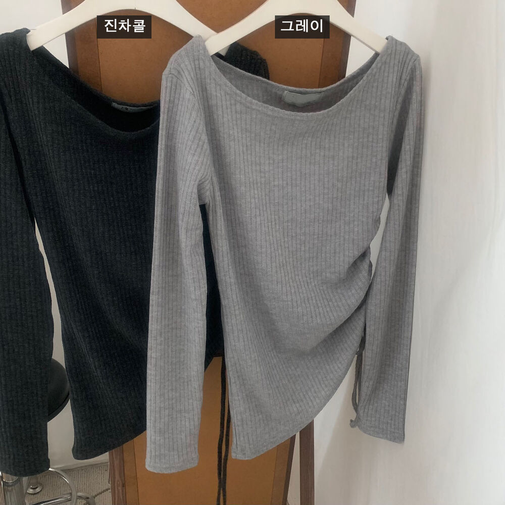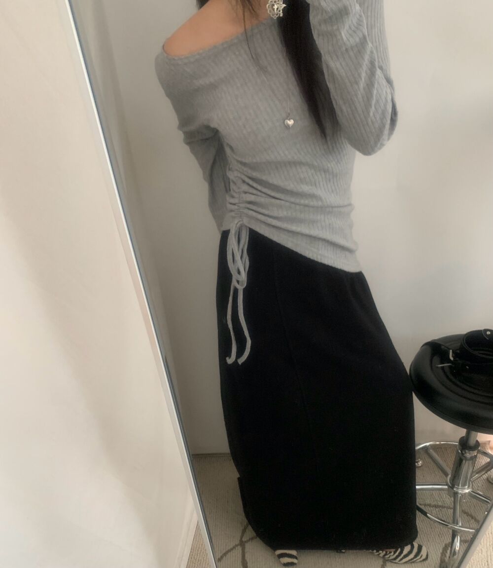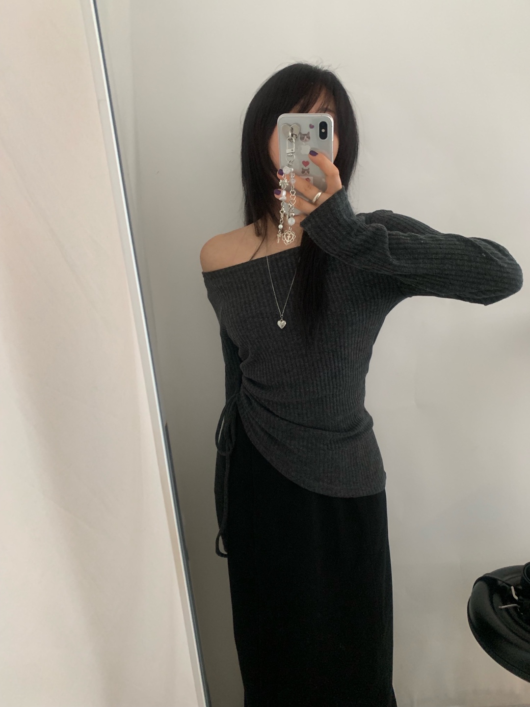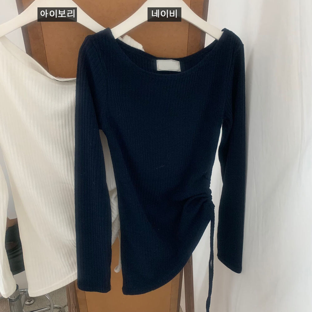 ボートネックリブ斜めストライプアシンメトリーシャーリングオフニット